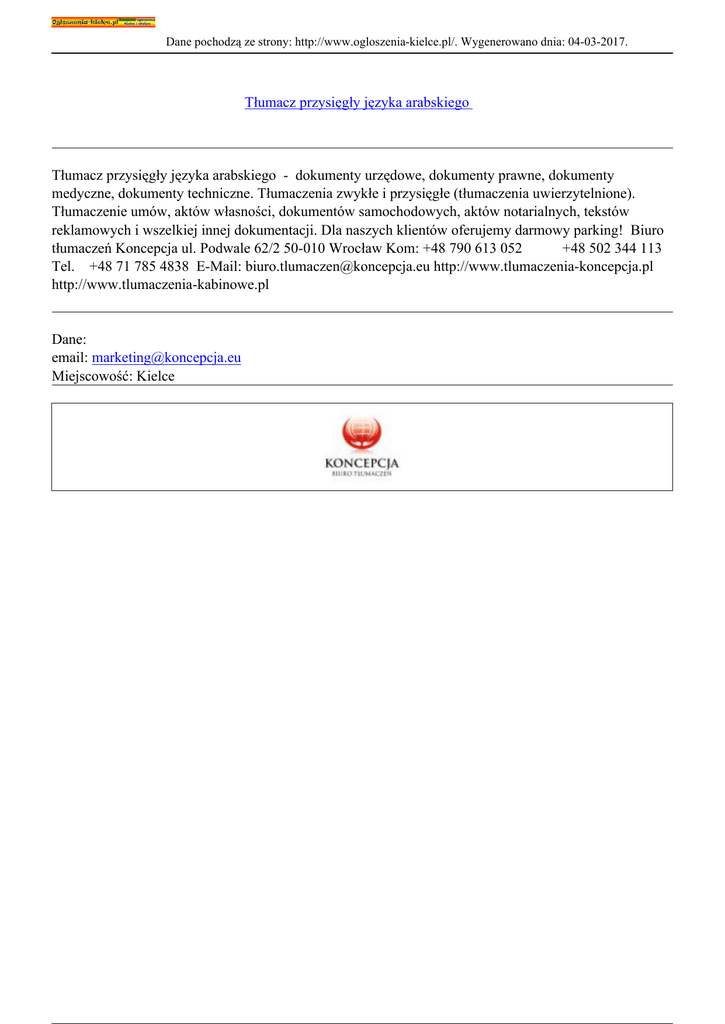 Dane pochodzą ze strony: http://www.ogloszenia-kielce.pl/. Wygenerowano dnia: 04-03-2017. Tłumacz przysięgły języka arabskiego Tłumacz przysięgły języka arabskiego - dokumenty urzędowe, dokumenty prawne, dokumenty medyczne, dokumenty techniczne. Tłumaczenia zwykłe i przysięgłe (tłumaczenia uwierzytelnione). Tłumaczenie umów, aktów własności, dokumentów samochodowych, aktów notarialnych, tekstów reklamowych i wszelkiej innej dokumentacji. Dla naszych klientów oferujemy darmowy parking! Biuro tłumaczeń Koncepcja ul. Podwale 62/2 50-010 Wrocław Kom: +48 790 613 052 +48 502 344 113 Tel. +48 71 785 4838 E-Mail: [email protected] http://www.tlumaczenia-koncepcja.pl http://www.tlumaczenia-kabinowe.pl Dane: email: [email protected] Miejscowość: Kielce