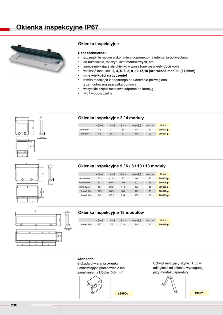 Okienka inspekcyjne IP67 Okienka inspekcyjne Dane techniczne: • szczególnie mocne wykonanie z odpornego na uderzenia poliwęglanu • do rozdzielnic, maszyn, szaf montażowych, etc. • samozamykające się okienko wyposażone we wkrety dociskowe • wielkość modułów: 2, 4, 5, 6, 8, 9 ,10,13,18 (szerokość modułu (17,5mm) • inne wielkości na życzenie! • ramka mocująca z odpornego na uderzenia poliwęglanu z zamontowaną uszczelką gumową • wszystkie części metalowe odporne na korozję • IP67 wodoszczelne a Okienka inspekcyjne 2 / 4 moduły 93 25 c a [mm] b [mm] c [mm] waga [g] pak. po: Nr kat. 2 moduły 49 27 36 51 40 900602-p 4 moduły 85 65 72 80 20 900604-p 72 60 36,50 b a Okienka inspekcyjne 5 / 6 / 8 / 10 / 13 moduły a [mm] b [mm] c [mm] waga [g] pak. po: Nr kat.. 5 modułów 103 41,5 90 90 20 900605-p 6 modułów 121 50,5 108 102 15 900606-p 8 modułów 157 68,5 144 126 15 900608-p 10 modułów 193 86,5 180 145 15 900610-p 13 modułów 247 113,5 234 180 10 900613-p 93 25 c b 72 60 36,50 b a Okienka inspekcyjne 18 modułów 93 25 18 modułów c a [mm] b [mm] c [mm] waga [g] pak. po: Nr kat. 337 105 324 245 12 900618-p 60 72 36,50 b b b Akcesoria: Blokada otwierania okienka umożliwiająca plombowanie lub zamykanie na kłódkę (40 mm) s9000g 236 Uchwyt mocujący szynę TH35 w odległości od okienka wymaganej przy montażu aparatury 19892 Okienka inspekcyjne IP54 Okienka inspekcyjne Dane techniczne: • szczególnie mocne wykonanie z odpornrgo na uderzenia poliwęglanu • do rozdzielnic, maszyn, szaf montażowych, etc. • samozamykające się okienko • wielkość modułów: od 4 do 18 modułów (szerokość modułu 17,5mm ) • kąt rozwarcia > 180° • ramka mocująca z odpornrgo na uderzenia poliwęglanu z zamontowaną uszczelką gumową • wszystkie części metalowe odporne na korozję • dla wiekszej ochrony, okienka zapakowane sa w folię ochronną • posiada element pomocniczy • stopień ochrony: IP54 Okienko inspekcyjne 4 moduły a [mm] b [mm] c [mm] waga [g] pak. po: Nr kat. 92 65 72 - - 9006504 Dostawa: z elementem pomocniczym okienka (kolor: czarny) Istnieje możliwość zamówienia oddzielnie 27 97 4 moduły a 31 ti0007s 60 72 c b Przykłady użycia elementu pomocniczego: Okienko inspekcyjne 6 / 8 / 9 / 10 / 11 / 12 modułów c [mm] waga [g] pak. po: Nr kat. 51 108 - - 9006506 8 modułów 164 69 144 - - 9006508 9 modułów 182 78 162 166 10 9006509 10 modułów 200 87 180 181 10 9006510 11 modułów 218 96 198 198 10 9006511 12 modułów 236 105 216 207 10 9006512 97 b [mm] 128 27 31 c uchwyt pomocniczy 60 72 a [mm] 6 modułów a b b Okienko inspekcyjne 13 / 14 modułów waga [g] pak. po: Nr kat. 253 41 73 233 223 10 9006513 14 modułów 272 41 82 252 232 10 9006514 mozliwość zamknięcia na kłódkę 31 d 60 72 13 modułów 27 97 a [mm] b [mm] c [mm] d [mm] a c Okienko inspekcyjne 18 modułów c 27 b [mm] c [mm] waga [g] pak. po: Nr kat. 344 105 324 299 10 9006518 31 c b b 72 a [mm] standardowo okienko otwiera się pod kątem 90° 97 a 60 18 modułów b b b możliwość otwarcia okienka pod katem 180° Connec tion to the futu re 237