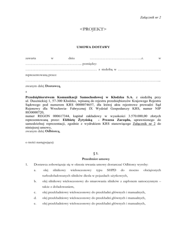 Załącznik nr 2 <PROJEKT> UMOWA DOSTAWY zawarta w dniu ……………………………………..r. w …………………….………………….. pomiędzy: …………………………………………………… z siedzibą w ……………………………… reprezentowaną przez: …………………………………………………………………………………………………... zwanym dalej Dostawcą, a Przedsiębiorstwem Komunikacji Samochodowej w Kłodzku S.A. z siedzibą przy ul. Dusznickiej 1, 57-300 Kłodzko, wpisaną do rejestru przedsiębiorców Krajowego Rejestru Sądowego pod numerem KRS 0000074657, dla której akta rejestrowe prowadzi Sąd Rejonowy dla Wrocławia- Fabrycznej IX Wydział Gospodarczy KRS, numer NIP 8830000720, numer REGON 000617344, kapitał zakładowy w wysokości 3.570.000,00 złotych reprezentowaną przez: Elżbietę Żytyńską - Prezesa Zarządu, uprawnionego do samodzielnej reprezentacji, zgodnie z wydrukiem KRS stanowiącego Załącznik nr 2 do niniejszej umowy, zwanym dalej Odbiorcą, o treści następującej: § 1. Przedmiot umowy 1. Dostawca zobowiązuje się w okresie trwania umowy dostarczać Odbiorcy wyroby: a. olej silnikowy wielosezonowy typu SHPD do mocno obciążonych turbodoładowanych silników diesla w pojazdach użytkowych, b. olej silnikowy wielosezonowy do smarowania silników z zapłonem samoczynnym – także z doładowaniem, c. olej przekładniowy wielosezonowy do przekładni głównych i manualnych, d. olej przekładniowy wielosezonowy do przekładni głównych i manualnych, e. olej przekładniowy wielosezonowy do przekładni głównych i manualnych, f. olej przekładniowy mineralny wielosezonowy do przekładni hydraulicznych i automatycznych skrzyń przekładniowych, g. olej sprężarkowy do stacjonarnych i przewoźnych sprężarek tłokowych i śrubowych, h. smar plastyczny – smar litowy do podwozi samochodowych zawierający dodatki uszlachetniające typu EP2, i. smar do układu centralnego smarowania; o specyfikacji, parametrach, klasie, gatunku i pochodzenia surowców oraz pojemności opakowań, określonych w Załączniku nr 3 będącym integralną częścią niniejszej umowy. 2. Dostawca oświadcza, że wyroby objęte umową posiadają normy i dopuszczenia spełniające wymogi jakościowe zalecane przez producentów autobusów i urządzeń eksploatowanych przez PKS w Kłodzku S.A. oraz do ich produkcji nie są wykorzystywane surowce, oleje, komponenty regenerowane. 3. Odbiorca dopuszcza możliwość dostawy wyrobów w trybie tzw. „zawieszonej akcyzy”. § 2. Dostawa i odbiór przedmiotu umowy 1. Wyroby będą dostarczane częściami, na podstawie każdorazowego zamówienia. 2. Termin dostawy, ilość i rodzaj wyrobów objętych zamówieniem zostaną ustalone przez Odbiorcę każdorazowo, stosownie do potrzeb Odbiorcy. Zamówienia będą składane w formie pisemnej, doręczane na adres e-mail…………………….. lub na numer faxu +48…………………………… 3. Dostawca zrealizuje dostawę w siedzibie Odbiorcy, w terminie nie dłuższym niż 3 dni robocze od daty złożenia przez Odbiorcę zamówienia. Odbiór zamówienia będzie następował za potwierdzeniem w formie pisemnej pod rygorem nieważności. 4. Odbiorca może odmówić odbioru przedmiotu umowy, jeżeli przedmiot umowy nie spełnia wymogów określonych niniejszą umową oraz Załącznikiem nr 3. Brak odbioru przedmiotu zamówienia przez Odbiorcę powoduje zwłokę Dostawcy. 5. Uprawnionymi do złożenia, odbioru lub odmowy odbioru zamówienia są upoważnieni pracownicy Odbiorcy: a) ……………………, tel. ……………………, mail ……………………., b) ……………………, tel. ……………………, mail …………………….. 6. Wyroby będą dostarczane w oryginalnych, wytrawionych i plombowanych przez producenta opakowaniach z wyraźnym i czytelnym oznaczeniem wyrobu, rodzaju, normy, wagi brutto i tary wraz z jego świadectwem jakości, dokumentem mieszalności, których wartość wliczona jest w cenę wyrobu. Opakowania nie podlegają zwrotowi. 7. Koszt transportu i ubezpieczenia wyrobów na czas transportu obciążają Dostawcę. § 3. Wynagrodzenie i warunki płatności 1. Odbiorca zobowiązuje się zapłacić Dostawcy za wykonanie poszczególnych dostaw, wyłącznie za rzeczywistą ilość zamówionych wyrobów według cen jednostkowych wskazanych w ofercie Dostawcy, która stanowi integralną część niniejszej umowy (Załącznik nr 4). 2. Wynagrodzenie wypłacane będzie, w ten sposób, że zapłata za prawidłowo dostarczone zamówienie następować będzie w formie przelewu na rachunek bankowy Dostawcy nr………………… każdorazowo po odbiorze zamówienia przez Odbiorcę w całości, nie wcześniej niż w terminie 14 dni od dnia otrzymania przez Odbiorcę prawidłowo wystawionej przez Dostawcę faktury VAT wraz z protokołem zdawczo-odbiorczym. 3. Warunkiem dokonania zapłaty, o której mowa w pkt 2, będzie dołączenie przez Dostawcę podpisanego przez Odbiorcę protokołu zdawczo-odbiorczego stwierdzającego kompletność i jakość zamówionych wyrobów. 4. Strony postanawiają, iż za datę dokonania płatności przelewem uznaje się dzień obciążenia rachunku bankowego Odbiorcy. 5. Do cen netto zostanie doliczony należny podatek VAT obowiązujący w chwili wystawienia faktury VAT. § 4. Termin obowiązywania Dostawy będące przedmiotem umowy realizowane będą stosownie do zapotrzebowania Odbiorcy przez jeden rok od dnia zawarcia niniejszej umowy tj. do dnia …………………………r. § 5. Kary umowne 1. Odbiorca zastrzega sobie od Dostawcy karę umowną w razie: a. dostarczenia wyrobu z opóźnieniem – 1 % wartości opóźnionej dostawy za każdy dzień opóźnienia; b. dostarczenia wyrobu ze zwłoką – 2 % wartości będącej w zwłoce dostawy; c. odstąpienia przez Odbiorcę od umowy z przyczyn leżących po stronie Dostawcy w wysokości 5.0