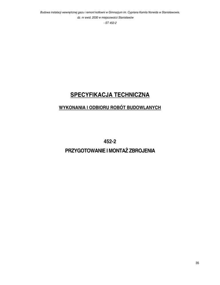 Budowa instalacji wewnętrznej gazu i remont kotłowni w Gimnazjum im. Cypriana Kamila Norwida w Stanisławowie, dz. nr ewid. 2030 w miejscowości Stanisławów - ST 452-2 SPECYFIKACJA TECHNICZNA WYKONANIA I ODBIORU ROBÓT BUDOWLANYCH 452-2 PRZYGOTOWANIE I MONTAŻ ZBROJENIA 35 Budowa instalacji wewnętrznej gazu i remont kotłowni w Gimnazjum im. Cypriana Kamila Norwida w Stanisławowie, dz. nr ewid. 2030 w miejscowości Stanisławów - ST 452-2 SPIS TREŚCI 1. WSTĘP ..............................................................................................................................................................................................37 1.1. Przedmiot SST ..........................................................................................................................................................................37 1.2. Zakres stosowania ....................................................................................................................................................................37 1.3. Określenia podstawowe ............................................................................................................................................................37 1.4. Zakres robót objętych SST ........................................................................................................................................................37 1.5.Ogólne wymagania dotyczące robót ..........................................................................................................................................37 2. MATERIAŁY ......................................................................................................................................................................................37 2.1. Wymagania ogólne ....................................................................................................................................................................37 2.2. Materiały potrzebne do wykonania robót...................................................................................................................................38 3. SPRZĘT ............................................................................................................................................................................................39 3.1. Wymagania ogólne ....................................................................................................................................................................39 3.2. Sprzęt do wykonywania robót ...................................................................................................................................................39 4. TRANSPORT ....................................................................................................................................................................................39 4.1. Wymagania ogólne ....................................................................................................................................................................39 4.2. Transport materiałów.................................................................................................................................................................39 5. WYKONANIE ROBÓT ......................................................................................................................................................................39 5.1. Wymagania ogólne ....................................................................................................................................................................39 5.2. Organizacja robot ......................................................................................................................................................................39 5.3. Przygotowanie zbrojenia ...........................................................................................................................................................39 5.4. Montaż zbrojenia .......................................................................................................................................................................40 6. KONTROLA JAKOŚCI ROBÓT .......................................................................................................................................................41 6.1. Wymagania ogólne ....................................................................................................................................................................41 6.2. Badania w czasie wykonywania robót .......................................................................................................................................41 7. OBMIAR ROBÓT ..............................................................................................................................................................................41 8. ODBIÓR ROBÓT ..............................................................................................................................................................................41 8.1. Ogólne zasady odbioru robót. ...................................................................................................................................................41 8.2. Odbiór robót zanikających i ulegających zakryciu .....................................................................................................................41 8.3. Wymagania przy odbiorze .........................................................................................................................................................42 9. PODSTAWA PŁATNOŚCI ................................................................................................................................................................42 10. PRZEPISY ZWIĄZANE ........................