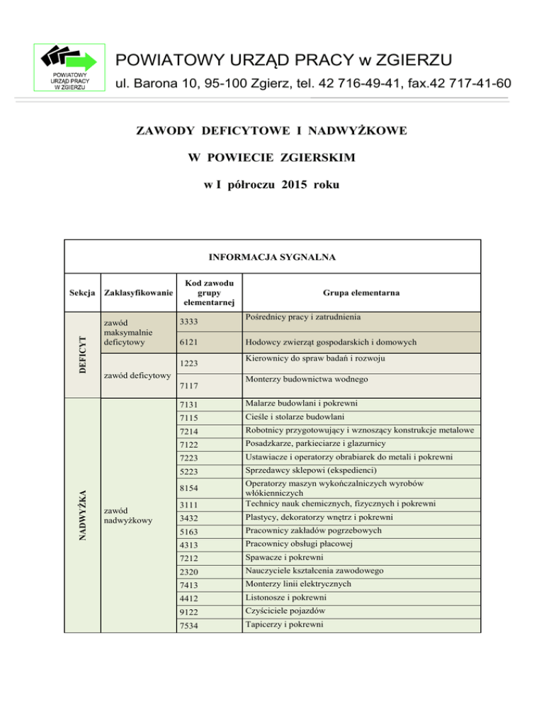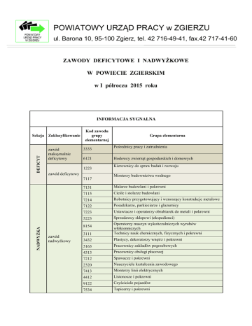 POWIATOWY URZĄD PRACY w ZGIERZU ul. Barona 10, 95-100 Zgierz, tel. 42 716-49-41, fax.42 717-41-60 ZAWODY DEFICYTOWE I NADWYŻKOWE W POWIECIE ZGIERSKIM w I półroczu 2015 roku INFORMACJA SYGNALNA DEFICYT Sekcja Zaklasyfikowanie zawód maksymalnie deficytowy Kod zawodu grupy elementarnej 3333 6121 1223 zawód deficytowy NADWYŻKA 7117 Pośrednicy pracy i zatrudnienia Hodowcy zwierząt gospodarskich i domowych Kierownicy do spraw badań i rozwoju Monterzy budownictwa wodnego 7131 Malarze budowlani i pokrewni 7115 Cieśle i stolarze budowlani 7214 Robotnicy przygotowujący i wznoszący konstrukcje metalowe 7122 Posadzkarze, parkieciarze i glazurnicy 7223 Ustawiacze i operatorzy obrabiarek do metali i pokrewni 5223 Sprzedawcy sklepowi (ekspedienci) 3111 Operatorzy maszyn wykończalniczych wyrobów włókienniczych Technicy nauk chemicznych, fizycznych i pokrewni 3432 Plastycy, dekoratorzy wnętrz i pokrewni 5163 Pracownicy zakładów pogrzebowych 4313 Pracownicy obsługi płacowej 7212 Spawacze i pokrewni 2320 Nauczyciele kształcenia zawodowego 7413 Monterzy linii elektrycznych 4412 Listonosze i pokrewni 9122 Czyściciele pojazdów 7534 Tapicerzy i pokrewni 8154 zawód nadwyżkowy Grupa elementarna 2631 3144 Rolnicy produkcji roślinnej i zwierzęcej pracujący na własne potrzeby Operatorzy innych maszyn i urządzeń przetwórczych gdzie indziej niesklasyfikowani Technicy technologii żywności 5419 Pracownicy usług ochrony gdzie indziej niesklasyfikowani 3431 Fotografowie 7313 Jubilerzy, złotnicy i pokrewni 7314 Ceramicy i pokrewni 6330 8189 zawód maksymalnie nadwyżkowy Ekonomiści 3522 Kierownicy w instytucjach usług wyspecjalizowanych gdzie indziej niesklasyfikowani Operatorzy urządzeń telekomunikacyjnych 9411 Pracownicy przygotowujący posiłki typu fast food 7312 Monterzy instrumentów muzycznych 5321 Pomocniczy personel medyczny 1349