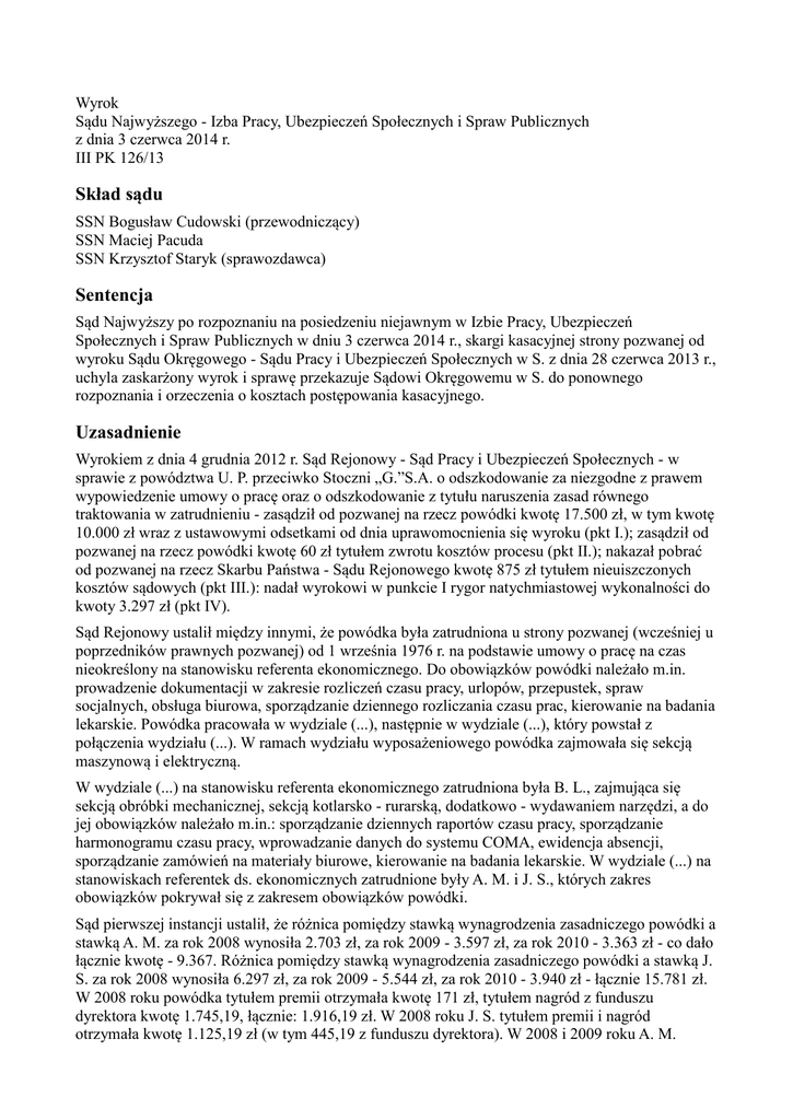 Wyrok Sądu Najwyższego - Izba Pracy, Ubezpieczeń Społecznych i Spraw Publicznych z dnia 3 czerwca 2014 r. III PK 126/13 Skład sądu SSN Bogusław Cudowski (przewodniczący) SSN Maciej Pacuda SSN Krzysztof Staryk (sprawozdawca) Sentencja Sąd Najwyższy po rozpoznaniu na posiedzeniu niejawnym w Izbie Pracy, Ubezpieczeń Społecznych i Spraw Publicznych w dniu 3 czerwca 2014 r., skargi kasacyjnej strony pozwanej od wyroku Sądu Okręgowego - Sądu Pracy i Ubezpieczeń Społecznych w S. z dnia 28 czerwca 2013 r., uchyla zaskarżony wyrok i sprawę przekazuje Sądowi Okręgowemu w S. do ponownego rozpoznania i orzeczenia o kosztach postępowania kasacyjnego. Uzasadnienie Wyrokiem z dnia 4 grudnia 2012 r. Sąd Rejonowy - Sąd Pracy i Ubezpieczeń Społecznych - w sprawie z powództwa U. P. przeciwko Stoczni „G.”S.A. o odszkodowanie za niezgodne z prawem wypowiedzenie umowy o pracę oraz o odszkodowanie z tytułu naruszenia zasad równego traktowania w zatrudnieniu - zasądził od pozwanej na rzecz powódki kwotę 17.500 zł, w tym kwotę 10.000 zł wraz z ustawowymi odsetkami od dnia uprawomocnienia się wyroku (pkt I.); zasądził od pozwanej na rzecz powódki kwotę 60 zł tytułem zwrotu kosztów procesu (pkt II.); nakazał pobrać od pozwanej na rzecz Skarbu Państwa - Sądu Rejonowego kwotę 875 zł tytułem nieuiszczonych kosztów sądowych (pkt III.): nadał wyrokowi w punkcie I rygor natychmiastowej wykonalności do kwoty 3.297 zł (pkt IV). Sąd Rejonowy ustalił między innymi, że powódka była zatrudniona u strony pozwanej (wcześniej u poprzedników prawnych pozwanej) od 1 września 1976 r. na podstawie umowy o pracę na czas nieokreślony na stanowisku referenta ekonomicznego. Do obowiązków powódki należało m.in. prowadzenie dokumentacji w zakresie rozliczeń czasu pracy, urlopów, przepustek, spraw socjalnych, obsługa biurowa, sporządzanie dziennego rozliczania czasu prac, kierowanie na badania lekarskie. Powódka pracowała w wydziale (...), następnie w wydziale (...), który powstał z połączenia wydziału (...). W ramach wydziału wyposażeniowego powódka zajmowała się sekcją maszynową i elektryczną. W wydziale (...) na stanowisku referenta ekonomicznego zatrudniona była B. L., zajmująca się sekcją obróbki mechanicznej, sekcją kotlarsko - rurarską, dodatkowo - wydawaniem narzędzi, a do jej obowiązków należało m.in.: sporządzanie dziennych raportów czasu pracy, sporządzanie harmonogramu czasu pracy, wprowadzanie danych do systemu COMA, ewidencja absencji, sporządzanie zamówień na materiały biurowe, kierowanie na badania lekarskie. W wydziale (...) na stanowiskach referentek ds. ekonomicznych zatrudnione były A. M. i J. S., których zakres obowiązków pokrywał się z zakresem obowiązków powódki. Sąd pierwszej instancji ustalił, że różnica pomiędzy stawką wynagrodzenia zasadniczego powódki a stawką A. M. za rok 2008 wynosiła 2.703 zł, za rok 2009 - 3.597 zł, za rok 2010 - 3.363 zł - co dało łącznie kwotę - 9.367. Różnica pomiędzy stawką wynagrodzenia zasadniczego powódki a stawką J. S. za rok 2008 wynosiła 6.297 zł, za rok 2009 - 5.544 zł, za rok 2010 - 3.940 zł - łącznie 15.781 zł. W 2008 roku powódka tytułem premii otrzymała kwotę 171 zł, tytułem nagród z funduszu dyrektora kwotę 1.745,19, łącznie: 1.916,19 zł. W 2008 roku J. S. tytułem premii i nagród otrzymała kwotę 1.125,19 zł (w tym 445,19 z funduszu dyrektora). W 2008 i 2009 roku A. M. tytułem nagrody otrzymała po 250 złotych. W roku 2009 powódka nie otrzymała premii ani nagrody. W 2009 roku J. S. otrzymała tytułem premii i nagród 950 zł (w tym 750 zł z funduszu dyrektora). W 2010 roku powódka, J. S., A. M. nie otrzymały nagrody ani premii. Sąd Rejonowy ustalił, że w okresie zatrudnienia powódki nie było pisemnych zastrzeżeń do jej pracy. W dniu 10 sierpnia 2010 r. pracodawca wręczył powódce oświadczenie o rozwiązaniu umowy o pracę z zachowaniem trzymiesięcznego okresu wypowiedzenia. Przyczynę rozwiązania stosunku pracy wskazano w zmniejszeniu zatrudnienia z przyczyn ekonomicznych. Oświadczenie o rozwiązaniu z powódką umowy o pracę wręczył jej K. Z. (przełożony powódki), nie wyjaśnił powódce przyczyn doboru jej do zwolnienia. Stanowisko powódki zostało zlikwidowane, a jej obowiązki przejęła B. L. Sąd pierwszej instancji uznał, że obydwa dochodzone przez powódkę w sprawie roszczenia są zasadne. W zakresie pierwszego z nich - żądania odszkodowania za niezgodne z prawem wypowiedzenie umowy o pracę (art. 45 § 1 KPC) Sąd pierwszej instancji stwierdził, że strona pozwana nie przedstawiła przekonywających kryteriów w oparciu, o które to właśnie powódkę wytypowano do zwolnienia. Zdaniem Sądu pierwszej instancji pracodawca nie dokonał wszechstronnego porównania poziomu pracy świadczonej przez powódkę i pozostałe osoby zatrudnione na analogicznych stanowiskach. Zakresy obowiązków powódki pokrywały się z zakresami obowiązków A. M. i J. S. Pomimo tego, przy podejmowaniu decyzji o zwolnieniu powódki pracodawca nie dokonał porównania pracy świadczonej przez powódkę z pracą A. M., czy J. S.; poprzestał jedynie na przyjęciu opinii K. Z., który oceniał pracę powódki oraz jej sytuację osobistą jedynie w odniesieniu do B. L. Sąd pierwszej instancji wskazał, że w toku procesu strona pozwana podnosiła, że powódka została wytypowana do zwolnienia, ponieważ nie radziła sobie z obsługą komputera, opóźniała się z wprowadzaniem raportów czasu pracy do systemu, nieprawidłowo współpracowała z mistrzami, posiadała ponadto bardzo dobrą sytuację rodzinną i prawo do świadczenia przedemerytalnego. Według Sądu pierwszej instancji materiał dowodowy sprawy nie dawał podstaw do przyjęcia, że powódka świadczyła pracę niższej jakości niż J. S. i A. M. Zarzuty K. Z. poza nieterminowym wprowadzaniem raportów czasu pracy do systemu ni