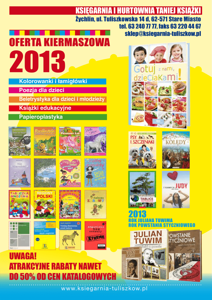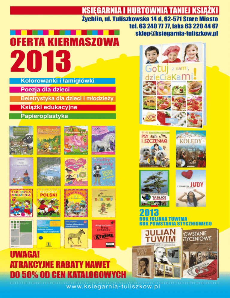 KSIĘGARNIA I HURTOWNIA TANIEJ KSIĄŻKI Żychlin, ul. Tuliszkowska 14 d, 62-571 Stare Miasto tel. 63 240 77 77, faks 63 220 44 67 [email protected] OFERTA KIERMASZOWA 2013 Kolorowanki i łamigłówki Poezja dla dzieci Beletrystyka dla dzieci i młodzieży Książki edukacyjne Papieroplastyka 2013 ROK JULIANA TUWIMA ROK POWSTANIA STYCZNIOWEGO UWAGA! ATRAKCYJNE RABATY NAWET DO 50% OD CEN KATALOGOWYCH www.ksieg a r n i a - t u l i s z kow. p l P/SP „Malowanki pirata Antoniego” Niezwykłe kolorowanki, które idealnie nadają się dla dzieci w każdym wieku. Dodatkową atrakcją są kolorowe naklejki, które podpowiedzą dziecku, w jaki sposób pomalować postaci. NOWOŚĆ 4,90 1,90 Malowanki pirata Antoniego Wydawnictwo PRINTEX Oprawa: miękka Format: A4 Liczba stron: 16 P/SP Seria „Pszczółka Maja” NOWOŚĆ Znana i lubiana w ponad 50 krajach Pszczółka Maja powraca na ekrany kanału Mini Mini. Wraz z serialem wydawca udostępnia dzieciom serię książeczek o świecie ciekawskiej Pszczółki Mai. Poznajemy mieszkańców traw, ich zwyczaje oraz problemy, które, jak się okazuje, niewiele różnią się od ludzkich. 4,99 2,10 4,99 2,10 4,99 2,10 Pszczółka Maja. Kolorowanki i ćwiczenia (1) Pszczółka Maja. Łamigłówki i kolorowanki (2) Pszczółka Maja. Zgadywanki i kolorowanki (3) Wydawnictwo Media Service Zawada Sp. z.o.o. Oprawa: miękka Format: A4 Liczba stron: 36 P/SP Wydawnictwo Media Service Zawada Sp. z.o.o. Oprawa: miękka Format: A4 Liczba stron: 36 Wydawnictwo Media Service Zawada Sp. z.o.o. Oprawa: miękka Format: A4 Liczba stron: 36 „Wesołe gry i zabawy” Zeszyt zawierający wiele gier, zabaw i łamigłówek w formie wesołych obrazków. Każda zabawa opatrzona jest krótkim poleceniem, na końcu zaś znajdują się prawidłowe odpowiedzi. NOWOŚĆ 5,10 2,90 Wesołe gry i zabawy dla dzieci w wieku 5-12 lat (zeszyt 2) Wydawnictwo PRINTEX Oprawa: miękka Format: A4 Liczba stron: 40 2 www.ksieg a r n i a - t u l i s z kow. p l P/SP „Magiczne kolorowanki” „Wróżka Emilia wyczarowuje gwiazdki. Ile widzisz gwiazdek na obrazku? Kapitan Baryłka przed wyruszeniem w rejs sprawdza zapasy. Wpisz w puste pole wynik dodawania. Połącz punkty i pokoloruj obrazek.” To tylko niektóre zadania z tej niezwykłej książki przeznaczonej dla najmłodszych Czytelników. 5,90 3,20 Magiczne kolorowanki Wydawnictwo Twoje Książki A. Święcki Oprawa: miękka Format: A4 Liczba stron: 32 Seria „Zwierzaczki cudaczki” P/SP Seria kolorowanek dla najmłodszych. Na jednej stronie znajduje się obrazek do pokolorowania, na drugiej zaś pokolorowany, jako podpowiedź dla maluchów, jak kolorowanka może wyglądać. 3,00 1,50 3,00 1,50 Hipopotam Kangurek 3,00 1,50 3,00 1,50 Wydawnictwo Pasja Oprawa: miękka Format: A5 Liczba stron: 16 Wydawnictwo Pasja Oprawa: miękka Format: A5 Liczba stron: 16 Ślimaczek Piesek Wydawnictwo Pasja Oprawa: miękka Format: A5 Liczba stron: 16 Wydawnictwo Pasja Oprawa: miękka Format: A5 Liczba stron: 16 „Wesołe podróżowanie” 3,00 1,50 Niedźwiadek Wydawnictwo Pasja Oprawa: miękka Format: A5 Liczba stron: 16 3,00 1,50 Świnka Wydawnictwo Pasja Oprawa: miękka Format: A5 Liczba stron: 16 P/SP Wystarczy dodać odrobinę koloru, aby stworzyć wesołe, kolorowe obrazki. Książka zawiera kolorowanki, gry i zabawy, które pokażą Wam różne miejsca, które można odwiedzić. 9,90 4,90 Wesołe podróżowanie Wydawnictwo Book House Oprawa: miękka Format: A4 Liczba stron: 32 www.ksie g a r n i a - t u l i s z kow. p l 3 SP „Wesołe zadania z czytania...” NOWOŚĆ Wesołe zadania to seria trzech książek adresowanych do uczniów klas 1-3. Zamieszczono w niej wiele ciekawych zadań z języka polskiego, matematyki, przyrody i sztuki. Poprzez kolorowanie i dorysowanie wskazanych elementów dziecko ćwiczy czytanie ze zrozumieniem, poznaje litery, głoski i sylaby. Dzięki rysunkom i zróżnicowanym zadaniom nauka staje się niezapomnianą przygodą. 6,90 4,90 6,90 4,90 6,90 4,90 Wesołe zadania z czytania... Klasa 1 Wesołe zadania z czytania... Klasa 2 Wesołe zadania z czytania... Klasa 3 W. Czekalewska, Wydawnictwo IBIS Oprawa: miękka Format: A4 Liczba stron: 48 W. Czekalewska, Wydawnictwo IBIS Oprawa: miękka Format: A4 Liczba stron: 48 SP „Tabliczka mnożenia” W. Czekalewska, Wydawnictwo IBIS Oprawa: miękka Format: A4 Liczba stron: 48 NOWOŚĆ Mnożenie nie jest trudne, a może być doskonałą zabawą… Tabliczka mnożenia to książka, z którą nie sposób się nudzić. W matematycznych zmaganiach będą wam towarzyszyć bajkowe postaci, które przygotowały wiele zadań…, m.in. kolorowanie obrazków, uzupełnianie grafów czy poszukiwanie drogi w matematycznym labiryncie. 5,40 4,90 Tabliczka mnożenia SP W. Czekalewska, Wydawnictwo IBIS Oprawa: miękka Format: A4 Liczba stron: 48 „Regiony Polski” NOWOŚĆ Regiony Polski to książka, z którą nie sposób się nudzić. Rozwiązując zadania i rebusy można nie tylko sprawdzić swoje wiadomości, ale również doskonale się bawić. 5,40 4,90 Regiony Polski W. Czekalewska, Wydawnictwo IBIS Oprawa: miękka Format: A4 Liczba stron: 48 4 www.ksieg a r n i a - t u l i s z kow. p l „Ćwiczenia ortograficzne z zebrą” P/SP Seria książeczek edukacyjnych, dzięki którym dzieci poprzez rozwiązywanie ćwiczeń utrwalą wiedzę z zakresu ortografii i interpunkcji na poziomie poszczególnych klas szkoły podstawowej. 4,10 2,90 4,10 2,90 Ćwiczenia ortograficzne z zebrą. Klasa II Ćwiczenia ortograficzne z zebrą. Klasa I Wydawnictwo IBIS Oprawa: miękka Format: A4 Liczba stron: 16 Wydawnictwo IBIS Oprawa: miękka Format: A4 Liczba stron: 16 4,10 2,90 Ćwiczenia ortograficzne z zebrą. Klasa III Wydawnictwo IBIS Oprawa: miękka Format: A4 Liczba stron: 16 „Dom. Polska. Świat” P/SP 16 bogato ilustrowanych testów kompetencji z kluczami odpowiedzi. Najlepszy sposób, by już w klasach początkowych oswoić dzieci z formą testu, do którego przystąpią przed zakończeniem 
