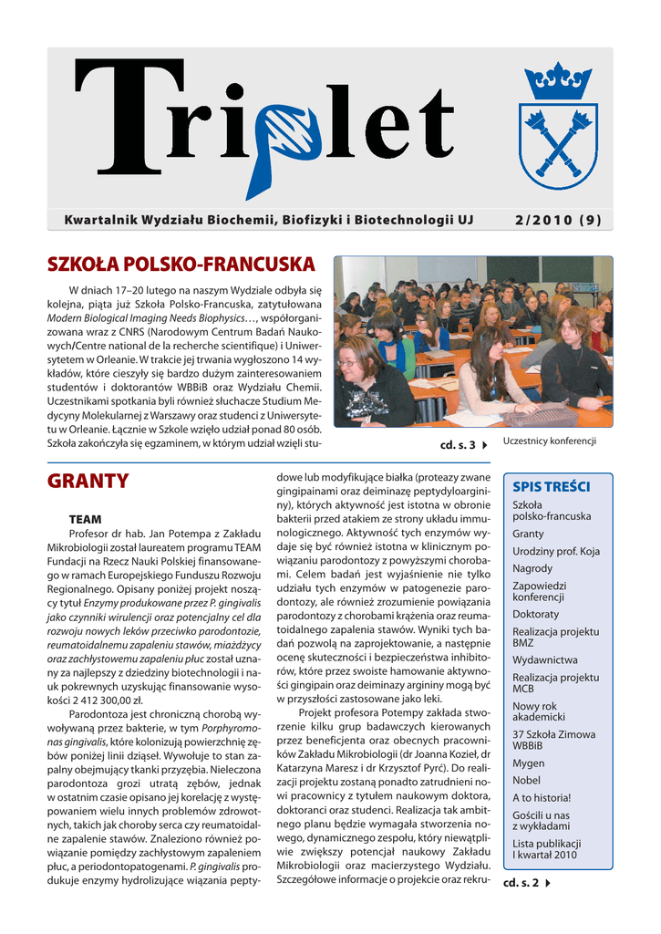 Kwartalnik Wydziału Biochemii, Biofizyki i Biotechnologii UJ 2/2010 (9) SZKOŁA POLSKO-FRANCUSKA W dniach 17–20 lutego na naszym Wydziale odbyła się kolejna, piąta już Szkoła Polsko-Francuska, zatytułowana Modern Biological Imaging Needs Biophysics…, współorganizowana wraz z CNRS (Narodowym Centrum Badań Naukowych/Centre national de la recherche scientifique) i Uniwersytetem w Orleanie. W trakcie jej trwania wygłoszono 14 wykładów, które cieszyły się bardzo dużym zainteresowaniem studentów i doktorantów WBBiB oraz Wydziału Chemii. Uczestnikami spotkania byli również słuchacze Studium Medycyny Molekularnej z Warszawy oraz studenci z Uniwersytetu w Orleanie. Łącznie w Szkole wzięło udział ponad 80 osób. Szkoła zakończyła się egzaminem, w którym udział wzięli stu- GRANTY TEAM Profesor dr hab. Jan Potempa z Zakładu Mikrobiologii został laureatem programu TEAM Fundacji na Rzecz Nauki Polskiej finansowanego w ramach Europejskiego Funduszu Rozwoju Regionalnego. Opisany poniżej projekt noszący tytuł Enzymy produkowane przez P. gingivalis jako czynniki wirulencji oraz potencjalny cel dla rozwoju nowych leków przeciwko parodontozie, reumatoidalnemu zapaleniu stawów, miażdżycy oraz zachłystowemu zapaleniu płuc został uznany za najlepszy z dziedziny biotechnologii i nauk pokrewnych uzyskując finansowanie wysokości 2 412 300,00 zł. Parodontoza jest chroniczną chorobą wywoływaną przez bakterie, w tym Porphyromonas gingivalis, które kolonizują powierzchnię zębów poniżej linii dziąseł. Wywołuje to stan zapalny obejmujący tkanki przyzębia. Nieleczona parodontoza grozi utratą zębów, jednak w ostatnim czasie opisano jej korelację z występowaniem wielu innych problemów zdrowotnych, takich jak choroby serca czy reumatoidalne zapalenie stawów. Znaleziono również powiązanie pomiędzy zachłystowym zapaleniem płuc, a periodontopatogenami. P. gingivalis produkuje enzymy hydrolizujące wiązania pepty- cd. s. 3 dowe lub modyfikujące białka (proteazy zwane gingipainami oraz deiminazę peptydyloargininy), których aktywność jest istotna w obronie bakterii przed atakiem ze strony układu immunologicznego. Aktywność tych enzymów wydaje się być również istotna w klinicznym powiązaniu parodontozy z powyższymi chorobami. Celem badań jest wyjaśnienie nie tylko udziału tych enzymów w patogenezie parodontozy, ale również zrozumienie powiązania parodontozy z chorobami krążenia oraz reumatoidalnego zapalenia stawów. Wyniki tych badań pozwolą na zaprojektowanie, a następnie ocenę skuteczności i bezpieczeństwa inhibitorów, które przez swoiste hamowanie aktywności gingipain oraz deiminazy argininy mogą być w przyszłości zastosowane jako leki. Projekt profesora Potempy zakłada stworzenie kilku grup badawczych kierowanych przez beneficjenta oraz obecnych pracowników Zakładu Mikrobiologii (dr Joanna Kozieł, dr Katarzyna Maresz i dr Krzysztof Pyrć). Do realizacji projektu zostaną ponadto zatrudnieni nowi pracownicy z tytułem naukowym doktora, doktoranci oraz studenci. Realizacja tak ambitnego planu będzie wymagała stworzenia nowego, dynamicznego zespołu, który niewątpliwie zwiększy potencjał naukowy Zakładu Mikrobiologii oraz macierzystego Wydziału. Szczegółowe informacje o projekcie oraz rekru- Uczestnicy konferencji SPIS TREŚCI Szkoła polsko-francuska Granty Urodziny prof. Koja Nagrody Zapowiedzi konferencji Doktoraty Realizacja projektu BMZ Wydawnictwa Realizacja projektu MCB Nowy rok akademicki 37 Szkoła Zimowa WBBiB Mygen Nobel A to historia! Gościli u nas z wykładami Lista publikacji I kwartał 2010 cd. s. 2 Granty cd. ze s. 1 tacji kandydatów można znaleźć na stronie: http: //www.wbbib.uj.edu.pl/micro/. Rozmowa z prof. Potempą na temat tych badań ukazała się w „Dzienniku Polskim” z dn 9 lutego 2010. LIDER Prof. Jan Potempa (w środku) i jego zespół: dr Joanna Kozieł (po lewej), dr Katarzyna Maresz i dr Krzysztof Pyrć Dr Grzegorz Dubin otrzymał grant Narodowego Centrum Badań i Rozwoju w ramach programu Lider. Program ten ma na celu wsparcie rozwoju kadry naukowej poprzez poszerzenie kompetencji młodych naukowców w samodzielnym kierowaniu zespołem badawczym. W konkursie zgloszono w sumie 202 projekty, z czego 6 z UJ. Ostatecznie przyznano 23 granty. Projekt dr Dubina pt Terapia przeciwnowotworowa przyszłości – poszukiwanie niskocząsteczkowych aktywatorów szlaku białka p53 dotyczyć będzie opracowania podstaw nowych metod leczenia nowotworów. Z uwagi na duże zróżnicowanie grupy chorób nowotworowych najcenniejszymi celami dla rozwoju nowych terapii są elementy wspólne dla wielu nowotworów, jak np. szlak białka p53. W przeważającej większości komórek nowotworowych obserwujemy inaktywację tego szlaku. W modelach zwierzęcych i we wstępnych badaniach klinicznych wykazano ponad wszelką wątpliwość, że przywrócenie funkcjonalności tego szlaku powoduje regresję nowotworów. Od strony technicznej założono selekcję aptamerów zdolnych do wiązania i hamowania funkcji głównych negatywnych regulatorów białka p53. W przypadku powodzenia, zaproponowane innowacyjne podejście ma szansę na stworzenie podstaw terapii przeciwnowotworowej przyszłości, skutecznej w ponad połowie znanych przypadków chorób nowotworowych. Na sfinansowanie zatrudnienia pracowników naukowych realizujących prace badawcze oraz kosztów odczynników i analiz trzyletniego w ramach projektu LIDER dr Dubin otrzymał 1 milion zł. Innowacyjne metody wykorzystania komórek macierzystych w medycynie Rozpoczęła się realizacja projektu, o którym pisaliśmy w poprzednim numerze Tripletu. Jest on finansowany w ramach Programu Operacyjnego Innowacyjna Gospodarka, działanie 1.1.2 (POIG 01.01.02-00-109/09). Z naszego Wydziału uczestniczą w nim pracownicy, doktoranci i studenci Zakładu Biotechnologii Medycznej, Zakładu Biologii Komórki, Zakładu Biochemii Analitycznej ora