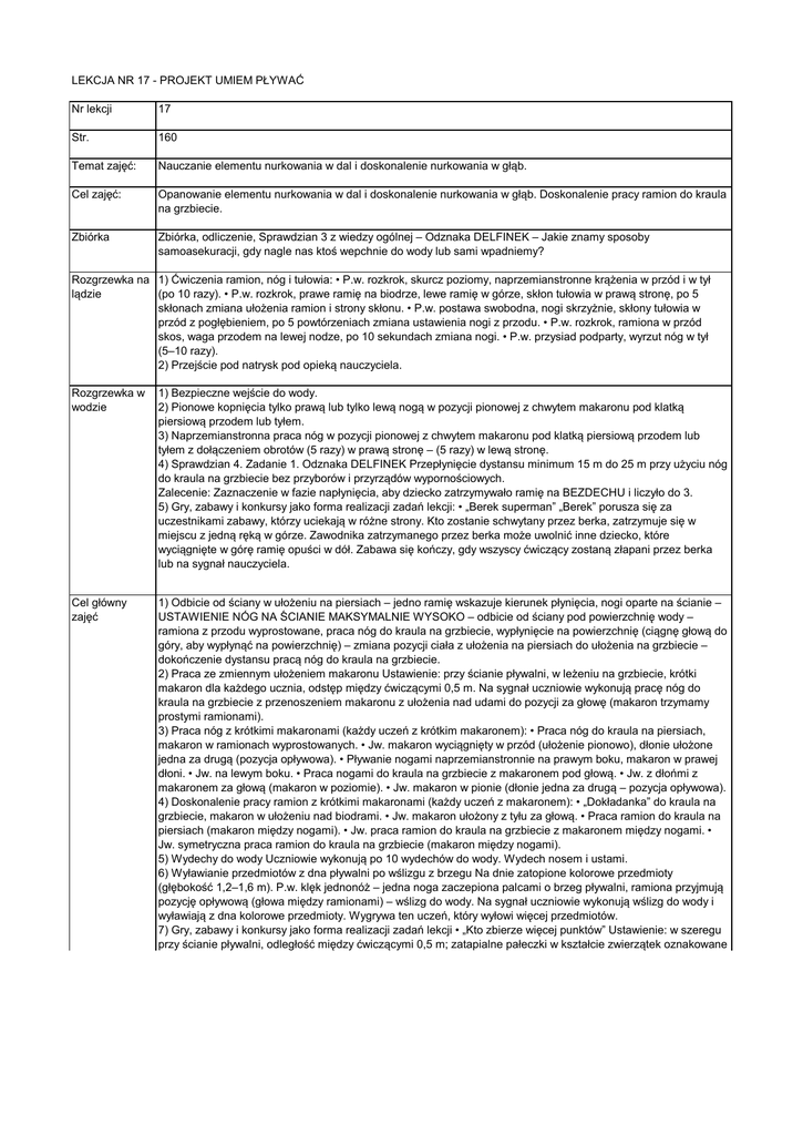 LEKCJA NR 17 - PROJEKT UMIEM PŁYWAĆ Nr lekcji 17 Str. 160 Temat zajęć: Nauczanie elementu nurkowania w dal i doskonalenie nurkowania w głąb. Cel zajęć: Opanowanie elementu nurkowania w dal i doskonalenie nurkowania w głąb. Doskonalenie pracy ramion do kraula na grzbiecie. Zbiórka Zbiórka, odliczenie, Sprawdzian 3 z wiedzy ogólnej – Odznaka DELFINEK – Jakie znamy sposoby samoasekuracji, gdy nagle nas ktoś wepchnie do wody lub sami wpadniemy? Rozgrzewka na 1) Ćwiczenia ramion, nóg i tułowia: • P.w. rozkrok, skurcz poziomy, naprzemianstronne krążenia w przód i w tył lądzie (po 10 razy). • P.w. rozkrok, prawe ramię na biodrze, lewe ramię w górze, skłon tułowia w prawą stronę, po 5 skłonach zmiana ułożenia ramion i strony skłonu. • P.w. postawa swobodna, nogi skrzyżnie, skłony tułowia w przód z pogłębieniem, po 5 powtórzeniach zmiana ustawienia nogi z przodu. • P.w. rozkrok, ramiona w przód skos, waga przodem na lewej nodze, po 10 sekundach zmiana nogi. • P.w. przysiad podparty, wyrzut nóg w tył (5–10 razy). 2) Przejście pod natrysk pod opieką nauczyciela. Rozgrzewka w wodzie 1) Bezpieczne wejście do wody. 2) Pionowe kopnięcia tylko prawą lub tylko lewą nogą w pozycji pionowej z chwytem makaronu pod klatką piersiową przodem lub tyłem. 3) Naprzemianstronna praca nóg w pozycji pionowej z chwytem makaronu pod klatką piersiową przodem lub tyłem z dołączeniem obrotów (5 razy) w prawą stronę – (5 razy) w lewą stronę. 4) Sprawdzian 4. Zadanie 1. Odznaka DELFINEK Przepłynięcie dystansu minimum 15 m do 25 m przy użyciu nóg do kraula na grzbiecie bez przyborów i przyrządów wypornościowych. Zalecenie: Zaznaczenie w fazie napłynięcia, aby dziecko zatrzymywało ramię na BEZDECHU i liczyło do 3. 5) Gry, zabawy i konkursy jako forma realizacji zadań lekcji: • „Berek superman” „Berek” porusza się za uczestnikami zabawy, którzy uciekają w różne strony. Kto zostanie schwytany przez berka, zatrzymuje się w miejscu z jedną ręką w górze. Zawodnika zatrzymanego przez berka może uwolnić inne dziecko, które wyciągnięte w górę ramię opuści w dół. Zabawa się kończy, gdy wszyscy ćwiczący zostaną złapani przez berka lub na sygnał nauczyciela. Cel główny zajęć 1) Odbicie od ściany w ułożeniu na piersiach – jedno ramię wskazuje kierunek płynięcia, nogi oparte na ścianie – USTAWIENIE NÓG NA ŚCIANIE MAKSYMALNIE WYSOKO – odbicie od ściany pod powierzchnię wody – ramiona z przodu wyprostowane, praca nóg do kraula na grzbiecie, wypłynięcie na powierzchnię (ciągnę głową do góry, aby wypłynąć na powierzchnię) – zmiana pozycji ciała z ułożenia na piersiach do ułożenia na grzbiecie – dokończenie dystansu pracą nóg do kraula na grzbiecie. 2) Praca ze zmiennym ułożeniem makaronu Ustawienie: przy ścianie pływalni, w leżeniu na grzbiecie, krótki makaron dla każdego ucznia, odstęp między ćwiczącymi 0,5 m. Na sygnał uczniowie wykonują pracę nóg do kraula na grzbiecie z przenoszeniem makaronu z ułożenia nad udami do pozycji za głowę (makaron trzymamy prostymi ramionami). 3) Praca nóg z krótkimi makaronami (każdy uczeń z krótkim makaronem): • Praca nóg do kraula na piersiach, makaron w ramionach wyprostowanych. • Jw. makaron wyciągnięty w przód (ułożenie pionowo), dłonie ułożone jedna za drugą (pozycja opływowa). • Pływanie nogami naprzemianstronnie na prawym boku, makaron w prawej dłoni. • Jw. na lewym boku. • Praca nogami do kraula na grzbiecie z makaronem pod głową. • Jw. z dłońmi z makaronem za głową (makaron w poziomie). • Jw. makaron w pionie (dłonie jedna za drugą – pozycja opływowa). 4) Doskonalenie pracy ramion z krótkimi makaronami (każdy uczeń z makaronem): • „Dokładanka” do kraula na grzbiecie, makaron w ułożeniu nad biodrami. • Jw. makaron ułożony z tyłu za głową. • Praca ramion do kraula na piersiach (makaron między nogami). • Jw. praca ramion do kraula na grzbiecie z makaronem między nogami. • Jw. symetryczna praca ramion do kraula na grzbiecie (makaron między nogami). 5) Wydechy do wody Uczniowie wykonują po 10 wydechów do wody. Wydech nosem i ustami. 6) Wyławianie przedmiotów z dna pływalni po wślizgu z brzegu Na dnie zatopione kolorowe przedmioty (głębokość 1,2–1,6 m). P.w. klęk jednonóż – jedna noga zaczepiona palcami o brzeg pływalni, ramiona przyjmują pozycję opływową (głowa między ramionami) – wślizg do wody. Na sygnał uczniowie wykonują wślizg do wody i wyławiają z dna kolorowe przedmioty. Wygrywa ten uczeń, który wyłowi więcej przedmiotów. 7) Gry, zabawy i konkursy jako forma realizacji zadań lekcji • „Kto zbierze więcej punktów” Ustawienie: w szeregu przy ścianie pływalni, odległość między ćwiczącymi 0,5 m; zatapialne pałeczki w kształcie zwierzątek oznakowane punktami (10, 20, 30, 40). Na sygnał prowadzącego uczestnicy poruszają się w kierunku, gdzie mogą być zatopione pałeczki. Zadaniem dzieci jest dowolnym sposobem zanurzyć się pod wodę i wyciągnąć pałeczkę z największą ilością punktów lub kilka pałeczek. Wygrywa ten uczestnik zabawy, który po przeliczeniu zdobył największą ilość punktów. Odmiana I: Jak wyżej, z tą różnicą, że uczestnicy zabawy stoją tyłem do wody, dopiero na sygnał prowadzącego poruszają się przodem w dowolny sposób w kierunku zatopionych pałeczek. Uwaga: Należy dopilnować, aby uczestnicy zabawy wzajemnie się nie podtapiali. • „Poławiacze skarbów” Dwa zespoły ustawione naprzeciw siebie przy ścianach pływalni, na środku pomiędzy zespołami zatopione przedmioty. Na sygnał prowadzącego uczestnicy poruszają się w kierunku środka pola gry, następnie jak najszybciej dowolnym sposobem zanurzają się pod wodę i próbują wyciągnąć jak najwięcej przedmiotów z dna pływalni. Wygrywa zespół, którego zawodnicy 