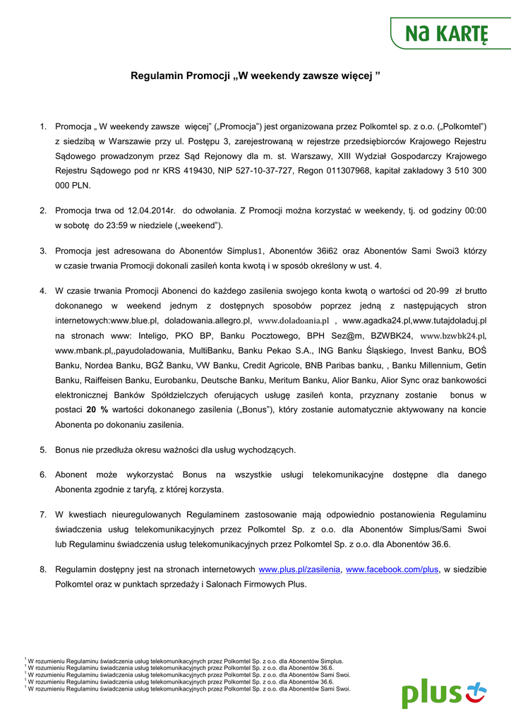 Regulamin Promocji „W weekendy zawsze więcej ” 1. Promocja „ W weekendy zawsze więcej” („Promocja”) jest organizowana przez Polkomtel sp. z o.o. („Polkomtel”) z siedzibą w Warszawie przy ul. Postępu 3, zarejestrowaną w rejestrze przedsiębiorców Krajowego Rejestru Sądowego prowadzonym przez Sąd Rejonowy dla m. st. Warszawy, XIII Wydział Gospodarczy Krajowego Rejestru Sądowego pod nr KRS 419430, NIP 527-10-37-727, Regon 011307968, kapitał zakładowy 3 510 300 000 PLN. 2. Promocja trwa od 12.04.2014r. do odwołania. Z Promocji można korzystać w weekendy, tj. od godziny 00:00 w sobotę do 23:59 w niedziele („weekend”). 3. Promocja jest adresowana do Abonentów Simplus1, Abonentów 36i62 oraz Abonentów Sami Swoi3 którzy w czasie trwania Promocji dokonali zasileń konta kwotą i w sposób określony w ust. 4. 4. W czasie trwania Promocji Abonenci do każdego zasilenia swojego konta kwotą o wartości od 20-99 zł brutto dokonanego w weekend jednym z dostępnych sposobów poprzez jedną z następujących stron internetowych:www.blue.pl, doladowania.allegro.pl, www.doladoania.pl , www.agadka24.pl,www.tutajdoladuj.pl na stronach www: Inteligo, PKO BP, Banku Pocztowego, BPH Sez@m, BZWBK24, www.bzwbk24.pl, www.mbank.pl,,payudoladowania, MultiBanku, Banku Pekao S.A., ING Banku Śląskiego, Invest Banku, BOŚ Banku, Nordea Banku, BGŻ Banku, VW Banku, Credit Agricole, BNB Paribas banku, , Banku Millennium, Getin Banku, Raiffeisen Banku, Eurobanku, Deutsche Banku, Meritum Banku, Alior Banku, Alior Sync oraz bankowości elektronicznej Banków Spółdzielczych oferujących usługę zasileń konta, przyznany zostanie bonus w postaci 20 % wartości dokonanego zasilenia („Bonus”), który zostanie automatycznie aktywowany na koncie Abonenta po dokonaniu zasilenia. 5. Bonus nie przedłuża okresu ważności dla usług wychodzących. 6. Abonent może wykorzystać Bonus na wszystkie usługi telekomunikacyjne dostępne dla danego Abonenta zgodnie z taryfą, z której korzysta. 7. W kwestiach nieuregulowanych Regulaminem zastosowanie mają odpowiednio postanowienia Regulaminu świadczenia usług telekomunikacyjnych przez Polkomtel Sp. z o.o. dla Abonentów Simplus/Sami Swoi lub Regulaminu świadczenia usług telekomunikacyjnych przez Polkomtel Sp. z o.o. dla Abonentów 36.6. 8. Regulamin dostępny jest na stronach internetowych www.plus.pl/zasilenia, www.facebook.com/plus, w siedzibie Polkomtel oraz w punktach sprzedaży i Salonach Firmowych Plus. 1 W W W 1 W 1 W 1 1 rozumieniu Regulaminu świadczenia usług telekomunikacyjnych przez Polkomtel Sp. z o.o. dla Abonentów Simplus. rozumieniu Regulaminu świadczenia usług telekomunikacyjnych przez Polkomtel Sp. z o.o. dla Abonentów 36.6. rozumieniu Regulaminu świadczenia usług telekomunikacyjnych przez Polkomtel Sp. z o.o. dla Abonentów Sami Swoi. rozumieniu Regulaminu świadczenia usług telekomunikacyjnych przez Polkomtel Sp. z o.o. dla Abonentów 36.6. rozumieniu Regulaminu świadczenia usług telekomunikacyjnych przez Polkomtel Sp. z o.o. dla Abonentów Sami Swoi.