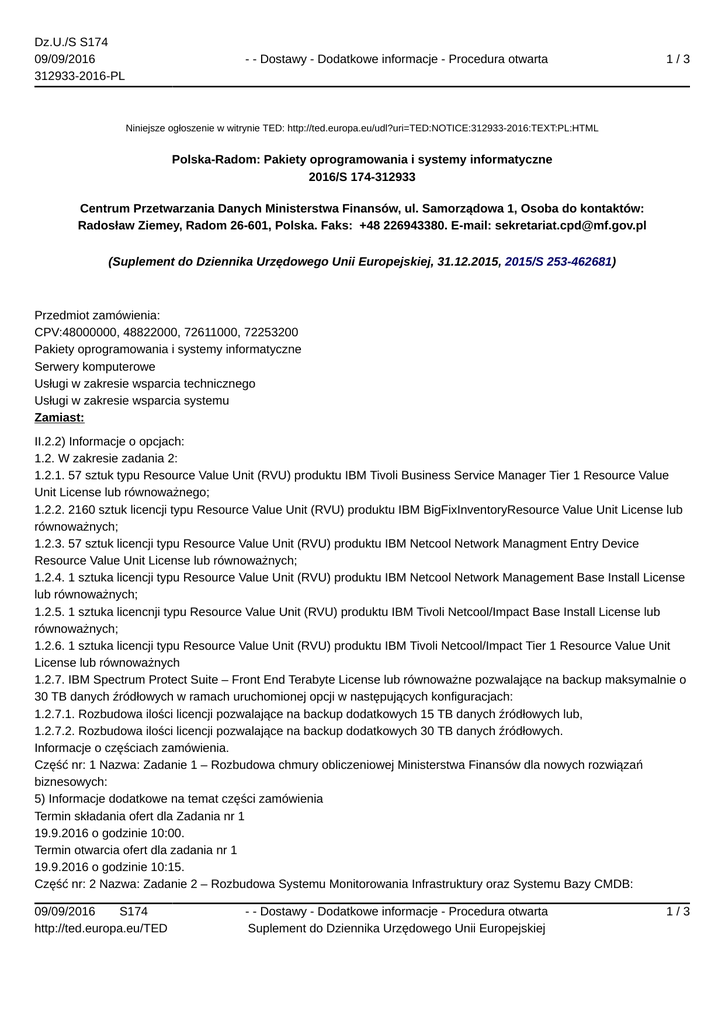 Dz.U./S S174 09/09/2016 312933-2016-PL - - Dostawy - Dodatkowe informacje - Procedura otwarta 1/3 Niniejsze ogłoszenie w witrynie TED: http://ted.europa.eu/udl?uri=TED:NOTICE:312933-2016:TEXT:PL:HTML Polska-Radom: Pakiety oprogramowania i systemy informatyczne 2016/S 174-312933 Centrum Przetwarzania Danych Ministerstwa Finansów, ul. Samorządowa 1, Osoba do kontaktów: Radosław Ziemey, Radom 26-601, Polska. Faks: +48 226943380. E-mail: [email protected] (Suplement do Dziennika Urzędowego Unii Europejskiej, 31.12.2015, 2015/S 253-462681) Przedmiot zamówienia: CPV:48000000, 48822000, 72611000, 72253200 Pakiety oprogramowania i systemy informatyczne Serwery komputerowe Usługi w zakresie wsparcia technicznego Usługi w zakresie wsparcia systemu Zamiast: II.2.2) Informacje o opcjach: 1.2. W zakresie zadania 2: 1.2.1. 57 sztuk typu Resource Value Unit (RVU) produktu IBM Tivoli Business Service Manager Tier 1 Resource Value Unit License lub równoważnego; 1.2.2. 2160 sztuk licencji typu Resource Value Unit (RVU) produktu IBM BigFixInventoryResource Value Unit License lub równoważnych; 1.2.3. 57 sztuk licencji typu Resource Value Unit (RVU) produktu IBM Netcool Network Managment Entry Device Resource Value Unit License lub równoważnych; 1.2.4. 1 sztuka licencji typu Resource Value Unit (RVU) produktu IBM Netcool Network Management Base Install License lub równoważnych; 1.2.5. 1 sztuka licencnji typu Resource Value Unit (RVU) produktu IBM Tivoli Netcool/Impact Base Install License lub równoważnych; 1.2.6. 1 sztuka licencji typu Resource Value Unit (RVU) produktu IBM Tivoli Netcool/Impact Tier 1 Resource Value Unit License lub równoważnych 1.2.7. IBM Spectrum Protect Suite – Front End Terabyte License lub równoważne pozwalające na backup maksymalnie o 30 TB danych źródłowych w ramach uruchomionej opcji w następujących konfiguracjach: 1.2.7.1. Rozbudowa ilości licencji pozwalające na backup dodatkowych 15 TB danych źródłowych lub, 1.2.7.2. Rozbudowa ilości licencji pozwalające na backup dodatkowych 30 TB danych źródłowych. Informacje o częściach zamówienia. Część nr: 1 Nazwa: Zadanie 1 – Rozbudowa chmury obliczeniowej Ministerstwa Finansów dla nowych rozwiązań biznesowych: 5) Informacje dodatkowe na temat części zamówienia Termin składania ofert dla Zadania nr 1 19.9.2016 o godzinie 10:00. Termin otwarcia ofert dla zadania nr 1 19.9.2016 o godzinie 10:15. Część nr: 2 Nazwa: Zadanie 2 – Rozbudowa Systemu Monitorowania Infrastruktury oraz Systemu Bazy CMDB: 09/09/2016 S174 http://ted.europa.eu/TED - - Dostawy - Dodatkowe informacje - Procedura otwarta Suplement do Dziennika Urzędowego Unii Europejskiej 1/3 Dz.U./S S174 09/09/2016 312933-2016-PL - - Dostawy - Dodatkowe informacje - Procedura otwarta 2/3 5) Informacje dodatkowe na temat części zamówienia: Termin składania ofert dla Zadania nr 2 19.9.2016 o godzinie 12:00. Termin otwarcia ofert dla zadania nr 2 19.9.2016 o godzinie 12:15. V.3.4) Termin składania ofert lub wniosków o dopuszczenie do udziału w postępowaniu: 19.9.2016 (12:00) IV.3.8) Warunki otwarcia ofert: 19.9.2016 (12:15) Powinno być: II.2.2) Informacje o opcjach: 1.2. W zakresie zadania 2: 1.2.1. 57 sztuk typu Resource Value Unit (RVU) produktu IBM Tivoli Business Service Manager Tier 1 Resource Value Unit License lub równoważnego; 1.2.2. 2160 sztuk licencji typu Resource Value Unit (RVU) produktu IBM BigFixInventoryResource Value Unit License lub równoważnych; 1.2.3. 57 sztuk licencji typu Resource Value Unit (RVU) produktu IBM Netcool Network Managment Entry Device Resource Value Unit License lub równoważnych; 1.2.4. 1 sztuka licencji typu Resource Value Unit (RVU) produktu IBM Netcool Network Management Base Install License lub równoważnych; 1.2.5. 1 sztuka licencnji typu Resource Value Unit (RVU) produktu IBM Tivoli Netcool/Impact Base Install License lub równoważnych; 1.2.6. 1 sztuka licencji typu Resource Value Unit (RVU) produktu IBM Tivoli Netcool/Impact Tier 1 Resource Value Unit License lub równoważnych 1.2.7. IBM Spectrum Protect Suite – Front End Terabyte License lub równoważne Back End pozwalające na backup maksymalnie o 30 TB danych źródłowych z możliwością przechowywania co najmniej 3 kopii danych w ramach uruchomionej opcji w następujących konfiguracjach: 1.2.7.1. Rozbudowa ilości licencji pozwalające na backup dodatkowych 15 TB danych źródłowych lub, 1.2.7.2. Rozbudowa ilości licencji pozwalające na backup dodatkowych 30 TB danych źródłowych. Informacje o częściach zamówienia. Część nr: 1 Nazwa: Zadanie 1 – Rozbudowa chmury obliczeniowej Ministerstwa Finansów dla nowych rozwiązań biznesowych: 5) Informacje dodatkowe na temat części zamówienia Termin składania ofert dla Zadania nr 1 4.10.2016 o godzinie 10:00. Termin otwarcia ofert dla zadania nr 1 4.10.2016 o godzinie 10:15. Część nr: 2 Nazwa: Zadanie 2 – Rozbudowa Systemu Monitorowania Infrastruktury oraz Systemu Bazy CMDB: 5) Informacje dodatkowe na temat części zamówienia: Termin składania ofert dla Zadania nr 2 4.10.2016 o godzinie 12:00. Termin otwarcia ofert dla zadania nr 2 4.10.2016 o godzinie 12:15. V.3.4) Termin składania ofert lub wniosków o dopuszczenie do udziału w postępowaniu: 4.10.2016 (12:00) 09/09/2016 S174 http://ted.europa.eu/TED - - Dostawy - Dodatkowe informacje - Procedura otwarta Suplement do Dziennika Urzędowego Unii Europejskiej 2/3 Dz.U./S S174 09/09/2016 312933-2016-PL - - Dostawy - Dodatkowe informacje - Procedura otwarta 3/3 IV.3.8) Warunki otwarcia ofert: 4.10.2016 (12:15) Inne dodatkowe informacje Informacje do poprawienia lub dodania w odpowiedniej dokumentacji przetargowej. Więcej informacji w odpowiedniej dokumentacji przetargowej. 09/09/2016 S174 http://ted.europa.eu/TED - - Dostawy - Dodatkowe informacje - Procedura otwarta Suplement do Dziennika Urzędowego Unii Europejskiej 3/3