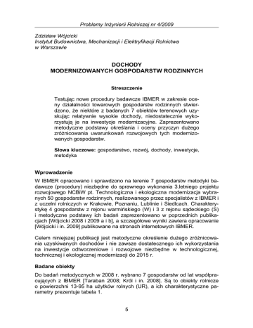 Problemy Inżynierii Rolniczej nr 4/2009 Zdzisław Wójcicki Instytut Budownictwa, Mechanizacji i Elektryfikacji Rolnictwa w Warszawie DOCHODY MODERNIZOWANYCH GOSPODARSTW RODZINNYCH Streszczenie Testując nowe procedury badawcze IBMER w zakresie oceny działalności towarowych gospodarstw rodzinnych stwierdzono, że niektóre z badanych 7 obiektów terenowych uzyskując relatywnie wysokie dochody, niedostatecznie wykorzystują je na inwestycje modernizacyjne. Zaprezentowano metodyczne podstawy określania i oceny przyczyn dużego zróżnicowania uwarunkowań rozwojowych tych modernizowanych gospodarstw. Słowa kluczowe: gospodarstwo, rozwój, dochody, inwestycje, metodyka Wprowadzenie W IBMER opracowano i sprawdzono na terenie 7 gospodarstw metodyki badawcze (procedury) niezbędne do sprawnego wykonania 3.letniego projektu rozwojowego NCBiW pt. Technologiczna i ekologiczna modernizacja wybranych 50 gospodarstw rodzinnych, realizowanego przez specjalistów z IBMER i z uczelni rolniczych w Krakowie, Poznaniu, Lublinie i Siedlcach. Charakterystykę 4 gospodarstw z rejonu warmińskiego (W) i 3 z rejonu sądeckiego (S) i metodyczne podstawy ich badań zaprezentowano w poprzednich publikacjach [Wójcicki 2008 i 2009 a i b], a szczegółowe wyniki zawiera opracowanie [Wójcicki i in. 2009] publikowane na stronach internetowych IBMER. Celem niniejszej publikacji jest metodyczne określenie dużego zróżnicowania uzyskiwanych dochodów i nie zawsze dostatecznego ich wykorzystania na inwestycje odtworzeniowe i rozwojowe niezbędne w technologicznej, technicznej i ekologicznej modernizacji do 2015 r. Badane obiekty Do badań metodycznych w 2008 r. wybrano 7 gospodarstw od lat współpracujących z IBMER [Taraban 2008; Król i in. 2008]. Są to obiekty rolnicze o powierzchni 13-95 ha użytków rolnych (UR), a ich charakterystyczne parametry prezentuje tabela 1. 5 Zdzisław Wójcicki Tabela 1. Charakterystyka badanych w 2008 r. gospodarstw (liczby zaokrąglone) Table 1. Characteristics of the farms surveyed in 2008 (rounded numbers) Wyszczególnienie charakterystycznego parametru Powierzchnia użytków rolnych (UR) Zatrudnienie rodziny w gospodarstwie Średnia obsada bydła Średnia obsada trzody chlewnej Liczba posiadanych ciągników Liczba posiadanych pras zbierających Liczba przyczep technologicznych Amortyzacja środków mechanizacji Amortyzacja budynków i budowli Wydatki na inwestycje produkcyjne Numer kolejny i rejon warmiński (W) lub sądecki (S) lokalizacji gospodarstwa Jednostka 1W 2S 3W 4S 5S 6W 7W ha tys.rbh/rok 13,5 3,2 19,6 3,4 34,2 5,3 48,1 3,4 53,1 3,9 89,6 4,9 94,6 2,9 szt./rok szt./rok 39 3 46 - 52 51 71 - 49 - 7 323 - szt. szt. szt. 3 1 5 1 1 4 3 1 3 4 1 7 4 2 6 4 1 4 2 4 tys. zł/rok tys. zł/rok tys. zł/rok 14,6 6,5 55,0 17,0 6,7 37,8 25,9 6,4 33,0 28,1 17,0 34,9 23,7 9,0 57,0 23,0 20,6 26,0 15,9 8,2 78,1 Źródło: Badania własne, IBMER 2009 r. Wszystkie badane gospodarstwa były w 2008 r. dochodowe, uzyskując wyniki ekonomiczno-finansowe wyższe od średnich dla danego regionu i dla danej grupy obszarowej gospodarstw ze względu na prowadzenie bardziej intensywnej produkcji rolniczej. Przychody badanych gospodarstw Przychody w badanych obiektach rolniczych (tab. 2) kształtowały się brutto na poziomie 2,75-7,64 tys. zł/ha UR i charakteryzowały się wysokim udziałem sprzedaży produkcji zwierzęcej (za wyjątkiem gospodarstwa 7W) i wysokim udziałem dopłat bezpośrednich, ekologicznych i innych, przy ograniczonym korzystaniu z kredytów inwestycyjnych. Pomimo pełnego wyposażenia w stare środki techniczne i dokonywania zakupów inwestycyjnych, gospodarstwa nie wykazują znaczących przychodów z tytułu sprzedaży używanych maszyn, złomu, opakowań i innych materiałów pozarolniczych. 6 Dochody modernizowanych gospodarstw... Tabela 2. Przychody (w tys. zł) badanych w 2008 r. gospodarstw (liczby zaokrąglone) Table 2. Incomes (thousand PLN) of the farms surveyed in 2008 (rounded numbers) Rodzaj przychodu gospodarstwa i rodziny rolniczej Numer kolejny i lokalizacja badanego gospodarstwa 1W 2S 3W 4S 5S 6W 7W 1,0 70,2 6,0 4,2 99,8 1,2 5,7 125,5 9,9 192,6 1,8 137,8 3,4 143,5 10,2 212,4 3,5 - 0,8 15,2 1,5 0,6 1,7 1,7 6,9 1,0 - 12,0 - Kredyty obrotowe i inwestycyjne Dopłaty bezpośrednie i inne Zwrot podatku VAT i akcyzy Emerytury, renty, odszkodowania i inne 7,9 3,3 14,7 10,0 9,5 - 23,0 2,5 - 64,9 6,8 - 74,3 6,5 8,8 34,0 35,0 8,6 14,0 16,4 70,0 18,0 Ogółem przychody brutto (suma bilansowa) 103,1 140,8 168,6 267,7 239,4 246,3 330,6 Przychody brutto na 1ha UR 7,64 7,18 4,93 5,57 4,51 2,75 3,49 Sprzedaż produkcji roślinnej Sprzedaż produkcji zwierzęcej Spożycie domowe i darowizny Sprzedaż maszyn, złomu i innych Usługi, odrobek i inne zatrudnienie Źródło: Badania własne, IBMER 2009 r. Rozchody badanych gospodarstw Materialne i niematerialne rozchody badanych gospodarstw (tab. 3) kształtowały się na poziomie 2,1-7,0 tys. zł/ha UR i charakteryzowały się relatywnie wysokimi wydatkami na zakup pasz (bez gospodarstwa 7W), zakup oleju napędowego i materiałów eksploatacyjnych oraz zakup maszyn i materiałów budowlanych, ale stosunkowo niskimi nakładami na nawozy wapniowe, środki ochrony roślin, części wymienne, usługi mechanizacyjne, ubezpieczenia dobrowolne i inne. Prezentowane w tabeli 3 rozchody (bez robocizny własnej) są podawane łącznie z częścią eksploatacyjnych i inwestycyjnych nakładów ponoszonych na utrzymanie domu mieszkalnego i jego otoczenia (paliwa, energia elektryczna, opłata za wodę, samoobsługa przy budowie lub remoncie domu itp.). Te eksploatacyjne i inwestycyjne nakłady na dom nie mogą obciążać kosztów produkcji rolniczej, bo podobnie jak spożywane własne produkty rolnicze są częścią wynagrodzenia za pracę własną rodziny. 7 Zdzisław Wójcicki Tabela 3. Rozchody (w tys. zł) w 2008 r. w badanych gospodarstwach (liczby zaokrąglone) Table 3. Expenditures (thousand PLN) in 2008 year on surveyed farms (ro