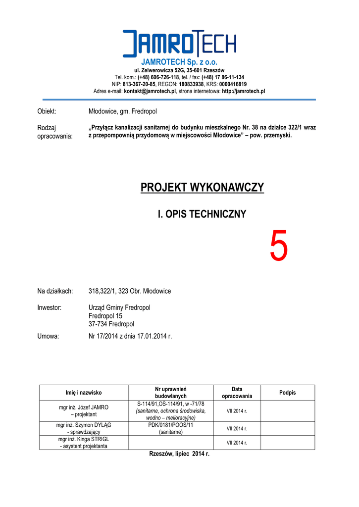 JAMROTECH Sp. z o.o. ul. Zelwerowicza 52G, 35-601 Rzeszów Tel. kom.: (+48) 606-726-118, tel. / fax: (+48) 17 86-11-134 NIP: 813-367-20-85, REGON: 180833938, KRS: 0000416819 Adres e-mail: [email protected], strona internetowa: http://jamrotech.pl Obiekt: Młodowice, gm. Fredropol Rodzaj opracowania: „Przyłącz kanalizacji sanitarnej do budynku mieszkalnego Nr. 38 na działce 322/1 wraz z przepompownią przydomową w miejscowości Młodowice” – pow. przemyski. PROJEKT WYKONAWCZY I. OPIS TECHNICZNY Na działkach: 318,322/1, 323 Obr. Młodowice Inwestor: Urząd Gminy Fredropol Fredropol 15 37-734 Fredropol Umowa: Nr 17/2014 z dnia 17.01.2014 r. Imię i nazwisko mgr inż. Józef JAMRO – projektant mgr inż. Szymon DYLĄG - sprawdzający mgr inż. Kinga STRIGL - asystent projektanta Nr uprawnień budowlanych S-114/91,OŚ-114/91, w -71/78 (sanitarne, ochrona środowiska, wodno – melioracyjne) PDK/0181/POOS/11 (sanitarne) Data opracowania VII 2014 r. VII 2014 r. VII 2014 r. Rzeszów, lipiec 2014 r. 5 Podpis 2 Rzeszów, 05.07.2014 r. OŚWIADCZAM, ŻE Użyte w niniejszym projekcie oznaczenie oraz nazwy materiałów wskazujące na konkretnych producentów są materiałami przykładowymi w związku z czym w każdym przypadku zastosować można materiałów innych firm o równoważnych parametrach technicznych i eksploatacyjnych. ……………………………… ……………………………… mgr inż. Józef Jamro S – 114/91 (sanitarne) Oś – 114/91 (ochrona środowiska) W-71/78 (wodno – malioracyjne) mgr inż. Szymon Dyląg PDK/0181/POOS/11 (do proj. bez ograniczeń w specjalności instalacyjnej w zakresie sieci, instalacji i urządzeń cieplnych, wentylacyjnych, gazowych, wodociągowych i kanalizacyjnych) SPIS TREŚCI 1. PODSTAWA OPRACOWANIA ................................................................................................................ 5 1.1. INWESTOR ....................................................................................................................................................... 5 1.2. PODSTAWA OPRACOWANIA .......................................................................................................................... 5 1.3 PRZEDMIOT INWESTYCJI............................................................................................................................... 5 2. ISTNIEJĄCY STAN UZBROJENIA TERENU ..................................................................................................... 5 3. PODSTAWOWE DANE CHARAKTERYZUJĄCE INWESTYCJĘ ........................................................................ 6 4. PROJEKTOWANE ZAGOSPODAROWANIE TERENU ....................................................................................... 6 4.1. KANALIZACJA SANITARNA ............................................................................................................................. 6 4.2. PRZYDOMOWA PRZEPOMPOWNIA ŚCIEKÓW TYP: ABATECH PA10-SJ/ZS ............................................. 7 4.3. ZALECENIA DOTYCZĄCE MATERIAŁÓW I WYKONAWSTWA ...................................................................... 9 4.4. SKRZYŻOWANIA PROJEKTOWANEJ KANALIZACJI Z ISTNIEJĄCYMI URZĄDZENIAMI ............................. 9 5. OCENA WARUNKÓW GEOTECHNICZNYCH POSADOWNIENIA KANALIZACJI SANITARNEJ I PRZEPOMPOWNI ŚCIEKÓW ............................................................................................................... 10 6. ROBOTY ZIEMNE .............................................................................................................................................. 10 7. WARUNKI BHP PRZY WYKONYWANIU ROBÓT .......................................................................................... 10 8. WYTYCZNE REALIZACJI ................................................................................................................................. 10 9. OGÓLNE WSKAZÓWKI DOTYCZĄCE REALIZACJI ROBÓT ........................................................................... 12 10. UZGODNIENIA, DECYZJE, PROTOKOŁY ...................................................................................................... 13 4 1. PODSTAWA OPRACOWANIA 1.1. INWESTOR Inwestorem jest Urząd Gminy Fredropol, Fredropol 15, 37-734 Fredropol. 1.2. PODSTAWA OPRACOWANIA Projekt wykonawczy dla inwestycji „Przyłącz kanalizacji sanitarnej do budynku mieszkalnego Nr. 38 na działce 322/1 wraz z przepompownią przydomową w miejscowości Młodowice” – pow. przemyski. Opracowany został przez JAMROTECH Sp. z o.o., ul. Zelwerowicza 52G, 35-601 Rzeszów na zlecenie Urzędu Gminy Fredropol. Podstawa opracowania: umowa o prace projektowe nr. 17/2014 z dnia 17.01.2014 r. mapa sytuacyjno – wysokościowe w skali 1: 1000, wizja lokalna w terenie, uzgodnienie tras z użytkownikami i instytucjami. Ustawa z dnia 7 lipca 1994 r., Prawo budowlane (Dz. U. 1994 Nr 89 poz. 414 z późniejszymi zmianami) Rozporządzenie Ministra Infrastruktury z dnia 3 lipca 2003 roku w sprawie szczegółowego zakresu i formy projektu budowlanego (Dz. U. Nr 120, poz. 2016) 1.3 PRZEDMIOT INWESTYCJI Przedmiotem inwestycji jest budowa przyłącza kanalizacji sanitarnej wraz z przydomową przepompownią ścieków na dz. nr. ew. 318, 322/1, 323 Obr. Młodowice w celu przejęcia ścieków z zabudowania Nr. 38 m. Młodowice i odprowadzenie ich do rurociągu tłocznego ⌀90 mm usytuowanego na dz. 323. Odprowadzenie ścieków z budynku projektuje się wykonać za pomocą przyłącza ⌀160 mm, a dalej rurociągiem ⌀160 mm do przydomowej oczyszczalni ścieków P1 skąd następnie rurociągiem tłocznym ⌀40 mm do rurociągu ciśnieniowego ⌀90 mm. 2. ISTNIEJĄCY STAN UZBROJENIA TERENU Istniejące uzbrojenie terenu: Istniejąca kanalizacja sanitarna grawitacyjna Istniejąca kanalizacji sanitarna ciśnieniowa Linia napowietrzna eNN Kolizje z poszczególnymi urządzeniami podziemnymi uzgodnione zostały w Zespole uzgodnienia D