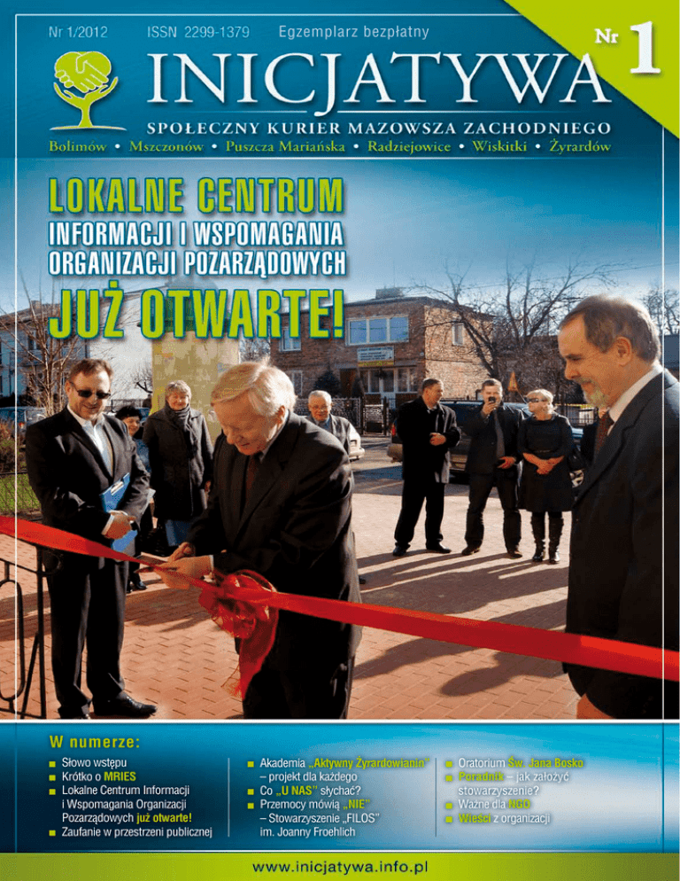 www.inicjatywa.info.pl Egzemplarz bezpłatny 1 W numerze: Słowo wstępu Krótko o MRIES Lokalne Centrum Informacji i Wspomagania Organizacji Pozarządowych już otwarte! Zaufanie w przestrzeni publicznej A kademia „Aktywny Żyrardowianin” – projekt dla każdego Co „U NAS” słychać? Przemocy mówią „NIE” – Stowarzyszenie „FILOS” im. Joanny Froehlich Oratorium Św. Jana Bosko Poradnik – jak założyć stowarzyszenie? Ważne dla NGO Wieści z organizacji INICJATYWA – Społeczny Kurier Mazowsza Zachodniego www.inicjatywa.info.pl www.inicjatywa.info.pl Krótko o MRIES Szanowni Państwo, W historii Mazowsza Zachodniego nie brakowało fantastycznych osób „z inicjatywą i społecznikowską duszą”, które wskazały kierunki rozwoju naszych wspólnot lokalnych. Z takiej potrzeby ponad 15 lat temu narodziło się Stowarzyszenie Mariański Ruch Inicjatyw Ekonomiczno Społecznych, którego działalność i osiągnięcia chcemy zaprezentować. Dzisiaj przy MRIES działalność podejmuje Lokalne Centrum Informacji i Wspomagania Organizacji Pozarządowych dla całego Regionu. Jak wiadomo: „Puszcza nie puszcza”, teraz zaś także łączy – chcemy wspierać i łączyć inicjatywy lokalne – mniejsze i większe organizacje z terenu Mazowsza Zachodniego. Temu celowi ma służyć miedzy innymi „Inicjatywa - Społeczny Kurier Mazowsza Zachodniego”, którego pierwszy numer oddajemy w Państwa ręce. Publikacja ta wydawana będzie raz na cztery miesiące w ramach projektu „Partnerstwo na rzecz wzmocnienia potencjału organizacji pozarządowych i wsparcia lokalnych inicjatyw obywatelskich”, współfinansowanego ze środków Unii Europejskiej w ramach Europejskiego Funduszu Społecznego. 2 Chcielibyśmy, aby poprzez niniejszą gazetę dowiedzieli się Państwo, jakie organizacje działają na terenie powiatu żyrardowskiego oraz w gminie Bolimów w powiecie skierniewickim i czym aktualnie się zajmują. Nie ma bowiem nigdzie zebranych takich informacji, a lokalne NGO’s mają wiele do zaoferowania, nie tylko mieszkańcom tych terenów. Warto je odwiedzać, korzystać z ich oferty, a także wspierać. Realizowane działania są różne, od kursów, szkoleń, wyjazdów, poprzez organizację imprez i wydarzeń kulturalnych, aż po wsparcie w trudnych sytuacjach życiowych. Chcemy przybliżyć Państwu zarówno działalność tych większych instytucji pozarządowych, o których na pewno już Państwo słyszeli, jak i tych mniejszych, o których niewiele można znaleźć informacji. Nasz „Społeczny Kurier” będzie na bieżąco informował o wydarzeniach z regionu, aktualnych konkursach grantowych oraz ofercie Lokalnego Centrum Informacji i Wspomagania Organizacji Pozarządowych w Puszczy Mariańskiej. Ponadto swoimi przemyśleniami na temat zaufania w przestrzeni publicznej na łamach naszego pisma dzieli się Katarzyna Tadeusiak-Jeznach – uznany w kraju ekspert ds. budowy społeczeństwa obywatelskiego i doradca Centrum. Zachęcamy do skorzystania z bogatej oferty Centrum, o której szerzej w piszemy w tym numerze „INICJATYWY”. Wraz z Partnerami – Powiatem Żyrardowskim, Gminnym Centrum Informacji w Mszczonowie i Lokalną Grupą Działania „Echo Puszczy Bolimowskiej” serdecznie zapraszamy do współpracy i życzymy Państwu miłej lektury! Krzysztof B. Matusiak Projekt „Partnerstwo na rzecz wzmocnienia potencjału organizacji pozarządowych i wsparcia lokalnych inicjatyw obywatelskich” współfinansowany ze środków Unii Europejskiej w ramach Europejskiego Funduszu Społecznego Lider projektu Partnerzy Gminne Centrum Informacji Zdj.: MRIES Zorganizowana aktywność obywatelska (przedsiębiorczość społeczna) jest motorem rozwoju społeczno-gospodarczego, lokalnych społeczności, regionów i państw, w decydujący sposób wpływając na jakość naszego życia. Wyrasta z potrzeby wspólnego działania i rozwiązywania newralgicznych dla lokalnych społeczności problemów czy wizji rozwoju i budowy konkurencyjności w dynamicznie zmieniającym się otoczeniu. Gmina Puszcza Mariańska od niepamiętnych czasów była zamieszkiwana przez osoby związane ze światem artystycznym, naukowców i społeczników, którzy angażowali się w rozwój tych okolic. W tym szczególnym miejscu swój początek ma Zgromadzenie Marianów, w drodze po wiktorię wiedeńską odpoczywał król Jan III Sobieski, mieszkali i tworzyli m. in. Józef Rapacki, Czesław Tański, zaś obecnie mieszka i tworzy światowej sławy rzeźbiarz Maksymilian Biskupski. Dzięki zaangażowaniu społeczników w Puszczy Mariańskiej w 1923 r. oddano do użytku jedną z najnowocześniejszych wówczas szkół, wybudowano pocztę, Dom Kultury… Można wymienić szereg inicjatyw, których pozytywny wpływ odczuwamy do dziś, a co inspiruje nas do podejmowania kolejnych wyzwań społecznych. Również współcześnie obserwuje się stałe zainteresowanie działalnością społeczną – ponad 15 lat temu narodził się pomysł utworzenia organizacji, która zajęłaby się skupianiem osób pragnących, bez względu na orientację polityczną i podział społeczny, działać na rzecz rozwoju gminy oraz poprawy jakości życia jej mieszkańców. Jak mówią twórcy stowarzyszenia, od początku miało być ono nawiązaniem do międzywojennego Towarzystwa Przyjaciół Puszczy Mariańskiej. Członkowie – założyciele dokładnie pamiętają ten czas, kiedy spotykali się w celu opracowania wspólnej strategii działania – statutu stowarzyszenia i złożenia dokumentacji niezbędnej do rejestracji organizacji. Już sama nazwa dokładnie odzwierciedla misję stowarzyszenia: Mariański Ruch Inicjatyw Ekonomiczno-Społecznych. Dlaczego „Mariański”? – To jest właśnie to, co nas wyróżnia – mówi Radosław Kwiatkowski, jeden z członków – założycieli. – Puszcz jest wiele, ale Mariańska tylko jedna, bo to tu znajduje się coś, co jest nasze, niepowtarzalne – kolebka Marianów 