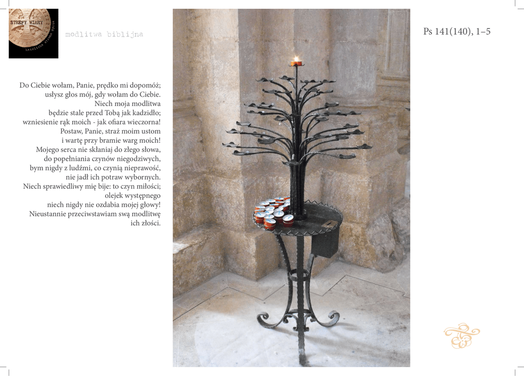 modlitwa biblijna Ps 141(140), 1–5 Do Ciebie wołam, Panie, prędko mi dopomóż; usłysz głos mój, gdy wołam do Ciebie. Niech moja modlitwa będzie stale przed Tobą jak kadzidło; wzniesienie rąk moich - jak ofiara wieczorna! Postaw, Panie, straż moim ustom i wartę przy bramie warg moich! Mojego serca nie skłaniaj do złego słowa, do popełniania czynów niegodziwych, bym nigdy z ludźmi, co czynią nieprawość, nie jadł ich potraw wybornych. Niech sprawiedliwy mię bije: to czyn miłości; olejek występnego niech nigdy nie ozdabia mojej głowy! Nieustannie przeciwstawiam swą modlitwę ich złości. G