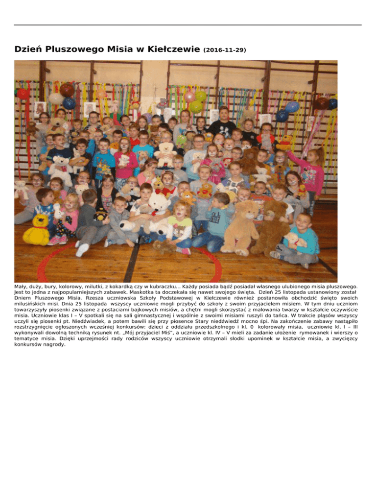 Dzień Pluszowego Misia w Kiełczewie (2016-11-29) Mały, duży, bury, kolorowy, milutki, z kokardką czy w kubraczku... Każdy posiada bądź posiadał własnego ulubionego misia pluszowego. Jest to jedna z najpopularniejszych zabawek. Maskotka ta doczekała się nawet swojego święta. Dzień 25 listopada ustanowiony został Dniem Pluszowego Misia. Rzesza uczniowska Szkoły Podstawowej w Kiełczewie również postanowiła obchodzić święto swoich milusińskich misi. Dnia 25 listopada wszyscy uczniowie mogli przybyć do szkoły z swoim przyjacielem misiem. W tym dniu uczniom towarzyszyły piosenki związane z postaciami bajkowych misiów, a chętni mogli skorzystać z malowania twarzy w kształcie oczywiście misia. Uczniowie klas I – V spotkali się na sali gimnastycznej i wspólnie z swoimi misiami ruszyli do tańca. W trakcie pląsów wszyscy uczyli się piosenki pt. Niedźwiadek, a potem bawili się przy piosence Stary niedźwiedź mocno śpi. Na zakończenie zabawy nastąpiło rozstrzygnięcie ogłoszonych wcześniej konkursów: dzieci z oddziału przedszkolnego i kl. 0 kolorowały misia, uczniowie kl. I – III wykonywali dowolną techniką rysunek nt. „Mój przyjaciel Miś”, a uczniowie kl. IV – V mieli za zadanie ułożenie rymowanek i wierszy o tematyce misia. Dzięki uprzejmości rady rodziców wszyscy uczniowie otrzymali słodki upominek w kształcie misia, a zwycięzcy konkursów nagrody. Powered by TCPDF (www.tcpdf.org)