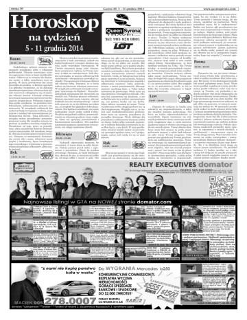 strona 30 Gazeta 49, 5 - 11 grudnia 2014 Horoskop na tydzień Tel: 905 828 0001 5 - 11 grudnia 2014 Baran 21.03 - 20.04 Możesz narzekać na przepracowanie, zmęczenie i brak satysfakcji, jednak nie będzie brakować Ci energii i dzielnie stawisz czoło wszystkim wyzwaniom. W Twoim otoczeniu mogą zajść zmiany, które pozytywnie wpłyną na Twoje interesy, a także na samopoczucie. Jeśli chodzi o pieniądze, to musisz odłożyć na bok sentymenty i skrupulatnie prowadzić rachunki. Twoi partnerzy w biznesie i klienci tak właśnie robią. Pamiętaj, że w życiu należy się kierować własnym interesem. W związkach osobistych Gwiazdy ostrzegają "sparzonego na błędach". Naszą bojaźń przed zranieniem lub otwarciem się starych ran. Pokazuje pancerz ochronny, którym otaczamy nasze wnętrze, aby nie dotknęło nas nic nieprzyjemnego - nawet jeśli ceną jest to, że nie dotknie nas także nic, co mogłoby być głębokim dobrodziejstwem. Nie będziesz aniołkiem, nie same niebiańskie istoty widać wokół Ciebie. Do głosu mogą dojść ambicje, przewrażliwienie na własnym punkcie i inne względy, które nie sprzyjają porozumieniu i harmonijnym stosunkom. Aby zapobiec narastaniu napięcia z partnerem i otoczeniem, nie ulegaj nastrojowi chwili. załamuj się, gdy coś się nie powiedzie. Masz szanse się przekonać, że nie ma tego złego, co by na dobre nie wyszło. Być może warto wybrać się w podróż służbową bądź handlową. Może warto poszukać szczęścia i pieniędzy z dala od domu. Jeśli w pracy intensywnie używasz szarych komórek, wiedz, że będą pracować pełną parą i na pewno Cię nie zawiodą. Staniesz się mistrzem w rozwiązywaniu zagadek i odkrywaniu tajemnic: ludzi, przyrody, świata, a nawet przyziemnych, dlaczego znajomi zarabiają dużo, a Tobie ledwo wystarcza do pierwszego. Może teraz się tego dowiesz i wyciągniesz wnioski. Możesz być nastawiony na działanie, a nie wsłuchiwanie się w siebie i zastanawianie się, czy partner kocha czy nie kocha. Masz zdrowy stosunek do uczuć. Twoje oczekiwania wobec drugiej połowy nie są zbyt wygórowane. Wygląda na to, że nawet nad niedoskonałościami partnera, które teraz się ujawnią, przejdziesz do porządku dziennego. Wiele dobrego dla przyszłości i codzienności możecie zrobić we dwoje. Jeden tylko warunek: popatrzcie w jednym kierunku i postawcie na to, co Was łączy, a nie dzieli. W razie problemów, możesz śmiało zaufać swojej intuicji i postąpić zgodnie z tym, co Ci podpowiada, nawet jeśli wyda Ci się to dość dziwne. Nadchodzący tydzień oznacza niemożność poradzenia sobie z własnymi problemami. Ukazuje narastające uczucie zagrożenia i życie w męce niezdecydowania. Odnosi się to również do tłumienia uczuć, a także zamykania oczu na prawdę. W życiu zawodowym być może doszedłeś do punktu, w którym ogarnęło Cię głębokie zwątpienie, co do dalszego sposobu postępowania, równocześnie jednak stanowczo odżegnujesz się od zaufania własnej intuicji. Gwiazdy wskazują na sytuacje naznaczone uporczywym dręczącym zwątpieniem. Pokazują rozpaczliwą próbę uzyskania, na poziomie intelektualnym, jednoznacznej postawy stanowczości. W związkach osobistych dni cechować będą wewnętrzne rozbicie, sceptycyzm i niechęć lub nieumiejętność podejmowania decyzji. Taką atmosferę w związku należy potraktować poważnie, ponieważ nośne dla związku uczucia zagrożone są zjadliwą trucizną zwątpienia. Niezależnie od tego, przez co przeszliśmy, jakie przeżyliśmy bolesne doświadczenia emocjonalne lub nieudane związki, obecnie jesteśmy gotowi ruszyć z miejsca. Oznacza to umiejętność dostrzeżenia swojej siły i szans, właściwej oceny 22.05 - 21.06 ryzyka i możliwości, bycia świadomym Nadszedł odpowiedni moment, by tego wszystkiego i wytrwania w postano- zrozumieć, iż nasze iluzje są tylko iluzja22.06 - 22.07 wieniu niezależnie od kosztów, jakie trze- mi. Należy patrzeć przed siebie i zapoba ponosić. mnieć o przeszłości. Dojść do punktu zwrotnego. Pamiętaj, że kiedy dotykamy Weź swoje sprawy w swoje ręce.Naddna, dociera do nas, że możemy już tylko szedł czas przyzwyczajenia się do zmie21.04 -21.05 się od niego odbić i ruszyć w górę. Nie niających się okoliczności, żonglowania Bliźnięta Rak Byk www.gazetagazeta.com pomysłami i znalezienia właściwej drogi naprzód. Wkrótce będziesz musiał wykazać się komunikatywnością. Możesz mieć skłonność do skrajnych i mało praktycznych rozwiązań. Być może będziesz mieć trudności ze zgodną współpracą w grupie, a także z podjęciem rozsądnych decyzji finansowych. Twoje negatywne nastawienie do świata może się odbić na relacjach w pracy. Trudno Ci będzie wykrzesać entuzjazm do codziennych obowiązków. Postaraj się nie afiszować z tym chwilowym nastrojem przed szefem czy klientami. Odwlekane zadania, za którymi nie przepadasz, staną się pilne. Wykonaj je jak najszybciej, żebyś miał spokojne sumienie i unikniesz strat z powodu swojej opieszałości. Choć stronisz od konfliktów, możesz teraz trafić w sam środek jakiejś kłótni. Niewykluczone, że ktoś spróbuje posłużyć się Tobą - bez Twojej wiedzy - w swoich personalnych rozrywkach. Nie przypisuj jednak temu wielkiego znaczenia. Czasem wszyscy robimy takie rzeczy nieświadomie. Twoja niechęć do kogoś lub czegoś albo pragnienie uwolnienia się od pewnych wpływów wyda Ci się sprawą numer jeden. Bez względu na to, co postanowisz, wiedz, że już za kilka dni wszystko zobaczysz w łagodniejszych barwach. Lew 23.07 - 22.08 Dążenie do sukcesu za każdą cenę zakończy się niepowodzeniem, a także nie znajdzie uznania społecznego. Nie bierz na siebie odpowiedzialności za wszystkich. Uparte trzymanie się własnych problemów może zniweczyć możliwość osiągnięcia tego, o czym marzysz. Zachowaj umiar w słowie i nie wtrącaj się do nie swoich sp