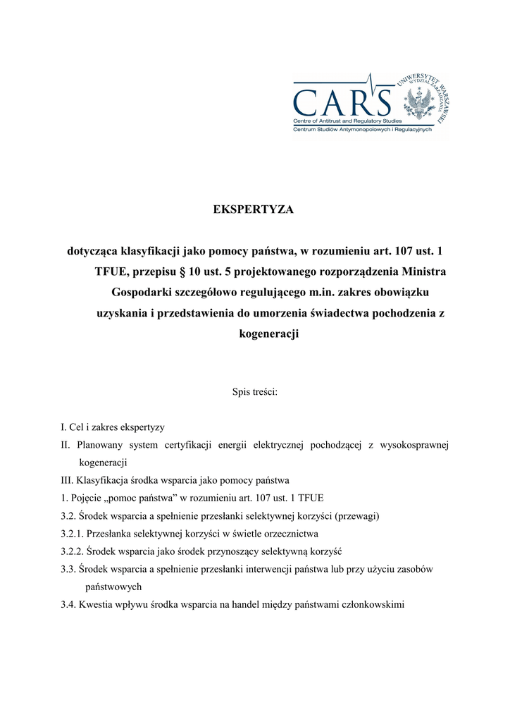 EKSPERTYZA dotycząca klasyfikacji jako pomocy państwa, w rozumieniu art. 107 ust. 1 TFUE, przepisu § 10 ust. 5 projektowanego rozporządzenia Ministra Gospodarki szczegółowo regulującego m.in. zakres obowiązku uzyskania i przedstawienia do umorzenia świadectwa pochodzenia z kogeneracji Spis treści: I. Cel i zakres ekspertyzy II. Planowany system certyfikacji energii elektrycznej pochodzącej z wysokosprawnej kogeneracji III. Klasyfikacja środka wsparcia jako pomocy państwa 1. Pojęcie „pomoc państwa” w rozumieniu art. 107 ust. 1 TFUE 3.2. Środek wsparcia a spełnienie przesłanki selektywnej korzyści (przewagi) 3.2.1. Przesłanka selektywnej korzyści w świetle orzecznictwa 3.2.2. Środek wsparcia jako środek przynoszący selektywną korzyść 3.3. Środek wsparcia a spełnienie przesłanki interwencji państwa lub przy użyciu zasobów państwowych 3.4. Kwestia wpływu środka wsparcia na handel między państwami członkowskimi 3.5. Środek wsparcia a przesłanka zakłócenia lub zagrożenia zakłóceniem konkurencji IV. Obowiązek notyfikacji Projektu Rozporządzenia V. Podsumowanie I. Cel i zakres ekspertyzy 1. Projektowane rozporządzenie Ministra Gospodarki (dalej: Projekt Rozporządzenia), które ma zastąpić obecnie obowiązujące rozporządzenie Ministra Gospodarki pod tym samym tytułem1, zakłada m.in. wprowadzenie w krajowym systemie certyfikacji energii elektrycznej pochodzącej z wysokosprawnej kogeneracji modyfikacji zakresu uwzględniania uzasadnionych kosztów uzyskania i przedstawienia do umorzenia świadectw pochodzenia z kogeneracji albo poniesienia opłaty zastępczej w kalkulacji cen energii elektrycznej, ustalanych w taryfach przedsiębiorstw energetycznych realizujących te obowiązki; zmianę tę ma dokonać przepis § 10 ust. 5 Projektu Rozporządzenia 2, który jest bezpośrednim przedmiotem niniejszej ekspertyzy. 2. Planowane zmiany legislacyjne budzą wątpliwości co do ich zgodności z regułami pomocy państwa zawartymi w art. 107-109 Traktatu o Funkcjonowaniu Unii Europejskiej (dalej: TFUE). Celem niniejszej ekspertyzy jest odpowiedź na pytanie o klasyfikację planowanych zmian legislacyjnych jako pomocy państwa w rozumieniu art. 107 ust. 1 TFUE oraz o objęcie Projektu Rozporządzenia do Komisji Europejskiej obowiązkiem notyfikacji pomocy państwa Komisji Europejskiej wyrażonym w art. 108 ust. 3 TFUE. II. Planowany system certyfikacji energii elektrycznej pochodzącej z wysokosprawnej kogeneracji 3. System certyfikacji energii elektrycznej pochodzącej z wysokosprawnej kogeneracji uregulowany został w przepisach ustawy z dnia 10 kwietnia 1997 r. – Prawo energetyczne (dalej: PE)3 oraz w przepisach wykonawczych wydanych z jej delegacji. Przepis art. 9a ust. 8 PE określa podmiotowy zakres obowiązku uzyskiwania i przedstawiania do umorzenia 1 Rozporządzenie Ministra Gospodarki z dnia 26 września 2007 roku w sprawie sposobu obliczania danych podanych we wniosku o wydanie świadectwa pochodzenia z kogeneracji oraz szczegółowego zakresu obowiązku uzyskania i przedstawienia do umorzenia tych świadectw, uiszczania opłaty zastępczej i obowiązku potwierdzania danych dotyczących ilości energii elektrycznej wytworzonej w wysokosprawnej kogeneracji, Dz. U. Nr 185 Poz. 1314 2 Z punktu widzenia celów niniejszej ekspertyzy zmiana ta pozostaje w związku z modyfikacją zakresu obowiązku uzyskania i przedstawienia do umorzenia świadectwa pochodzenia z kogeneracji lub uiszczenia opłaty zastępczej, dokonaną przepisem § 9 ust. 1 i 2 Projektu Rozporządzenia. 3 Dz. U. Nr 54 poz. 348 z późn. zm. 2 świadectw pochodzenia energii elektrycznej z wysokosprawnej kogeneracji lub wniesienia opłaty zastępczej. Zgodnie z jego treścią obowiązek ten obejmuje trzy kategorie podmiotów: 1) przedsiębiorstwa energetyczne zajmujące się wytwarzaniem energii elektrycznej lub jej obrotem i sprzedające energię elektryczną odbiorcom końcowym; 2) odbiorcy końcowi będący członkami giełdy towarowej w rozumieniu art. 2 pkt 5 ustawy z dnia 26 października 2000 r. o giełdach towarowych, w odniesieniu do transakcji zawieranych we własnym imieniu na giełdzie towarowej; 3) towarowe domy maklerskie lub domy maklerskie, w rozumieniu art. 2 pkt 8 i 9 ustawy z dnia 26 października 2000 r. o giełdach towarowych w odniesieniu do transakcji realizowanych na zlecenie odbiorców końcowych na giełdzie towarowej. 4. Przedmiotowy zakres tego obowiązku określają przepisy wykonawcze zawarte w rozporządzeniu ministra właściwego ds. gospodarki, wydanym z delegacji przepisu art. 9a ust. 10 PE. W planowanym nowym systemie certyfikacji zakres obowiązku uzyskiwania i przedstawiania do umorzenia świadectw pochodzenia energii elektrycznej z wysokosprawnej kogeneracji określają przepisy § 9 ust. 1 i 2 Projektu Rozporządzenia. Zakres ten zdefiniowany został odrębnie dla trzech typów jednostek wysokosprawnej kogeneracji i ustalony jako procentowy udział sumy energii elektrycznej wynikającej z uzyskanych i umorzonych świadectw pochodzenia z kogeneracji lub z uiszczonej opłaty zastępczej, odniesiony do: 1) wykonanej całkowitej sprzedaży energii elektrycznej przez przedsiębiorstwo energetyczne zajmujące się wytwarzaniem energii elektrycznej lub jej obrotem i sprzedające energię elektryczną odbiorcom końcowym innym niż tzw. odbiorcy energochłonni; pojęcie to obejmuje odbiorców przyłączonych do sieci elektroenergetycznej wysokich i najwyższych napięć, których zużycie energii elektrycznej na własne potrzeby w roku poprzedzającym o rok dany rok kalendarzowy jest nie mniejsze niż 400 GWh, przy wykorzystaniu nie mniej niż 50 % mocy umownej, a koszt energii elektrycznej stanowi nie mniej niż 15 % wartości produkcji (dalej: odbiorcy energochłonni); 2) wykonanego zakupu energii elektrycznej na giełdzie towarowej w transakcjach zawieranych we własnym imieniu przez odbiorców końcowych będących członkiem giełdy towarow