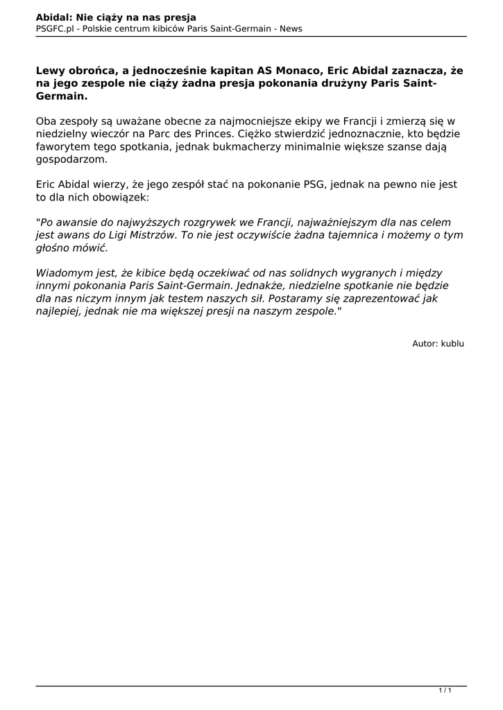 Abidal: Nie ciąży na nas presja PSGFC.pl - Polskie centrum kibiców Paris Saint-Germain - News Lewy obrońca, a jednocześnie kapitan AS Monaco, Eric Abidal zaznacza, że na jego zespole nie ciąży żadna presja pokonania drużyny Paris SaintGermain. Oba zespoły są uważane obecne za najmocniejsze ekipy we Francji i zmierzą się w niedzielny wieczór na Parc des Princes. Ciężko stwierdzić jednoznacznie, kto będzie faworytem tego spotkania, jednak bukmacherzy minimalnie większe szanse dają gospodarzom. Eric Abidal wierzy, że jego zespół stać na pokonanie PSG, jednak na pewno nie jest to dla nich obowiązek: "Po awansie do najwyższych rozgrywek we Francji, najważniejszym dla nas celem jest awans do Ligi Mistrzów. To nie jest oczywiście żadna tajemnica i możemy o tym głośno mówić. Wiadomym jest, że kibice będą oczekiwać od nas solidnych wygranych i między innymi pokonania Paris Saint-Germain. Jednakże, niedzielne spotkanie nie będzie dla nas niczym innym jak testem naszych sił. Postaramy się zaprezentować jak najlepiej, jednak nie ma większej presji na naszym zespole." Autor: kublu 1/1 Powered by TCPDF (www.tcpdf.org)