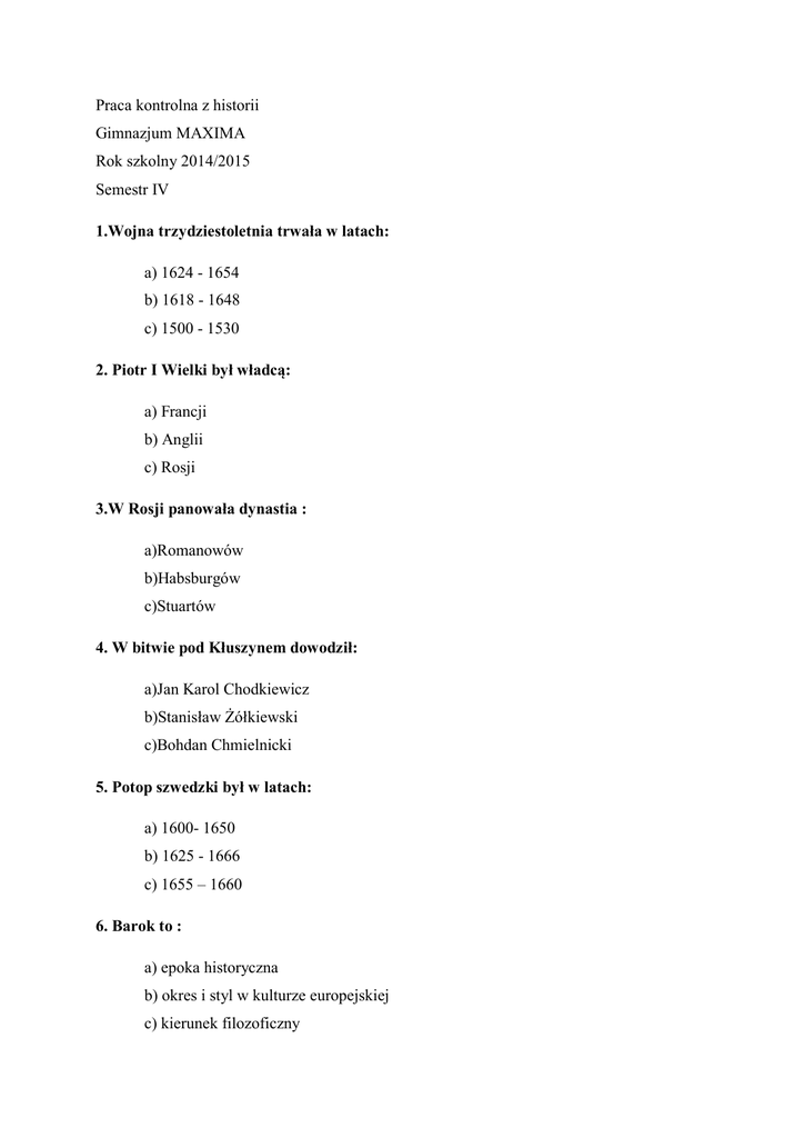 Praca kontrolna z historii Gimnazjum MAXIMA Rok szkolny 2014/2015 Semestr IV 1.Wojna trzydziestoletnia trwała w latach: a) 1624 - 1654 b) 1618 - 1648 c) 1500 - 1530 2. Piotr I Wielki był władcą: a) Francji b) Anglii c) Rosji 3.W Rosji panowała dynastia : a)Romanowów b)Habsburgów c)Stuartów 4. W bitwie pod Kłuszynem dowodził: a)Jan Karol Chodkiewicz b)Stanisław Żółkiewski c)Bohdan Chmielnicki 5. Potop szwedzki był w latach: a) 1600- 1650 b) 1625 - 1666 c) 1655 – 1660 6. Barok to : a) epoka historyczna b) okres i styl w kulturze europejskiej c) kierunek filozoficzny 7. Oświecenie charakteryzowało się: a) racjonalizmem, empiryzmem, krytycyzmem b) konserwatyzmem, anarchizmem, teocentryzmem c) liberalizmem, deizmem, humanizmem 8. Twórcą trójpodziału władzy był: a) Wolter b) Rousseau c) Monteskiusz 9. Rewolucja przemysłowa rozpoczęła się w : a) Anglii b) Niemczech c) Polsce 10. Konstytucja Stanów Zjednoczonych została uchwalona w roku: a) 1787 b) 1783 c) 1791 11. 14 lipca 1789 roku lud Paryża zdobył: a) Cytadele b) Wersal c) Bastylię 12. Ostatnim królem Polski był: a) Jan III Sobieski b) Stanisław August Poniatowski c) Bolesław Chrobry
