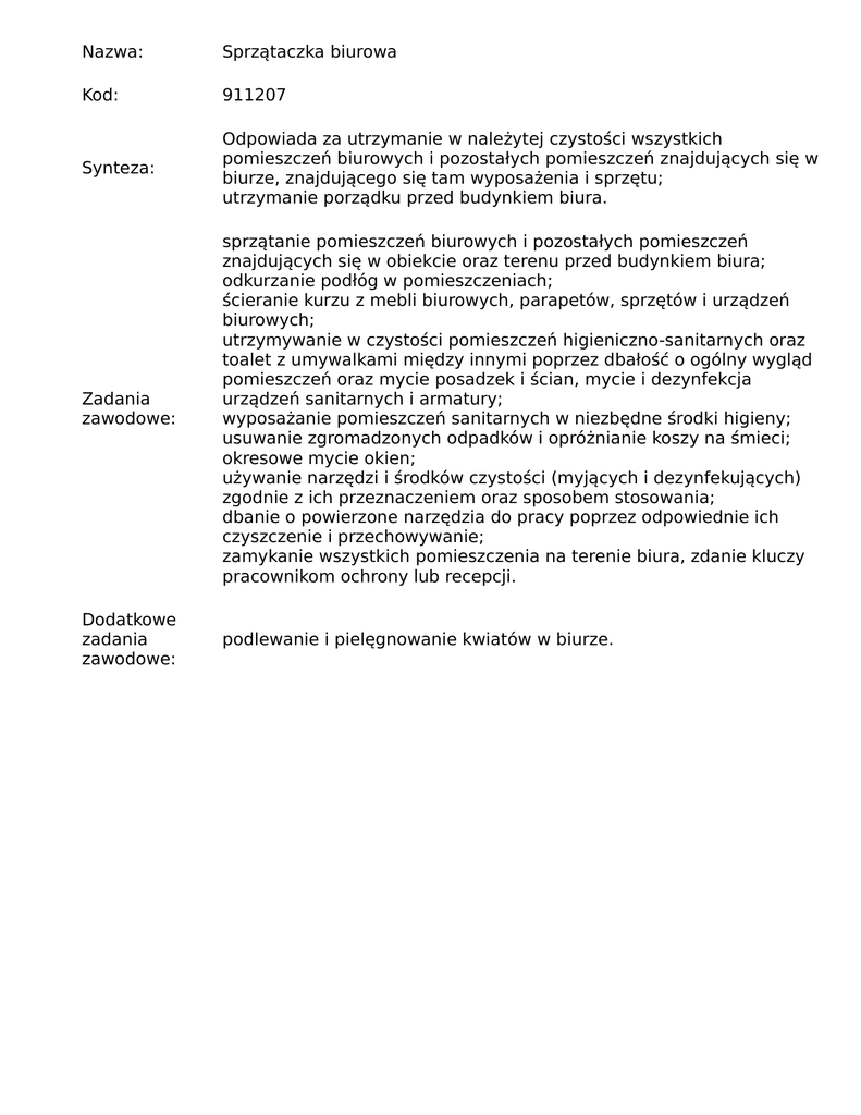 Nazwa: Sprzątaczka biurowa Kod: 911207 Synteza: Odpowiada za