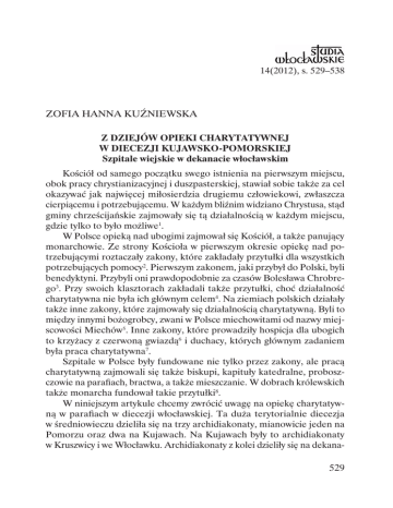14(2012), s. 529–538 Zofia Hanna Kuźniewska Z dziejów opieki charytatywnej w diecezji kujawsko-pomorskiej Szpitale wiejskie w dekanacie włocławskim Kościół od samego początku swego istnienia na pierwszym miejscu, obok pracy chrystianizacyjnej i duszpasterskiej, stawiał sobie także za cel okazywać jak najwięcej miłosierdzia drugiemu człowiekowi, zwłaszcza cierpiącemu i potrzebującemu. W każdym bliźnim widziano Chrystusa, stąd gminy chrześcijańskie zajmowały się tą działalnością w każdym miejscu, gdzie tylko to było możliwe1. W Polsce opieką nad ubogimi zajmował się Kościół, a także panujący monarchowie. Ze strony Kościoła w pierwszym okresie opiekę nad potrzebującymi roztaczały zakony, które zakładały przytułki dla wszystkich potrzebujących pomocy2. Pierwszym zakonem, jaki przybył do Polski, byli benedyktyni. Przybyli oni prawdopodobnie za czasów Bolesława Chrobrego3. Przy swoich klasztorach zakładali także przytułki, choć działalność charytatywna nie była ich głównym celem4. Na ziemiach polskich działały także inne zakony, które zajmowały się działalnością charytatywną. Byli to między innymi bożogrobcy, zwani w Polsce miechowitami od nazwy miejscowości Miechów5. Inne zakony, które prowadziły hospicja dla ubogich to krzyżacy z czerwoną gwiazdą6 i duchacy, których głównym zadaniem była praca charytatywna7. Szpitale w Polsce były fundowane nie tylko przez zakony, ale pracą charytatywną zajmowali się także biskupi, kapituły katedralne, proboszczowie na parafiach, bractwa, a także mieszczanie. W dobrach królewskich także monarcha fundował takie przytułki8. W niniejszym artykule chcemy zwrócić uwagę na opiekę charytatywną w parafiach w diecezji włocławskiej. Ta duża terytorialnie diecezja w średniowieczu dzieliła się na trzy archidiakonaty, mianowicie jeden na Pomorzu oraz dwa na Kujawach. Na Kujawach były to archidiakonaty w Kruszwicy i we Włocławku. Archidiakonaty z kolei dzieliły się na dekana- 529 ty, a te na parafie9. Parafie, będące podstawową jednostką administracyjną w Kościele, organizowały życie religijne, a także były odpowiedzialne za udzielanie pomocy potrzebującym10. Starano się, aby w każdej parafii był przytułek, zwany najczęściej szpitalem. W praktyce nie zawsze tak było, ponieważ niektóre parafie, zwłaszcza wiejskie, były zbyt małe, aby mogły mieć szpital. Wszędzie jednak zdarzały się osoby ubogie czy opuszczone. Proboszczowie wówczas starali się, aby znaleźć takie osoby, które dadzą im schronienie. Tacy podopieczni mogli też żebrać, czyli upraszać jałmużnę11. Najdawniejszych wiadomości o takich przytułkach istniejących w parafiach szukać należy w protokołach wizytacji kanonicznych przeprowadzanych albo przez samego biskupa diecezjalnego, albo przez upoważnionych przezeń urzędowych wizytatorów12. Przeprowadzania takich wizytacji należy się spodziewać od początków powstawania diecezji i parafii. W polskiej rzeczywistości najpierw wizytatorami z mocy samego prawa byli archidiakoni, potem jednak biskupi zarezerwowali sobie to prawo, wykonując je osobiście, albo – co zdarzało się najczęściej, przez wyznaczone przez nich osoby13. W diecezji kujawsko-pomorskiej nie zachowały się żadne protokoły wizytacji archidiakońskich, zaś najstarsze wizytacje biskupie rozpoczynają się od czasów biskupa Stanisława Karnkowskiego w 1577 r. Najstarsze z nich zostały częściowo wydane drukiem w serii wydawniczej Monumenta historica dioeceseos Wladislaviensis. * * * Niniejszy artykuł przedstawia sytuację wiejskich szpitali w dekanacie brzeskim, diecezji włocławskiej. W skład tego dekanatu wchodziły dwa miasta; mianowicie miasto biskupie Włocławek (z parafią św. Jana Chrzciciela) i Brześć Kujawski. W tych miastach było kilka przytułków, którymi wypada zająć się osobno. W niniejszym artykule mówimy tylko o przytułkach wiejskich. Do dekanatu brzeskiego należały następujące parafie wiejskie: Kruszyn, Kłobia, Zgłowiączka, Lubomin, Lubraniec, Dąbie Kujawskie, Osięciny, Kościelna Wieś i Wieniec. Przyjrzyjmy się więc sytuacji szpitali w poszczególnych parafiach. Na początku zapoznajmy się ze szpitalem w K r u s z y n i e. Była to wieś królewska w starostwie brzeskim14, czyli musiała to być parafia prawa patronatu monarszego. Chociaż posiadamy krótkie wzmianki o wizytacji tej parafii z 1594 r., to jednak pierwsza zapisana informacja o przytułku w tej parafii pocho- 530 dzi z 1598 r., co wcale nie oznacza, że przedtem takiego nie było, bo poprzedni mógł popaść w ruinę. Wizytator podał, że niedaleko kościoła parafialnego znajdował się dom szpitalny. Wybudowano go przed trzema laty, czyli około 1595 r., na gruncie należącym do monarchy, dlatego zezwolenie na jego wystawienie dał urzędnik królewski, starosta brzeski. Sam budynek szpitalny wybudował rzemieślnik, niejaki Franciszek (nie podano tu jego nazwiska), przy pomocy kilku parafian, których nazwisk także nie znamy. Przypuszczać należy, że była to fundacja królewska. Nowy budynek składał się z jednego pomieszczenia i trzech sypialni. Mieszkało tam dwóch starców i pięć starych, ułomnych kobiet. Kobiety i mężczyźni mieszkali oddzielnie, aby uniknąć zgorszenia. Pensjonariusze utrzymywali się z jałmużny, choć jako skromne uposażenie posiadali dodatkowo mały ogród. Każdego miesiąca przystępowali do sakramentów. W każdą środę i czwartek odmawiali litanię za swych dobroczyńców wraz ze swym komendarzem, czyli zarządcą parafii. Kuratorami szpitala były te same osoby, co przy kościele parafialnym. Były to cztery osoby, których imion w wizytacji nie podano15. Ten budynek szpitalny okazał się niezbyt trwały, skoro z lat czterdziestych wieku XVII mamy wiadomość, że proboszcz ówczesny, najprawdopodobniej archidiakon włocławski, Sebastian Grotkowski, wybudował nowy pr