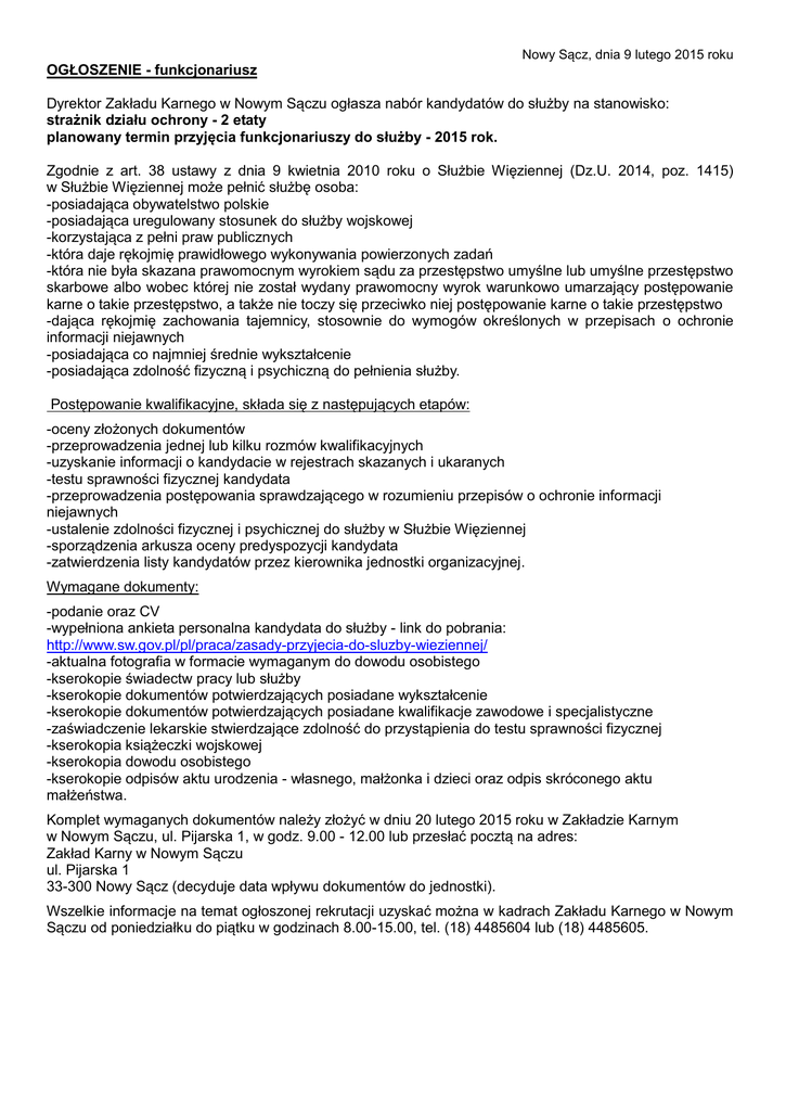 Nowy Sącz, dnia 9 lutego 2015 roku OGŁOSZENIE - funkcjonariusz Dyrektor Zakładu Karnego w Nowym Sączu ogłasza nabór kandydatów do służby na stanowisko: strażnik działu ochrony - 2 etaty planowany termin przyjęcia funkcjonariuszy do służby - 2015 rok. Zgodnie z art. 38 ustawy z dnia 9 kwietnia 2010 roku o Służbie Więziennej (Dz.U. 2014, poz. 1415) w Służbie Więziennej może pełnić służbę osoba: -posiadająca obywatelstwo polskie -posiadająca uregulowany stosunek do służby wojskowej -korzystająca z pełni praw publicznych -która daje rękojmię prawidłowego wykonywania powierzonych zadań -która nie była skazana prawomocnym wyrokiem sądu za przestępstwo umyślne lub umyślne przestępstwo skarbowe albo wobec której nie został wydany prawomocny wyrok warunkowo umarzający postępowanie karne o takie przestępstwo, a także nie toczy się przeciwko niej postępowanie karne o takie przestępstwo -dająca rękojmię zachowania tajemnicy, stosownie do wymogów określonych w przepisach o ochronie informacji niejawnych -posiadająca co najmniej średnie wykształcenie -posiadająca zdolność fizyczną i psychiczną do pełnienia służby. Postępowanie kwalifikacyjne, składa się z następujących etapów: -oceny złożonych dokumentów -przeprowadzenia jednej lub kilku rozmów kwalifikacyjnych -uzyskanie informacji o kandydacie w rejestrach skazanych i ukaranych -testu sprawności fizycznej kandydata -przeprowadzenia postępowania sprawdzającego w rozumieniu przepisów o ochronie informacji niejawnych -ustalenie zdolności fizycznej i psychicznej do służby w Służbie Więziennej -sporządzenia arkusza oceny predyspozycji kandydata -zatwierdzenia listy kandydatów przez kierownika jednostki organizacyjnej. Wymagane dokumenty: -podanie oraz CV -wypełniona ankieta personalna kandydata do służby - link do pobrania: http://www.sw.gov.pl/pl/praca/zasady-przyjecia-do-sluzby-wieziennej/ -aktualna fotografia w formacie wymaganym do dowodu osobistego -kserokopie świadectw pracy lub służby -kserokopie dokumentów potwierdzających posiadane wykształcenie -kserokopie dokumentów potwierdzających posiadane kwalifikacje zawodowe i specjalistyczne -zaświadczenie lekarskie stwierdzające zdolność do przystąpienia do testu sprawności fizycznej -kserokopia książeczki wojskowej -kserokopia dowodu osobistego -kserokopie odpisów aktu urodzenia - własnego, małżonka i dzieci oraz odpis skróconego aktu małżeństwa. Komplet wymaganych dokumentów należy złożyć w dniu 20 lutego 2015 roku w Zakładzie Karnym w Nowym Sączu, ul. Pijarska 1, w godz. 9.00 - 12.00 lub przesłać pocztą na adres: Zakład Karny w Nowym Sączu ul. Pijarska 1 33-300 Nowy Sącz (decyduje data wpływu dokumentów do jednostki). Wszelkie informacje na temat ogłoszonej rekrutacji uzyskać można w kadrach Zakładu Karnego w Nowym Sączu od poniedziałku do piątku w godzinach 8.00-15.00, tel. (18) 4485604 lub (18) 4485605.