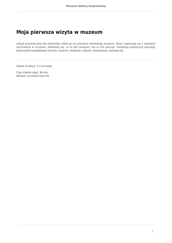 Muzeum Kultury Kurpiowskiej Moja pierwsza wizyta w muzeum Lekcja przeznaczona dla maluchów, które po raz pierwszy odwiedzają muzeum. Dzieci zapoznają się z zasadami zachowania w muzeum, dowiedzą się, co to jest muzeum, kto w nim pracuje, zwiedzają ekspozycje poznając jednocześnie podstawowe terminy: muzeum, eksponat, zabytek, konserwacja, wystawa itp. Opłata za lekcję: 5 zł od osoby Czas trwania zajęć: 60 min. Adresat: uczniowie klas 0-III 1