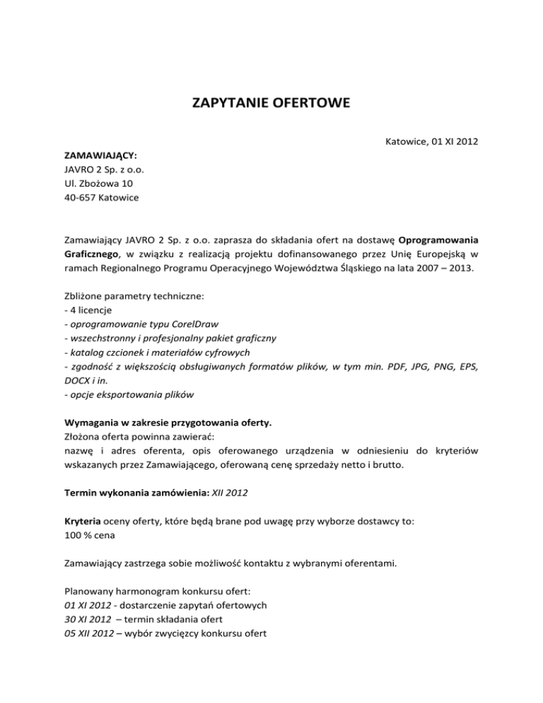 ZAPYTANIE OFERTOWE Katowice, 01 XI 2012 ZAMAWIAJĄCY: JAVRO 2 Sp. z o.o. Ul. Zbożowa 10 40-657 Katowice Zamawiający JAVRO 2 Sp. z o.o. zaprasza do składania ofert na dostawę Oprogramowania Graficznego, w związku z realizacją projektu dofinansowanego przez Unię Europejską w ramach Regionalnego Programu Operacyjnego Województwa Śląskiego na lata 2007 – 2013. Zbliżone parametry techniczne: - 4 licencje - oprogramowanie typu CorelDraw - wszechstronny i profesjonalny pakiet graficzny - katalog czcionek i materiałów cyfrowych - zgodność z większością obsługiwanych formatów plików, w tym min. PDF, JPG, PNG, EPS, DOCX i in. - opcje eksportowania plików Wymagania w zakresie przygotowania oferty. Złożona oferta powinna zawierać: nazwę i adres oferenta, opis oferowanego urządzenia w odniesieniu do kryteriów wskazanych przez Zamawiającego, oferowaną cenę sprzedaży netto i brutto. Termin wykonania zamówienia: XII 2012 Kryteria oceny oferty, które będą brane pod uwagę przy wyborze dostawcy to: 100 % cena Zamawiający zastrzega sobie możliwość kontaktu z wybranymi oferentami. Planowany harmonogram konkursu ofert: 01 XI 2012 - dostarczenie zapytań ofertowych 30 XI 2012 – termin składania ofert 05 XII 2012 – wybór zwycięzcy konkursu ofert Termin składania ofert. Odpowiedzi na zapytanie ofertowe będą przyjmowane do dnia 30 XI 2012 do godziny 12:00 Pod uwagę będą brane oferty, które wpłyną do biura zamawiającego w w/w terminie. Odpowiedź na zapytanie ofertowe można przesłać następująco: a) na adres e-mail: [email protected] lub [email protected] b) osobiście w siedzibie spółki Dodatkowe wymagania. Zamawiający zastrzega sobie prawo do odmowy przyjęcia dostarczonej oferty, do zmiany warunków konkursu oraz do unieważnienia opublikowanego zaproszenia do składania ofert w dowolnej chwili procedury konkursowej. Zamawiający: Jacek Wrodarczyk Prezes Zarządu