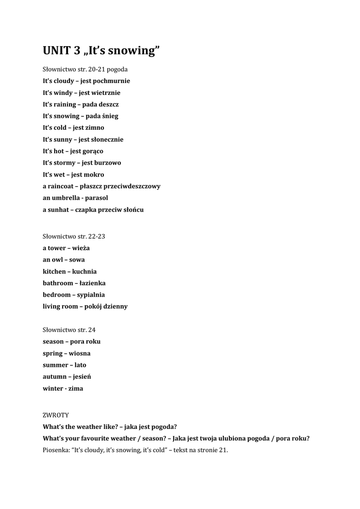 UNIT 3 „It’s snowing” Słownictwo str. 20-21 pogoda It’s cloudy – jest pochmurnie It’s windy – jest wietrznie It’s raining – pada deszcz It’s snowing – pada śnieg It’s cold – jest zimno It’s sunny – jest słonecznie It’s hot – jest gorąco It’s stormy – jest burzowo It’s wet – jest mokro a raincoat – płaszcz przeciwdeszczowy an umbrella - parasol a sunhat – czapka przeciw słońcu Słownictwo str. 22-23 a tower – wieża an owl – sowa kitchen – kuchnia bathroom – łazienka bedroom – sypialnia living room – pokój dzienny Słownictwo str. 24 season – pora roku spring – wiosna summer – lato autumn – jesień winter - zima ZWROTY What’s the weather like? – jaka jest pogoda? What’s your favourite weather / season? – Jaka jest twoja ulubiona pogoda / pora roku? Piosenka: “It’s cloudy, it’s snowing, it’s cold” – tekst na stronie 21.