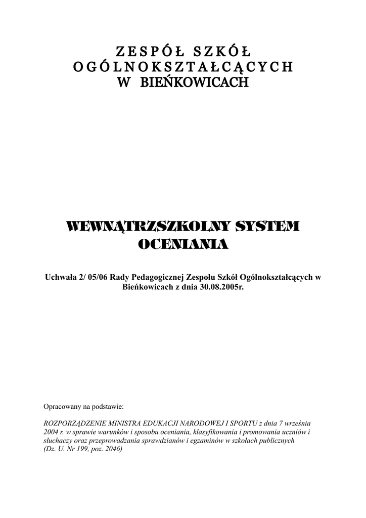 ZESPÓŁ SZKÓŁ OGÓLNOKSZTAŁCĄCYCH W BIEŃKOWICACH WEWNĄTRZSZKOLNY SYSTEM OCENIANIA Uchwała 2/ 05/06 Rady Pedagogicznej Zespołu Szkół Ogólnokształcących w Bieńkowicach z dnia 30.08.2005r. Opracowany na podstawie: ROZPORZĄDZENIE MINISTRA EDUKACJI NARODOWEJ I SPORTU z dnia 7 września 2004 r. w sprawie warunków i sposobu oceniania, klasyfikowania i promowania uczniów i słuchaczy oraz przeprowadzania sprawdzianów i egzaminów w szkołach publicznych (Dz. U. Nr 199, poz. 2046) CELE I ZASADY OCENIANIA WEWNĄTRZSZKOLNEGO § 1. 1. Ocenianiu podlegają: 1) osiągnięcia edukacyjne ucznia; 2) zachowanie ucznia. 2. Ocenianie osiągnięć edukacyjnych ucznia polega na rozpoznawaniu przez nauczycieli poziomu i postępów w opanowaniu przez ucznia wiadomości i umiejętności w stosunku do wymagań edukacyjnych wynikających z podstawy programowej, określonej w odrębnych przepisach, i realizowanych w szkole programów nauczania, uwzględniających tę podstawę. 3. Ocenianie zachowania ucznia polega na rozpoznawaniu przez wychowawcę klasy, nauczycieli oraz uczniów danej klasy stopnia respektowania przez ucznia zasad współżycia społecznego i norm etycznych. § 2. 1. Ocenianie osiągnięć edukacyjnych i zachowania ucznia odbywa się w ramach oceniania wewnątrzszkolnego. 2. Ocenianie wewnątrzszkolne ma na celu: 1) informowanie ucznia o poziomie jego osiągnięć edukacyjnych i jego zachowaniu oraz o postępach w tym zakresie; 2) udzielanie uczniowi pomocy w samodzielnym planowaniu swojego rozwoju; 3) motywowanie ucznia do dalszych postępów w nauce i zachowaniu; 4) dostarczenie rodzicom (prawnym opiekunom) i nauczycielom informacji o postępach, trudnościach w nauce, zachowaniu oraz specjalnych uzdolnieniach ucznia; 5) umożliwienie nauczycielom doskonalenia organizacji i metod pracy dydaktyczno - wychowawczej. 3. Ocenianie wewnątrzszkolne obejmuje: 1) formułowanie przez nauczycieli wymagań edukacyjnych niezbędnych do uzyskania poszczególnych śródrocznych i rocznych ocen klasyfikacyjnych z obowiązkowych i dodatkowych zajęć edukacyjnych; 2) ustalanie kryteriów oceniania zachowania; 3) ocenianie bieżące i ustalanie śródrocznych ocen klasyfikacyjnych z obowiązkowych i dodatkowych zajęć edukacyjnych oraz śródrocznej oceny klasyfikacyjnej zachowania, według skali i w formach określonych w § 11 ust. 1, § 12 ust. 3. i § 20. 4) przeprowadzanie egzaminów klasyfikacyjnych; 5) ustalanie rocznych ocen klasyfikacyjnych z obowiązkowych i dodatkowych zajęć edukacyjnych oraz rocznej oceny klasyfikacyjnej zachowania, według skali, o której mowa w § 11 ust. 1 i § 12 ust. 3 i § 20; 6) ustalanie warunków i trybu uzyskania wyższych niż przewidywane rocznych ocen klasyfikacyjnych z obowiązkowych i dodatkowych zajęć edukacyjnych oraz rocznej oceny klasyfikacyjnej zachowania; 7) ustalanie warunków i sposobu przekazywania rodzicom (prawnym opiekunom) informacji o postępach i trudnościach ucznia w nauce. WYMAGANIA EDUKACYJNE § 3. 1. Nauczyciele prowadzący zajęcia edukacyjne na pierwszej godzinie danych zajęć w roku szkolnym informują uczniów o: 2 1) wymaganiach edukacyjnych niezbędnych do uzyskania poszczególnych śródrocznych i rocznych ocen klasyfikacyjnych z obowiązkowych i dodatkowych zajęć edukacyjnych, wynikających z realizowanego przez siebie programu nauczania; 2) sposobach sprawdzania osiągnięć edukacyjnych uczniów; 3) warunkach i trybie uzyskania wyższej niż przewidywana rocznej oceny klasyfikacyjnej z obowiązkowych i dodatkowych zajęć edukacyjnych. 2. Wymagania edukacyjne, o których mowa w ust.1, pkt 1, znajdują się do wglądu na gazetkach ściennych i w bibliotece. 3. Wychowawca klasy na początku każdego roku szkolnego informuje uczniów (na pierwszej godzinie do dyspozycji wychowawcy) oraz ich rodziców lub prawnych opiekunów (na pierwszym spotkaniu rodziców z wychowawcą) o warunkach i sposobie oraz kryteriach oceniania zachowania oraz o warunkach i trybie uzyskania wyższej niż przewidywana rocznej oceny klasyfikacyjnej z zajęć edukacyjnych i zachowania. 4. O fakcie zapoznania się przez uczniów i rodziców z wymaganiami edukacyjnymi i kryteriami oceniania zachowania świadczą zapisy w dziennikach lekcyjnych (tematy lekcji, tematyka spotkań z rodzicami). § 4. 1. Oceny są jawne dla ucznia i jego rodziców (prawnych opiekunów). 1) Każda ocena wpisywana jest przez nauczyciela prowadzącego zajęcia dydaktyczne do dziennika lekcyjnego i dzienniczka lub zeszytu przedmiotowego ucznia. 2) Rodzic zapoznaje się z ocenami ucznia kontrolując jego dzienniczek i poświadczając podpisem fakt zapoznania się z ocenami oraz na spotkaniach z wychowawcą. 2. Na wniosek ucznia lub jego rodziców (prawnych opiekunów) nauczyciel uzasadnia ustaloną ocenę adekwatnie do formy wniosku (ustnie lub pisemnie). 3. Na wniosek ucznia lub jego rodziców (prawnych opiekunów), sprawdzone i ocenione pisemne prace kontrolne oraz inna dokumentacja dotycząca oceniania ucznia jest udostępniana uczniowi lub jego rodzicom (prawnym opiekunom) przez nauczycieli prowadzących zajęcia dydaktyczne na bieżąco lub przez wychowawcę klasy na spotkaniach z rodzicami. § 5. 1. Nauczyciel jest obowiązany, na podstawie opinii publicznej poradni psychologiczno - pedagogicznej, w tym publicznej poradni specjalistycznej, dostosować wymagania edukacyjne, o których mowa w § 3 ust. 1 pkt 1, do indywidualnych potrzeb psychofizycznych i edukacyjnych ucznia, u którego stwierdzono zaburzenia i odchylenia rozwojowe lub specyficzne trudności w uczeniu się, uniemożliwiające sprostanie tym wymaganiom, z zastrzeżeniem ust. 2 i 3. 2. Dostosowanie wymagań edukacyjnych, o których mowa w § 3 ust. 1 pkt 1, do indywidualnych potrzeb psychofizycznych i edukacyjnych ucznia, u którego stwierdzono specyficzne trudności w uczeniu się, uniemożliwiające sprostanie tym wymaganiom, następuje także na podstawie opinii niepublicznej poradni psychologiczn