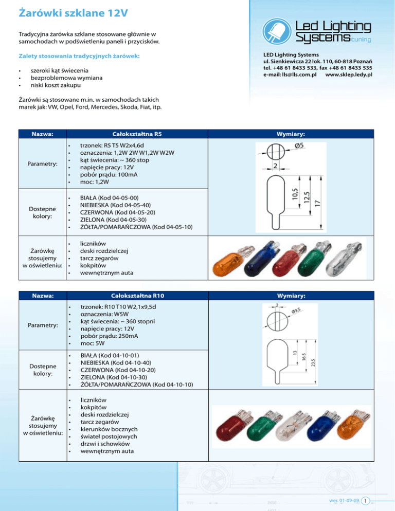 Żarówki szklane 12V Tradycyjna żarówka szklane stosowane głównie w samochodach w podświetleniu paneli i przycisków. Zalety stosowania tradycyjnych żarówek: • • • szeroki kąt świecenia bezproblemowa wymiana niski koszt zakupu LED Lighting Systems ul. Sienkiewicza 22 lok. 110, 60-818 Poznań tel. +48 61 8433 533, fax +48 61 8433 535 e-mail: [email protected] www.sklep.ledy.pl Żarówki są stosowane m.in. w samochodach takich marek jak: VW, Opel, Ford, Mercedes, Skoda, Fiat, itp. Nazwa: Całokształtna R5 Parametry: • • • • • • trzonek: R5 T5 W2x4,6d oznaczenia: 1,2W 2W W1,2W W2W kąt świecenia: ~ 360 stop napięcie pracy: 12V pobór prądu: 100mA moc: 1,2W Dostepne kolory: • • • • • BIAŁA (Kod 04-05-00) NIEBIESKA (Kod 04-05-40) CZERWONA (Kod 04-05-20) ZIELONA (Kod 04-05-30) ŻÓŁTA/POMARAŃCZOWA (Kod 04-05-10) • • Żarówkę stosujemy • w oświetleniu: • • Nazwa: liczników deski rozdzielczej tarcz zegarów kokpitów wewnętrznym auta Całokształtna R10 Parametry: • • • • • • trzonek: R10 T10 W2,1x9,5d oznaczenia: W5W kąt świecenia: ~ 360 stopni napięcie pracy: 12V pobór prądu: 250mA moc: 5W Dostepne kolory: • • • • • BIAŁA (Kod 04-10-01) NIEBIESKA (Kod 04-10-40) CZERWONA (Kod 04-10-20) ZIELONA (Kod 04-10-30) ŻÓŁTA/POMARAŃCZOWA (Kod 04-10-10) • • • Żarówkę • stosujemy • w oświetleniu: • • • Wymiary: Wymiary: liczników kokpitów deski rozdzielczej tarcz zegarów kierunków bocznych świateł postojowych drzwi i schowków wewnętrznym auta wer. 01-09-09 1 LED Lighting Systems ul. Sienkiewicza 22 lok. 110, 60-818 Poznań tel. +48 61 8433 533, fax +48 61 8433 535 e-mail: [email protected] www.sklep.ledy.pl Nazwa: Mini 3x7mm z wąsami Parametry: • • • • • rozmiar: 3x7mm z tzw. wąsami, drucikami kąt świecenia: ~ 360 stop napięcie pracy: 12V pobór prądu: 50mA moc: 0,6W Dostepne kolory: • • • • • BIAŁA (Kod 04-03-04) NIEBIESKA (Kod 04-03-44) CZERWONA (Kod 04-03-24) ZIELONA (Kod 04-03-34) ŻÓŁTA/POMARAŃCZOWA (Kod 04-03-14) • • Żarówkę • stosujemy w oświetleniu: • • Nazwa: pokręteł przycisków przełączników wyświetlaczy LCD w radiach samochodowych Mini 4x10mm z wąsami Parametry: • • • • • rozmiar: 4x10mm z tzw. wąsami, drucikami kąt świecenia: ~ 360 stop napięcie pracy: 12V pobór prądu: 100mA moc: 1,2W Dostepne kolory: • • • • • BIAŁA (Kod 04-04-00) NIEBIESKA (Kod 04-04-40) CZERWONA (Kod 04-04-20) ZIELONA (Kod 04-04-30) ŻÓŁTA/POMARAŃCZOWA (Kod 04-04-10) • Żarówkę • stosujemy • w oświetleniu: • • Wymiary: Wymiary: pokręteł przycisków przełączników wyświetlaczy LCD w radiach samochodowych wer. 01-09-09 2