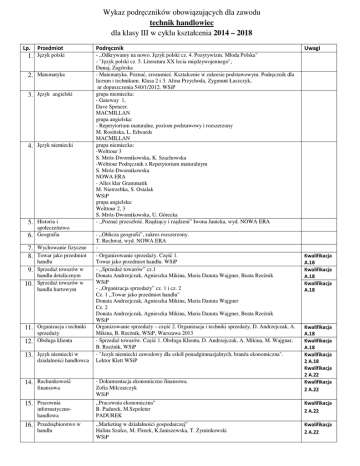 Wykaz podręczników obowiązujących dla zawodu technik handlowiec dla klasy III w cyklu kształcenia 2014 – 2018 Lp. Przedmiot 1. Język polski 2. Matematyka 3. Język angielski 4. Język niemiecki 5. Historia i Podręcznik Uwagi - „Odkrywamy na nowo. Język polski cz. 4. Pozytywizm. Młoda Polska" - "Język polski cz. 5. Literatura XX lecia międzywojennego", Dunaj, Zagórska - Matematyka. Poznać, zrozumieć. Kształcenie w zakresie podstawowym. Podręcznik dla liceum i technikum. Klasa 2 i 3. Alina Przychoda, Zygmunt Łaszczyk, nr dopuszczenia 540/1/2012. WSiP grupa niemiecka: - Gateway 1, Dave Spencer. MACMILLAN grupa angielska: - Repetytorium maturalne, poziom podstawowy i rozszerzony M. Rosińska, L. Edwards MACMILLAN grupa niemiecka: -Welttour 3 S. Mróz-Dwornikowska, K. Szachowska -Welttour Podręcznik z Repetytorium maturalnym S. Mróz-Dwornikowska NOWA ERA - Alles klar Grammatik M. Nietrzebka, S. Ostalak WSiP grupa angielska: Welttour 2, 3 S. Mróz-Dwornikowska, U. Górecka - ,,Poznać przeszłość. Rządzący i rządzeni” Iwona Janicka, wyd. NOWA ERA społeczeństwo 6. Geografia 7. Wychowanie fizyczne 8. Towar jako przedmiot 9. 10. handlu Sprzedaż towarów w handlu detalicznym Sprzedaż towarów w handlu hurtowym 11. Organizacja i techniki 12. sprzedaży Obsługa klienta 13. Język niemiecki w działalności handlowca 14. Rachunkowość finansowa 15. Pracownia informatycznohandlowa 16. Przedsiębiorstwo w handlu - „Oblicza geografii”, zakres rozszerzony. T. Rechwat, wyd. NOWA ERA - Organizowanie sprzedaży. Część 1. Towar jako przedmiot handlu. WSiP - ,,Sprzedaż towarów” cz.1 Donata Andrzejczak, Agnieszka Mikina, Maria Danuta Wajgner, Beata Rzeźnik WSiP - ,,Organizacja sprzedaży” cz. 1 i cz. 2 Cz. 1 ,,Towar jako przedmiot handlu” Donata Andrzejczak, Agnieszka Mikina, Maria Danuta Wajgner Cz. 2 Donata Andrzejczak, Agnieszka Mikina, Maria Danuta Wajgner, Beata Rzeźnik WSiP Organizowanie sprzedaży – część 2. Organizacja i techniki sprzedaży, D. Andrzejczak, A. Mikina, B. Rzeźnik, WSiP, Warszawa 2013 - Sprzedaż towarów. Część 1. Obsługa Klienta, D. Andrzejczak, A. Mikina, M. Wajgnar, B. Rzeźnik, WSiP - "Jezyk niemiecki zawodowy dla szkół ponadgimnazjalnych, branża ekonomiczna". Lektor Klett WSiP - Dokumentacja ekonomiczno finansowa. Zofia Milczarczyk WSiP Kwalifikacja A.18 Kwalifikacja A.18 Kwalifikacja A.18 Kwalifikacja A.18 Kwalifikacja A.18 Kwalifikacja 2 A.18 Kwalifikacja 2 A.22 Kwalifikacja 2 A.22 ,,Pracownia ekonomiczna” B. Padurek, M.Szpoleter PADUREK Kwalifikacja 2 A.22 ,,Marketing w działalności gospodarczej” Halina Szulce, M. Florek, K.Janiszewska, T. Żyminkowski WSiP Kwalifikacja 2 A.22