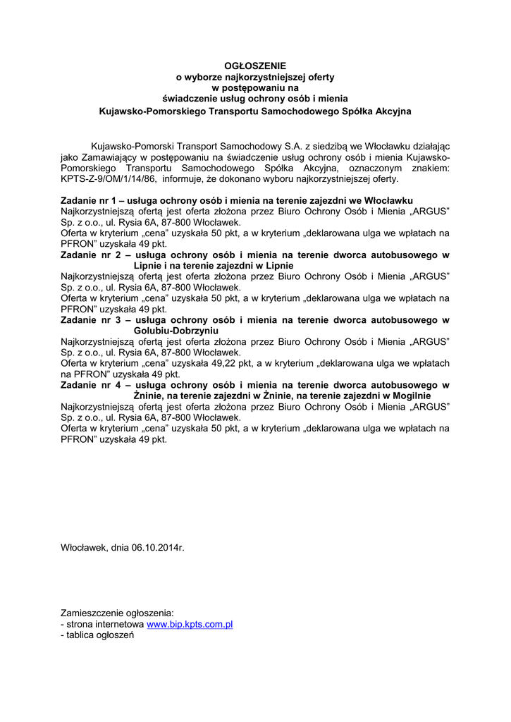 OGŁOSZENIE o wyborze najkorzystniejszej oferty w postępowaniu na świadczenie usług ochrony osób i mienia Kujawsko-Pomorskiego Transportu Samochodowego Spółka Akcyjna Kujawsko-Pomorski Transport Samochodowy S.A. z siedzibą we Włocławku działając jako Zamawiający w postępowaniu na świadczenie usług ochrony osób i mienia KujawskoPomorskiego Transportu Samochodowego Spółka Akcyjna, oznaczonym znakiem: KPTS-Z-9/OM/1/14/86, informuje, że dokonano wyboru najkorzystniejszej oferty. Zadanie nr 1 – usługa ochrony osób i mienia na terenie zajezdni we Włocławku Najkorzystniejszą ofertą jest oferta złożona przez Biuro Ochrony Osób i Mienia „ARGUS” Sp. z o.o., ul. Rysia 6A, 87-800 Włocławek. Oferta w kryterium „cena” uzyskała 50 pkt, a w kryterium „deklarowana ulga we wpłatach na PFRON” uzyskała 49 pkt. Zadanie nr 2 – usługa ochrony osób i mienia na terenie dworca autobusowego w Lipnie i na terenie zajezdni w Lipnie Najkorzystniejszą ofertą jest oferta złożona przez Biuro Ochrony Osób i Mienia „ARGUS” Sp. z o.o., ul. Rysia 6A, 87-800 Włocławek. Oferta w kryterium „cena” uzyskała 50 pkt, a w kryterium „deklarowana ulga we wpłatach na PFRON” uzyskała 49 pkt. Zadanie nr 3 – usługa ochrony osób i mienia na terenie dworca autobusowego w Golubiu-Dobrzyniu Najkorzystniejszą ofertą jest oferta złożona przez Biuro Ochrony Osób i Mienia „ARGUS” Sp. z o.o., ul. Rysia 6A, 87-800 Włocławek. Oferta w kryterium „cena” uzyskała 49,22 pkt, a w kryterium „deklarowana ulga we wpłatach na PFRON” uzyskała 49 pkt. Zadanie nr 4 – usługa ochrony osób i mienia na terenie dworca autobusowego w Żninie, na terenie zajezdni w Żninie, na terenie zajezdni w Mogilnie Najkorzystniejszą ofertą jest oferta złożona przez Biuro Ochrony Osób i Mienia „ARGUS” Sp. z o.o., ul. Rysia 6A, 87-800 Włocławek. Oferta w kryterium „cena” uzyskała 50 pkt, a w kryterium „deklarowana ulga we wpłatach na PFRON” uzyskała 49 pkt. Włocławek, dnia 06.10.2014r. Zamieszczenie ogłoszenia: - strona internetowa www.bip.kpts.com.pl - tablica ogłoszeń