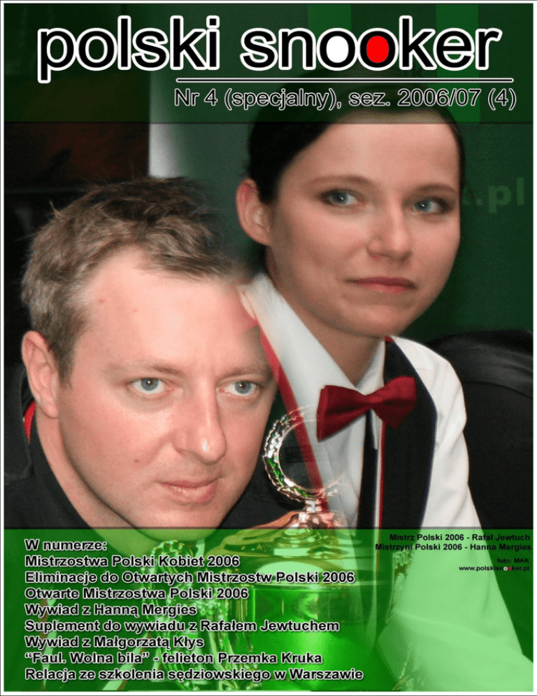 Nr 4, 2006/07 (04) 1 Nr 4, 2006/07 (04) Internetowa gazeta od sympatyków dla sympatyków Nr 4, 2006/07 (04) Spis treści 1. Od redakcji.................................................................................................................................3 2. Mistrzostwa Polski Kobiet..........................................................................................................3 a. informacje ogólne.............................................................................................................................3 b. lista zgłoszonych zawodniczek.........................................................................................................4 c. wyniki meczów grupowych...............................................................................................................4 d. wyniki 1/2 finału...............................................................................................................................4 e. wynik finału......................................................................................................................................5 f. lista najwyższych brejków.................................................................................................................5 g. po turnieju powiedziały....................................................................................................................5 h. okiem organizatora..........................................................................................................................5 i. podsumowanie..................................................................................................................................6 3. Eliminacje i Otwarte Mistrzostwa Polski...................................................................................7 a. informacje ogólne.............................................................................................................................7 b. lista zawodników zgłoszonych do eliminacji do Otwartych Mistrzostw Polski.................................7 c. wyniki najlepszych 48 w eliminacjach..............................................................................................9 d. wyniki najlepszych 32 w eliminacjach..............................................................................................9 e. wyniki najlepszych 24 w eliminacjach..............................................................................................9 f. wyniki 1/8 finału eliminacji...............................................................................................................9 g. wyniki 1/4 finału eliminacji............................................................................................................10 h. awans z eliminacji uzyskali............................................................................................................10 i. lista najwyższych brejków eliminacji...............................................................................................10 j. lista zawodników biorących udział w Otwartych Mistrzostwach Polski..........................................10 k. wyniki meczów grupowych turnieju głównego...............................................................................11 l. wyniki 1/8 finału turnieju głównego................................................................................................12 m. wyniki 1/4 finału turnieju głównego..............................................................................................13 n. wyniki 1/2 finału turnieju głównego...............................................................................................13 o. wynik finału Otwartych Mistrzostw Polski 2006............................................................................13 p. lista najwyższych brejków turnieju głównego................................................................................14 r. po Otwartych Mistrzostwach Polski 2006 powiedzieli....................................................................14 s. okiem organizatora.........................................................................................................................15 t. ranking po Otwartych Mistrzostwach Polski 2006.........................................................................16 u. podsumowanie...............................................................................................................................17 5. Sylwetki zawodników................................................................................................................19 a. wywiad z Mistrzynią Polski, Hanną Mergies..................................................................................19 b. wywiad z Mistrzynią Świata w grze deblowej, Małgorzatą Kłys.....................................................23 6. Kącik felietonowy Przemka Kruka...........................................................................................26 7. Kącik sędziowski......................................................................................................................28 8. Szkolenie sędziowskie, 6-7 maj 2006, Warszawa.....................................................................29 9. Zapowiedzi................................................................................................................................30 10. Redakcja.................................................................................................................................30 11. Lista stosowanych skrótów.....................................................................................................31 2 Nr 4, 2006/07 (04) 1. Od redakcji Ten numer jest szczególny. Nie tylko dlatego, że traktuje tylko o sprawach mistrzowskich. Również jego konstrukcja jest nietypowa, ponieważ jako pierwszą umieściliśmy relację z Mistrzostw Polski Kobiet. Odbywa