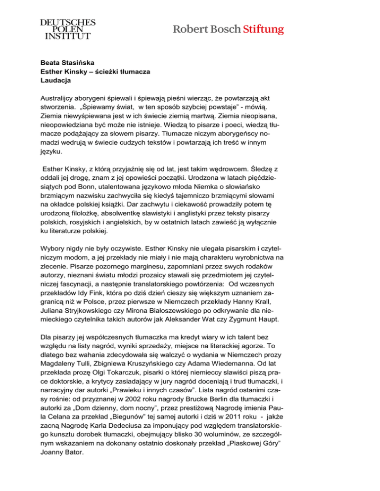 Beata Stasińska Esther Kinsky – ścieŜki tłumacza Laudacja Australijcy aborygeni śpiewali i śpiewają pieśni wierząc, Ŝe powtarzają akt stworzenia. „Śpiewamy świat, w ten sposób szybciej powstaje” - mówią. Ziemia niewyśpiewana jest w ich świecie ziemią martwą. Ziemia nieopisana, nieopowiedziana być moŜe nie istnieje. Wiedzą to pisarze i poeci, wiedzą tłumacze podąŜający za słowem pisarzy. Tłumacze niczym aborygeńscy nomadzi wedrują w świecie cudzych tekstów i powtarzają ich treść w innym języku. Esther Kinsky, z którą przyjaźnię się od lat, jest takim wędrowcem. Śledzę z oddali jej drogę, znam z jej opowieści początki. Urodzona w latach pięćdziesiątych pod Bonn, utalentowana językowo młoda Niemka o słowiańsko brzmiącym nazwisku zachwyciła się kiedyś tajemniczo brzmiącymi słowami na okładce polskiej ksiąŜki. Dar zachwytu i ciekawość prowadziły potem tę urodzoną filoloŜkę, absolwentkę slawistyki i anglistyki przez teksty pisarzy polskich, rosyjskich i angielskich, by w ostatnich latach zawieść ją wyłącznie ku literaturze polskiej. Wybory nigdy nie były oczywiste. Esther Kinsky nie ulegała pisarskim i czytelniczym modom, a jej przekłady nie miały i nie mają charakteru wyrobnictwa na zlecenie. Pisarze pozornego marginesu, zapomniani przez swych rodaków autorzy, nieznani światu młodzi prozaicy stawali się przedmiotem jej czytelniczej fascynacji, a następnie translatorskiego powtórzenia: Od wczesnych przekładów Idy Fink, która po dziś dzień cieszy się większym uznaniem zagranicą niŜ w Polsce, przez pierwsze w Niemczech przekłady Hanny Krall, Juliana Stryjkowskiego czy Mirona Białoszewskiego po odkrywanie dla niemieckiego czytelnika takich autorów jak Aleksander Wat czy Zygmunt Haupt. Dla pisarzy jej współczesnych tłumaczka ma kredyt wiary w ich talent bez względu na listy nagród, wyniki sprzedaŜy, miejsce na literackiej agorze. To dlatego bez wahania zdecydowała się walczyć o wydania w Niemczech prozy Magdaleny Tulli, Zbigniewa Kruszyńskiego czy Adama Wiedemanna. Od lat przekłada prozę Olgi Tokarczuk, pisarki o której niemieccy slawiści piszą prace doktorskie, a krytycy zasiadający w jury nagród doceniają i trud tłumaczki, i narracyjny dar autorki „Prawieku i innych czasów”. Lista nagród ostanimi czasy rośnie: od przyznanej w 2002 roku nagrody Brucke Berlin dla tłumaczki i autorki za „Dom dzienny, dom nocny”, przez prestiŜową Nagrodę imienia Paula Celana za przekład „Biegunów” tej samej autorki i dziś w 2011 roku - jakŜe zacną Nagrodę Karla Dedeciusa za imponujący pod względem translatorskiego kunsztu dorobek tłumaczki, obejmujący blisko 30 woluminów, ze szczególnym wskazaniem na dokonany ostatnio doskonały przekład „Piaskowej Góry” Joanny Bator. Esther Kinsky staje się w Niemczech pewnego rodzaju instytucją. Zwracają się do niej redaktorzy i wydawcy poszukujący zarówno nowych talentów literackich w Polsce, jak i zapomnianych gigantów literatury. Znają ten znak wodny: nieoczywistość wyboru, czytelnicza wraŜliwość na to, co stanowi kwintesencję literatury środkowoeuropejskiej, z jej wielokulturowym, wieloetnicznym bogactwem i szczególną historyczną narracją. Esther Kinsky nie pozwala jednak zamykać literatury z tej części Europy w hermetycznym pokoju z ksiąŜkami. Nie zgadza się na naduŜywaną etykietę niezrozumiałości. Odnajduje w niej i dobija się o uznanie jej uniwersalnego wymiaru. Ta uwaŜna czytelniczka jest równieŜ doświadczoną redaktorką. Wielokrotnie byłam świadkiem, gdy dla dobra tekstu udawało się jej przekonać autora do zmian w miejscach, w których polski redaktor poniósł wcześniej poraŜkę. Wielokrotnie jej czytanie polskiej literatury współczesnej, Ŝeby nie powiedzieć literatury środkowoeuropejskiej, okazywało się świeŜe i odkrywcze, a dla mnie zawsze inspirujące i bardzo pomocne w moich wydawniczych decyzjach. Poszukujący i twórczy duch prowadził i prowadzi Esther Kinsky przez róŜne doświadczenia, miejsca, środowiska, języki. Niemcy, Kanada, Anglia, węgierska prowincja i ostatni przystanek – Berlin. Kolejne ksiąŜki w przekładach, dwie powieści, ksiąŜeczki dla dzieci i ogromne, rosnące z kaŜdym rokiem archiwum fotograficzne. Wraz z tłumaczką wedruje jej biblioteka, blisko w połowie polska, w części węgierska, choć Kinsky nie zaczęła jeszcze mimo swego uznania dla tej literatury, tłumaczyć z węgierskiego. Ta kosmopolitka w kaŜdym kraju, w którym zdecyduje się zamieszkać, zachowuje się jak odpowiedzialna obywatelka. Cudzoziemka, która kibicuje polskiej Solidarności, martwi się o los węgierskiej demokracji, chodzi na antyfaszystowskie manifestacje w Berlinie. Tłumaczy „Pierścień z papieru” Zygmunta Haupta w wiejskim domu na granicy rumuńsko-węgierskiej, po czym wyrusza w kolejna podróŜ po Banacie, by poddać w wątpliwość to, co przeciętny Europejczyk uznaje za granice Europy. Czyta, tłumaczy, by zrozumieć i by zrozumieli inni. Wędruj dalej, Esther, nie przestawaj, proszę. Seite 2
