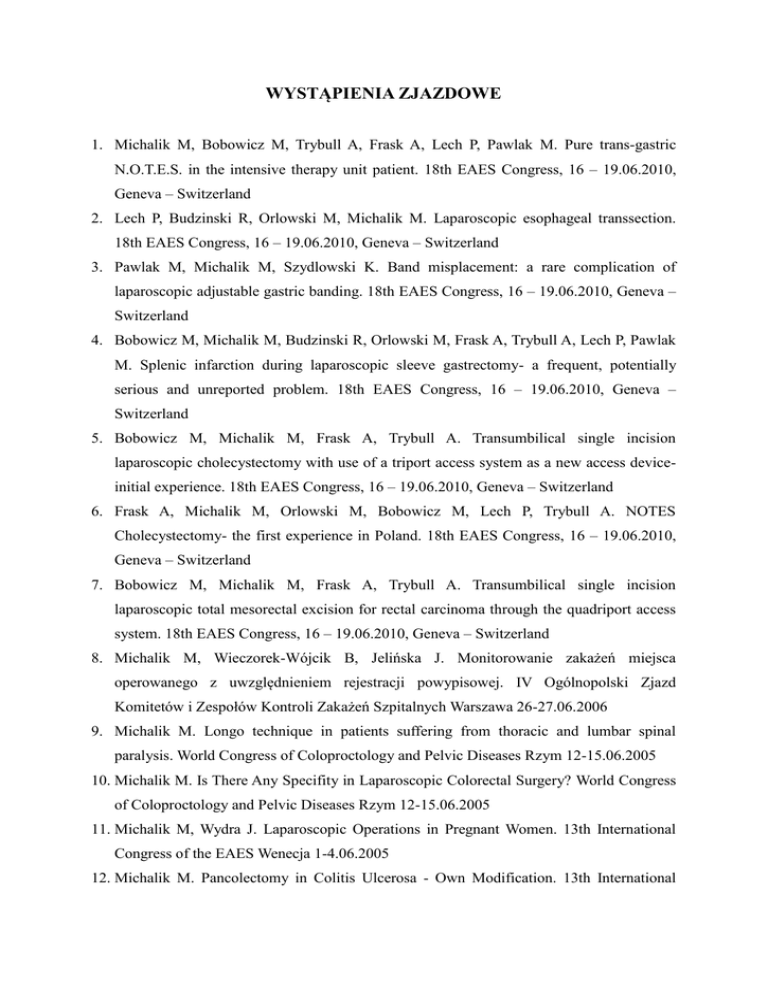 WYSTĄPIENIA ZJAZDOWE 1. Michalik M, Bobowicz M, Trybull A, Frask A, Lech P, Pawlak M. Pure trans-gastric N.O.T.E.S. in the intensive therapy unit patient. 18th EAES Congress, 16 – 19.06.2010, Geneva – Switzerland 2. Lech P, Budzinski R, Orlowski M, Michalik M. Laparoscopic esophageal transsection. 18th EAES Congress, 16 – 19.06.2010, Geneva – Switzerland 3. Pawlak M, Michalik M, Szydlowski K. Band misplacement: a rare complication of laparoscopic adjustable gastric banding. 18th EAES Congress, 16 – 19.06.2010, Geneva – Switzerland 4. Bobowicz M, Michalik M, Budzinski R, Orlowski M, Frask A, Trybull A, Lech P, Pawlak M. Splenic infarction during laparoscopic sleeve gastrectomy- a frequent, potentially serious and unreported problem. 18th EAES Congress, 16 – 19.06.2010, Geneva – Switzerland 5. Bobowicz M, Michalik M, Frask A, Trybull A. Transumbilical single incision laparoscopic cholecystectomy with use of a triport access system as a new access deviceinitial experience. 18th EAES Congress, 16 – 19.06.2010, Geneva – Switzerland 6. Frask A, Michalik M, Orlowski M, Bobowicz M, Lech P, Trybull A. NOTES Cholecystectomy- the first experience in Poland. 18th EAES Congress, 16 – 19.06.2010, Geneva – Switzerland 7. Bobowicz M, Michalik M, Frask A, Trybull A. Transumbilical single incision laparoscopic total mesorectal excision for rectal carcinoma through the quadriport access system. 18th EAES Congress, 16 – 19.06.2010, Geneva – Switzerland 8. Michalik M, Wieczorek-Wójcik B, Jelińska J. Monitorowanie zakażeń miejsca operowanego z uwzględnieniem rejestracji powypisowej. IV Ogólnopolski Zjazd Komitetów i Zespołów Kontroli Zakażeń Szpitalnych Warszawa 26-27.06.2006 9. Michalik M. Longo technique in patients suffering from thoracic and lumbar spinal paralysis. World Congress of Coloproctology and Pelvic Diseases Rzym 12-15.06.2005 10. Michalik M. Is There Any Specifity in Laparoscopic Colorectal Surgery? World Congress of Coloproctology and Pelvic Diseases Rzym 12-15.06.2005 11. Michalik M, Wydra J. Laparoscopic Operations in Pregnant Women. 13th International Congress of the EAES Wenecja 1-4.06.2005 12. Michalik M. Pancolectomy in Colitis Ulcerosa - Own Modification. 13th International Congress of the EAES Wenecja 1-4.06.2005 13. Michalik M. Laparoscopic Colorecal Surgery - early results. 13th International Congress of the EAES Wenecja 1-4.06.2005 14. Michalik M, Ciesielski M. Ultrasonic vs Electrocautery Dissection in Laparoscopic Cholecystectomy - prospective non-randomized study of 946 patients. 13th International Congress of the EAES Wenecja 1-4.06.2005 15. Michalik M, Ciesielski M. Scleroatrophic Gallbladder – Difficult Problem in Diagnosis and Treatment. 13th International Congress of the EAES Wenecja 1-4.06.2005 16. Michalik M, Ciesielski M. Conversion of Laparoscopic Cholecystectomy - Significant Risk Factor of Bile Duct Injury and Postoperative Complications. 13th International Congress of the EAES Wenecja 1-4.06.2005 17. Michalik M. Laparoskopowa przezrozworowa resekcja przełyku. Film z omówieniem. VII Międzynarodowe Polsko-Czecho-Słowackie Sympozjum Videochirurgii oraz XI Sympozjum Sekcji Videochirurgii Towarzystwa Chirurgów Polskich Konin-Licheń 2729.04.2005 18. Michalik M. Laparoskopowa resekcja trzonu i ogona trzustki. Film z omówieniem. VII Międzynarodowe Polsko-Czecho-Słowackie Sympozjum Videochirurgii oraz XI Sympozjum Sekcji Videochirurgii Towarzystwa Chirurgów Polskich Konin-Licheń 2729.04.2005 19. Michalik M. Operacja Międzynarodowe Longo u pacjentów Polsko-Czecho-Słowackie z porażeniem Sympozjum kręgowym. VII Videochirurgii oraz XI Sympozjum Sekcji Videochirurgii Towarzystwa Chirurgów Polskich Konin-Licheń 2729.04.2005 20. Michalik M. Skalpel harmoniczny- urządzenie do hemostazy czy nowa jakość w chirurgii? VII Międzynarodowe Polsko-Czecho-Słowackie Sympozjum Videochirurgii oraz XI Sympozjum Sekcji Videochirurgii Towarzystwa Chirurgów Polskich KoninLicheń 27-29.04.2005 21. Michalik M. Wczesne wyniki laparoskopowych operacji jelita grubego. VII Międzynarodowe Polsko-Czesko-Słowackie Sympozjum Wideochirurgii. IX Sympozjum Sekcji Wideochirurgii Towarzystwa Chirurgów Polskich. Konin-Licheń 27-29.04.2005 22. Michalik M. Modyfikacja własna proktokolektomii laparoskopowej wykonywanej z powodu wrzodziejącego Międzynarodowe zapalenia jelita Polsko-Czecho-Słowackie grubego. Film Sympozjum z omówieniem. Videochirurgii oraz VII XI Sympozjum Sekcji Videochirurgii Towarzystwa Chirurgów Polskich Konin-Licheń 27- 29.04.2005 23. Michalik M. Laparoscopic Operations in Pregnancy. 9th International Congress of European Association of Video Surgery Gdańsk 2004 24. Michalik M. Laparoscopic Colorectal Procedures - Self Experience. 9th International Congress of European Association of Video Surgery Gdańsk 2004 25. Michalik M. Laparoscopic Repair of Perforated peptic Ulcer. 9th International Congress of European Association of Video Surgery Gdańsk 2004 26. Michalik M. Totally Laparoscopic Oesophagectomy - Self experience. 9th International Congress of European Association of Video Surgery Gdańsk 2004 27. Michalik M. Laparoscopic Operations of the Large Bowel, Own experience. 1st International Congress of the European Academy of Surgical Sciences Gdańsk 1517.09.2004 28. Wydra J, Michalik M. Laparoscopic Management of Appendicitis and Symptomatic Cholelithiasis in Pregnant Women. 1st International Congress of the European Academy of Surgical Sciences Gdańsk 15-17.09.2004 29. Orłowski M, Michalik M. Laparoscopic Repair of Perforated Peptic Ulcer. 1st International Congress of the European Academy of Surgical Sciences Gdańsk 1517.09.2004 30. Ciesielski M, Michalik M, Budziński R. Conversion of Laparoscopic Cholecystectomy Significant Risk Factor of Bile Duct Injury and Postoperative Complications. 1st International Congress of the European Academy of Surgical Sciences Gdańsk 1517.09.2004 31. Ciesielski M, Michalik M, Bu