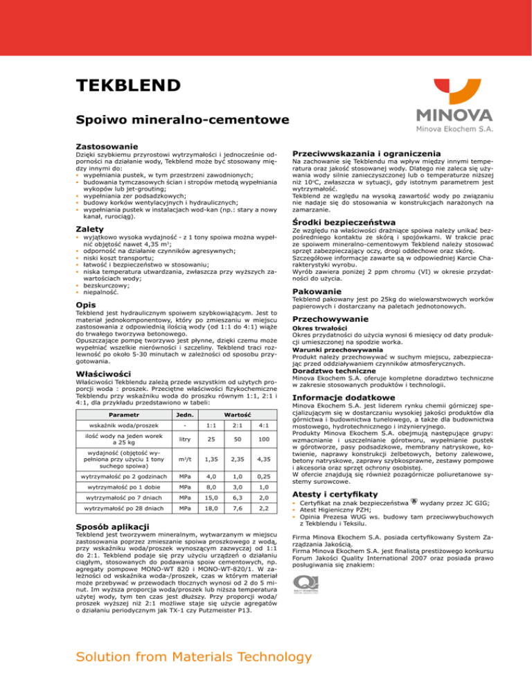tekblend Spoiwo mineralno-cementowe Zastosowanie Dzięki szybkiemu przyrostowi wytrzymałości i jednocześnie odporności na działanie wody, Tekblend może być stosowany między innymi do: wypełniania pustek, w tym przestrzeni zawodnionych; budowania tymczasowych ścian i stropów metodą wypełniania wykopów lub jet-grouting; wypełniania zer podsadzkowych; budowy korków wentylacyjnych i hydraulicznych; wypełniania pustek w instalacjach wod-kan (np.: stary a nowy kanał, rurociąg). Przeciwwskazania i ograniczenia Zalety Ze względu na właściwości drażniące spoiwa należy unikać bezpośredniego kontaktu ze skórą i spojówkami. W trakcie prac ze spoiwem mineralno-cementowym Tekblend należy stosować sprzęt zabezpieczający oczy, drogi oddechowe oraz skórę. Szczegółowe informacje zawarte są w odpowiedniej Karcie Charakterystyki wyrobu. Wyrób zawiera poniżej 2 ppm chromu (VI) w okresie przydatności do użycia. wyjątkowo wysoka wydajność - z 1 tony spoiwa można wypeł- nić objętość nawet 4,35 m ; odporność na działanie czynników agresywnych; niski koszt transportu; łatwość i bezpieczeństwo w stosowaniu; niska temperatura utwardzania, zwłaszcza przy wyższych zawartościach wody; bezskurczowy; niepalność. 3 Opis Tekblend jest hydraulicznym spoiwem szybkowiążącym. Jest to materiał jednokomponentowy, który po zmieszaniu w miejscu zastosowania z odpowiednią ilością wody (od 1:1 do 4:1) wiąże do trwałego tworzywa betonowego. Opuszczające pompę tworzywo jest płynne, dzięki czemu może wypełniać wszelkie nierówności i szczeliny. Tekblend traci rozlewność po około 5-30 minutach w zależności od sposobu przygotowania. Na zachowanie się Tekblendu ma wpływ między innymi temperatura oraz jakość stosowanej wody. Dlatego nie zaleca się używania wody silnie zanieczyszczonej lub o temperaturze niższej niż 10oC, zwłaszcza w sytuacji, gdy istotnym parametrem jest wytrzymałość. Tekblend ze względu na wysoką zawartość wody po związaniu nie nadaje się do stosowania w konstrukcjach narażonych na zamarzanie. Środki bezpieczeństwa Pakowanie Tekblend pakowany jest po 25kg do wielowarstwowych worków papierowych i dostarczany na paletach jednotonowych. Przechowywanie Okres trwałości Okres przydatności do użycia wynosi 6 miesięcy od daty produkcji umieszczonej na spodzie worka. Warunki przechowywania Produkt należy przechowywać w suchym miejscu, zabezpieczając przed oddziaływaniem czynników atmosferycznych. Doradztwo techniczne Właściwości Właściwości Tekblendu zależą przede wszystkim od użytych proporcji woda : proszek. Przeciętne właściwości fizykochemiczne Tekblendu przy wskaźniku woda do proszku równym 1:1, 2:1 i 4:1, dla przykładu przedstawiono w tabeli: Parametr Jedn. Wartość wskaźnik woda/proszek - 1:1 2:1 4:1 ilość wody na jeden worek a 25 kg litry 25 50 100 wydajność (objętość wypełniona przy użyciu 1 tony suchego spoiwa) m3/t 1,35 2,35 4,35 wytrzymałość po 2 godzinach MPa 4,0 1,0 0,25 wytrzymałość po 1 dobie MPa 8,0 3,0 1,0 wytrzymałość po 7 dniach MPa 15,0 6,3 2,0 wytrzymałość po 28 dniach MPa 18,0 7,6 2,2 Sposób aplikacji Tekblend jest tworzywem mineralnym, wytwarzanym w miejscu zastosowania poprzez zmieszanie spoiwa proszkowego z wodą, przy wskaźniku woda/proszek wynoszącym zazwyczaj od 1:1 do 2:1. Tekblend podaje się przy użyciu urządzeń o działaniu ciągłym, stosowanych do podawania spoiw cementowych, np. agregaty pompowe MONO-WT 820 i MONO-WT-820/1. W zależności od wskaźnika woda-/proszek, czas w którym materiał może przebywać w przewodach tłocznych wynosi od 2 do 5 minut. Im wyższa proporcja woda/proszek lub niższa temperatura użytej wody, tym ten czas jest dłuższy. Przy proporcji woda/ proszek wyższej niż 2:1 możliwe staje się użycie agregatów o działaniu periodycznym jak TX-1 czy Putzmeister P13. Minova Ekochem S.A. oferuje kompletne doradztwo techniczne w zakresie stosowanych produktów i technologii. Informacje dodatkowe Minova Ekochem S.A. jest liderem rynku chemii górniczej specjalizującym się w dostarczaniu wysokiej jakości produktów dla górnictwa i budownictwa tunelowego, a także dla budownictwa mostowego, hydrotechnicznego i inżynieryjnego. Produkty Minova Ekochem S.A. obejmują następujące grupy: wzmacnianie i uszczelnianie górotworu, wypełnianie pustek w górotworze, pasy podsadzkowe, membrany natryskowe, kotwienie, naprawy konstrukcji żelbetowych, betony zalewowe, betony natryskowe, zaprawy szybkosprawne, zestawy pompowe i akcesoria oraz sprzęt ochrony osobistej. W ofercie znajdują się również pozagórnicze poliuretanowe systemy surowcowe. Atesty i certyfikaty Certyfikat na znak bezpieczeństwa wydany przez JC GIG; Atest Higieniczny PZH; Opinia Prezesa WUG ws. budowy tam przeciwwybuchowych z Tekblendu i Teksilu. Firma Minova Ekochem S.A. posiada certyfikowany System Zarządzania Jakością. Firma Minova Ekochem S.A. jest finalistą prestiżowego konkursu Forum Jakości Quality International 2007 oraz posiada prawo posługiwania się znakiem: Solution from Materials Technology Minova Ekochem S.A. 41-100 Siemianowice Śląskie Ul. Budowlana 10 Poland Tel: +48 32 75 03 800 Fax: +48 32 75 03 801 E-mail: [email protected] http://www.minova.pl Edycja: styczeń 2010 Firma Minova Ekochem S.A. gwarantuje, że jej produkty są pozbawione wad materiałowych, produkcyjnych i stanowią przedmiot sprzedaży zgodnie z obowiązującymi ogólnie zasadami. Warunki sprzedaży mogą być przekazane na życzenie. Firma Minova Ekochem S.A. czyni wszelkie starania, aby porady, wskazówki, specyfikacje czy informacje były dokładne i poprawne. Wobec braku możliwości bezpośredniej lub ciągłej kontroli nad stosowaniem swoich produktów firma Minova Ekochem S.A. nie może ponosić żadnej odpowiedzialności, wynikającej bezpośrednio lub pośrednio z ich stosowania, niezależnie od tego, czy było ono zgodne lub niezgodne z 