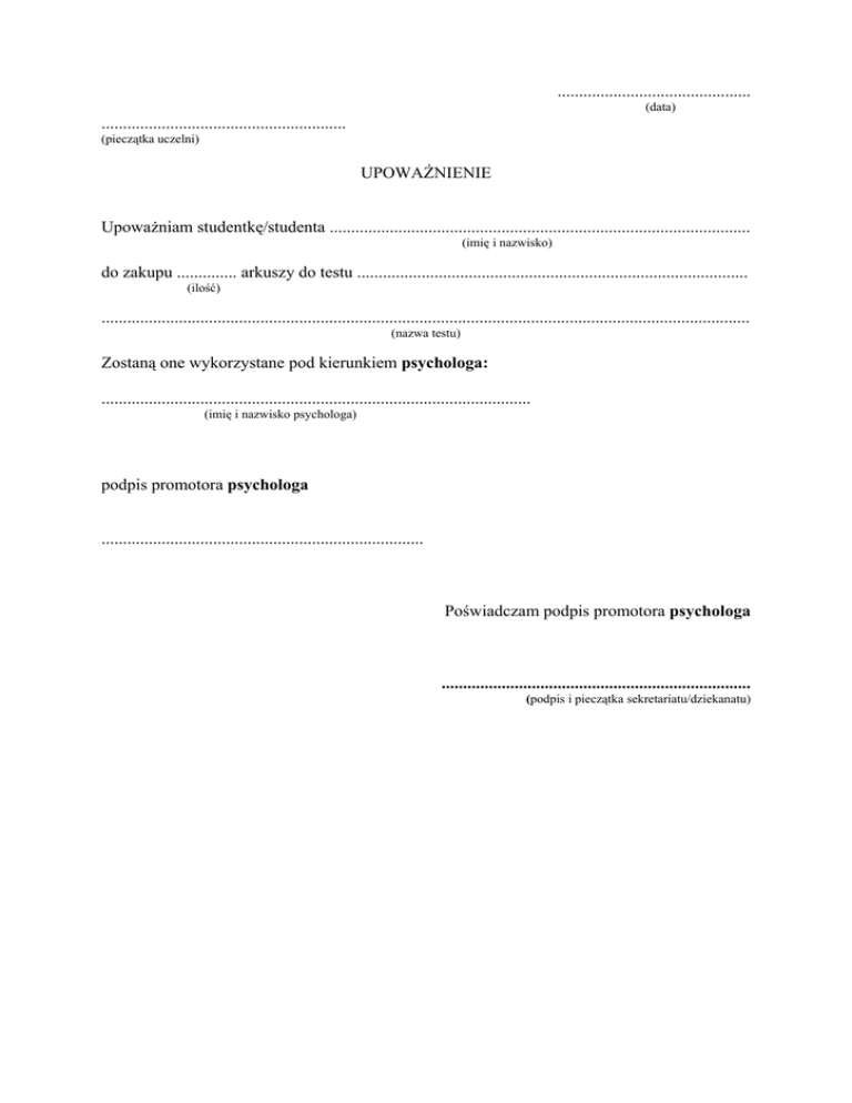 ............................................. (data) ......................................................... (pieczątka uczelni) UPOWAŻNIENIE Upoważniam studentkę/studenta .................................................................................................. (imię i nazwisko) do zakupu .............. arkuszy do testu ........................................................................................... (ilość) ....................................................................................................................................................... (nazwa testu) Zostaną one wykorzystane pod kierunkiem psychologa: .................................................................................................... (imię i nazwisko psychologa) podpis promotora psychologa ........................................................................... Poświadczam podpis promotora psychologa ........................................................................ (podpis i pieczątka sekretariatu/dziekanatu)