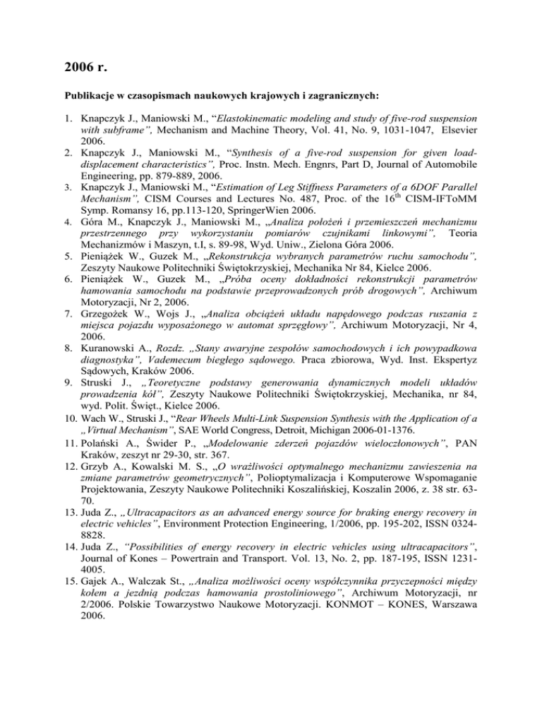 2006 r. Publikacje w czasopismach naukowych krajowych i zagranicznych: 1. Knapczyk J., Maniowski M., “Elastokinematic modeling and study of five-rod suspension with subframe”, Mechanism and Machine Theory, Vol. 41, No. 9, 1031-1047, Elsevier 2006. 2. Knapczyk J., Maniowski M., “Synthesis of a five-rod suspension for given loaddisplacement characteristics”, Proc. Instn. Mech. Engnrs, Part D, Journal of Automobile Engineering, pp. 879-889, 2006. 3. Knapczyk J., Maniowski M., “Estimation of Leg Stiffness Parameters of a 6DOF Parallel Mechanism”, CISM Courses and Lectures No. 487, Proc. of the 16th CISM-IFToMM Symp. Romansy 16, pp.113-120, SpringerWien 2006. 4. Góra M., Knapczyk J., Maniowski M., „Analiza położeń i przemieszczeń mechanizmu przestrzennego przy wykorzystaniu pomiarów czujnikami linkowymi”, Teoria Mechanizmów i Maszyn, t.I, s. 89-98, Wyd. Uniw., Zielona Góra 2006. 5. Pieniążek W., Guzek M., „Rekonstrukcja wybranych parametrów ruchu samochodu”, Zeszyty Naukowe Politechniki Świętokrzyskiej, Mechanika Nr 84, Kielce 2006. 6. Pieniążek W., Guzek M., „Próba oceny dokładności rekonstrukcji parametrów hamowania samochodu na podstawie przeprowadzonych prób drogowych”, Archiwum Motoryzacji, Nr 2, 2006. 7. Grzegożek W., Wojs J., „Analiza obciążeń układu napędowego podczas ruszania z miejsca pojazdu wyposażonego w automat sprzęgłowy”, Archiwum Motoryzacji, Nr 4, 2006. 8. Kuranowski A., Rozdz. „Stany awaryjne zespołów samochodowych i ich powypadkowa diagnostyka”, Vademecum biegłego sądowego. Praca zbiorowa, Wyd. Inst. Ekspertyz Sądowych, Kraków 2006. 9. Struski J., „Teoretyczne podstawy generowania dynamicznych modeli układów prowadzenia kół”, Zeszyty Naukowe Politechniki Świętokrzyskiej, Mechanika, nr 84, wyd. Polit. Święt., Kielce 2006. 10. Wach W., Struski J., “Rear Wheels Multi-Link Suspension Synthesis with the Application of a „Virtual Mechanism”, SAE World Congress, Detroit, Michigan 2006-01-1376. 11. Polański A., Świder P., „Modelowanie zderzeń pojazdów wieloczłonowych”, PAN Kraków, zeszyt nr 29-30, str. 367. 12. Grzyb A., Kowalski M. S., „O wrażliwości optymalnego mechanizmu zawieszenia na zmiane parametrów geometrycznych”, Polioptymalizacja i Komputerowe Wspomaganie Projektowania, Zeszyty Naukowe Politechniki Koszalińskiej, Koszalin 2006, z. 38 str. 6370. 13. Juda Z., „Ultracapacitors as an advanced energy source for braking energy recovery in electric vehicles”, Environment Protection Engineering, 1/2006, pp. 195-202, ISSN 03248828. 14. Juda Z., “Possibilities of energy recovery in electric vehicles using ultracapacitors”, Journal of Kones – Powertrain and Transport. Vol. 13, No. 2, pp. 187-195, ISSN 12314005. 15. Gajek A., Walczak St., „Analiza możliwości oceny współczynnika przyczepności między kołem a jezdnią podczas hamowania prostoliniowego”, Archiwum Motoryzacji, nr 2/2006. Polskie Towarzystwo Naukowe Motoryzacji. KONMOT – KONES, Warszawa 2006. 16. Mruk A., “Characteristics of a diesel engine with a ceramic coated piston head”,Communncations 2/2006 s. 38-43. 17. Lubas J., Jordan W., Mruk A., Stolarski B., „Badania tribologiczne ślizgowych węzłów obrotowych z czopami z powłoką TiB2”, Archiwum Motoryzacji 3/2006 s. 299-304. 18. Brzeżański M., „Nowe silniki spalinowe – Genewa 2006 ”, kwartalnik SILNIKI SPALINOWE 1/2006 (124). 19. Dutczak J., „Silnik ZI zasilany za pomocą wtrysku ciekłego propanu lub ciekłego butanu do kolektora dolotowego”, Silniki Spalinowe 2/2006 (125), str. 20-27. 20. Brzeżański M., „Gaz ziemny – paliwo nowoczesnych pojazdów”, kwartalnik SILNIKI SPALINOWE 2/2006 (125). 21. Sendyka B., Soczówka J., Smyka L., “Compresion ratio optimization in dependence of an engine load”, ICLASS-2006, Kyoto, Japan 2006. 22. Sendyka B., Kudzia S., “Aplication spray guided of charge formation in SI engine with gasoline direct injection”, ICLASS-2006, Kyoto, Japan 2006. 23. Sendyka B., Cygnar M., “Analysis of the injection and Combustion Process in Engine Working of Stratified Mixture”, ICLASS-2006, Kyoto, Japan 2006. 24. Sendyka B., Noga M., “Analysis of Combustion Pressures of a Natural Gas Mixtures in Combustion Chamber”, FISITA 2006, Yokohama, Japan 2006. 25. Sendyka B., Sochan A., “Analysis of the Increase of Combustion Engine Total Efficiency with Atkinson Cycle Applied in the Hybrid Driving System”, FISITA 2006, Yokohama, Japan 2006. 26. Sendyka B., Cygnar M., “Determination of the total efficiency of direct injection engine working on stratified charge”, Journal of Kones, PAN Warszawa 2006. 27. Jaskólski J., Szczepka M., Mikoda P., “Modern systems of turbocharging as method to improve on ecology of a diesel engine’s work”, Journal of Kones, PAN Warszawa 2006. 28. Jaskólski J., Budzik G., Zalewska E., “Modeling and analyze shaft of aircraft engine”, KONES 2006, Journal of Kones, PAN Warszawa 2006. 29. Mitianiec W., “Optimization of the rich mixture injection system in two-storke engines”, Journal of Kones, PAN Warszawa 2006. 30. Mitianiec W., “Study of stratification of CNG mixture in a high charged SI engine”, Journal of Kones, PAN Warszawa 2006. Publikacje w materiałach konferencyjnych: 1. 2. 3. 4. 5. 6. Kuranowski A., „Pojazd w ruchu obrotowym wokół osi pionowej”, Materiały X Symp. Problemy Rekonstrukcji Wypadków Drogowych, Wyd. IES, Kraków 2006. Kuranowski A., „Urządzenia BAS w praktyce rekonstrukcyjne”,. Materiały X Symp. Problemy Rekonstrukcji Wypadków Drogowych, Wyd. IES, Kraków 2006. Kuranowski A., „Braki w oznakowaniu dróg rzeczywistą czy pozorną przyczyną wypadku drogowego”, Materiały X Symp. Problemy Rekonstrukcji Wypadków Drogowych, Wyd. IES, Kraków 2006. Kuranowski A., „Hamowanie samochodów na przejściach dla pieszych”, Materiały X Symp. Problemy Rekonstrukcji Wypadków Drogowych, Wyd. IES, Kraków 2006. Pieniążek 