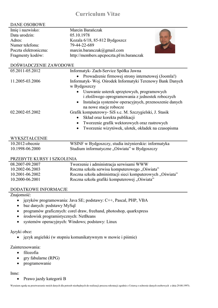 Curriculum Vitae DANE OSOBOWE Imię i nazwisko: Data urodzin: Adres: Numer telefonu: Poczta elektroniczna: Fragmenty kodów: Marcin Barańczak 05.10.1978 Kozala 6/18, 85-812 Bydgoszcz 79-44-22-689 [email protected] http://members.upcpoczta.pl/m.baranczak DOŚWIADCZENIE ZAWODOWE 05.2011-05.2012 Informatyk- Zach-Service Spółka Jawna Prowadzenie firmowej strony internetowej (Joomla!) 11.2005-03.2006 Informatyk- Woj. Ośrodek Informatyki Terenowy Bank Danych w Bydgoszczy Usuwanie usterek sprzętowych, programowych i złośliwego oprogramowania z jednostek roboczych Instalacja systemów operacyjnych, przenoszenie danych na nowe stacje robocze 02.2002-05.2002 Grafik komputerowy- SiS s.c. M. Szczygielski, J. Stasik Skład oraz korekta publikacji Tworzenie grafik wektorowych oraz rastrowych Tworzenie wizytówek, ulotek, okładek na czasopisma WYKSZTAŁCENIE 10.2012-obecnie 10.1998-06.2000 WSINF w Bydgoszczy, studia inżynierskie: informatyka Studium informatyczne „Oświata” w Bydgoszczy PRZEBYTE KURSY I SZKOLENIA 08.2007-09.2007 Tworzenie i administracja serwisami WWW 10.2002-06.2003 Roczna szkoła serwisu komputerowego „Oświata” 10.2001-06.2002 Roczna szkoła administracji sieci komputerowych „Oświata” 10.2000-06.2001 Roczna szkoła grafiki komputerowej „Oświata” DODATKOWE INFORMACJE Znajomość: języków programowania: Java SE; podstawy: C++, Pascal, PHP, VBA baz danych: podstawy MySql programów graficznych: corel draw, freehand, photoshop, quarkxpress środowisk programistycznych: NetBeans systemów operacyjnych: Windows; podstawy: Linux Języki obce: język angielski (w stopniu komunikatywnym w mowie i piśmie) Zainteresowania: filozofia gry fabularne (RPG) programowanie Inne: Prawo jazdy kategorii B Wyrażam zgodę na przetwarzanie moich danych dla potrzeb niezbędnych do realizacji procesu rekrutacji zgodnie z Ustawą o ochronie danych osobowych z dnia 29.08.1997r.