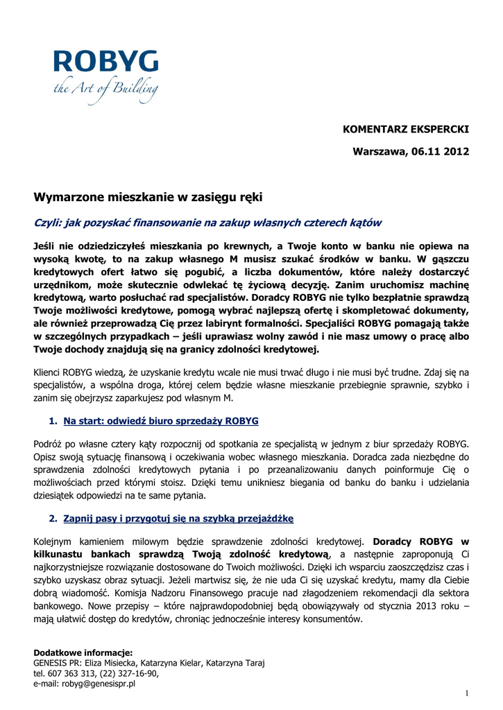 KOMENTARZ EKSPERCKI Warszawa, 06.11 2012 Wymarzone mieszkanie w zasięgu ręki Czyli: jak pozyskać finansowanie na zakup własnych czterech kątów Jeśli nie odziedziczyłeś mieszkania po krewnych, a Twoje konto w banku nie opiewa na wysoką kwotę, to na zakup własnego M musisz szukać środków w banku. W gąszczu kredytowych ofert łatwo się pogubić, a liczba dokumentów, które należy dostarczyć urzędnikom, może skutecznie odwlekać tę życiową decyzję. Zanim uruchomisz machinę kredytową, warto posłuchać rad specjalistów. Doradcy ROBYG nie tylko bezpłatnie sprawdzą Twoje możliwości kredytowe, pomogą wybrać najlepszą ofertę i skompletować dokumenty, ale również przeprowadzą Cię przez labirynt formalności. Specjaliści ROBYG pomagają także w szczególnych przypadkach – jeśli uprawiasz wolny zawód i nie masz umowy o pracę albo Twoje dochody znajdują się na granicy zdolności kredytowej. Klienci ROBYG wiedzą, że uzyskanie kredytu wcale nie musi trwać długo i nie musi być trudne. Zdaj się na specjalistów, a wspólna droga, której celem będzie własne mieszkanie przebiegnie sprawnie, szybko i zanim się obejrzysz zaparkujesz pod własnym M. 1. Na start: odwiedź biuro sprzedaży ROBYG Podróż po własne cztery kąty rozpocznij od spotkania ze specjalistą w jednym z biur sprzedaży ROBYG. Opisz swoją sytuację finansową i oczekiwania wobec własnego mieszkania. Doradca zada niezbędne do sprawdzenia zdolności kredytowych pytania i po przeanalizowaniu danych poinformuje Cię o możliwościach przed którymi stoisz. Dzięki temu unikniesz biegania od banku do banku i udzielania dziesiątek odpowiedzi na te same pytania. 2. Zapnij pasy i przygotuj się na szybką przejażdżkę Kolejnym kamieniem milowym będzie sprawdzenie zdolności kredytowej. Doradcy ROBYG w kilkunastu bankach sprawdzą Twoją zdolność kredytową, a następnie zaproponują Ci najkorzystniejsze rozwiązanie dostosowane do Twoich możliwości. Dzięki ich wsparciu zaoszczędzisz czas i szybko uzyskasz obraz sytuacji. Jeżeli martwisz się, że nie uda Ci się uzyskać kredytu, mamy dla Ciebie dobrą wiadomość. Komisja Nadzoru Finansowego pracuje nad złagodzeniem rekomendacji dla sektora bankowego. Nowe przepisy – które najprawdopodobniej będą obowiązywały od stycznia 2013 roku – mają ułatwić dostęp do kredytów, chroniąc jednocześnie interesy konsumentów. Dodatkowe informacje: GENESIS PR: Eliza Misiecka, Katarzyna Kielar, Katarzyna Taraj tel. 607 363 313, (22) 327-16-90, e-mail: [email protected] 1 Tym, którzy planują zakup mieszkania jeszcze w 2012 roku, doradcy z firmy ROBYG wyjaśnią zawiłości programu Rodzina na Swoim i pomogą znaleźć mieszkanie spełniające warunki RnS. 3. Pierwsza prosta – wybór najlepszej oferty Po uzyskaniu zdolności kredytowej przyjdzie czas na wybór oferty kredytowej. Doradcy ROBYG porównają dla Ciebie dostępne na rynku oferty sprawdzając m.in. oprocentowanie, warunki wcześniejszej spłaty, prowizje oraz koszty dodatkowe. Jako duża firma deweloperska wynegocjowaliśmy dla Klientów w wielu bankach specjalne oferty, które są dużo atrakcyjniejsze od ogólnie dostępnych na rynku. 4. Nie zabłądzisz w gąszczu papierów – dokumenty doradca pomoże skompletować niezbędne Po dokonaniu wyboru kredytu nie pozostanie nam nic innego, jak dopilnowanie formalności. W tej kwestii również możesz liczyć na naszą pomoc. Doradca finansowy pomoże Ci zebrać wszystkie dokumenty potrzebne do uzyskania kredytu hipotecznego, a te dotyczące dewelopera sam przekaże do banku. 5. Prowadzimy za Ciebie Specjaliści ROBYG będą nadzorować cały proces kredytowy. Każdego Klienta traktują indywidualnie, dlatego będziemy opiekować się Twoją sprawą tak, abyś jak najszybciej otrzymał środki na zakup nowego mieszkania. 6. „Zaliczony odcinek specjalny” – masz kredyt! Gdy już otrzymasz kredyt, eksperci ROBYG nadal będą czuwali nad Twoimi sprawami. Jeśli pojawią się na rynku bardziej korzystne rozwiązania kredytowe – zostaną Ci one przedstawione. 7. Dojazd do mety przed czasem Dzięki bezpłatnej pomocy specjalistów ROBYG szybko i sprawnie uzyskasz kredyt i zrealizujesz swoje marzenie o własnym mieszkaniu. Zaoszczędzisz czas i zyskasz pewność, że oferta, na którą się zdecydujesz będzie dostosowana do twoich możliwości. Agnieszka Senderowicz, dyrektor ds. sprzedaży w warszawskim oddziale ROBYG SA Dodatkowe informacje: GENESIS PR: Eliza Misiecka, Katarzyna Kielar, Katarzyna Taraj tel. 607 363 313, (22) 327-16-90, e-mail: [email protected] 2 Grupa ROBYG należy do czołówki polskich deweloperów pod względem liczby sprzedanych mieszkań. W ciągu 12 lat działalności firma zrealizowała 7 wieloetapowych inwestycji, obejmujących łącznie około 2670 lokali (do czerwca 2012 roku). W połowie 2012 roku ROBYG miał 9 aktywnych inwestycji w toku i około 1133 lokale w swojej ofercie. W Warszawie Grupa prowadzi 5 inwestycji mieszkaniowych: Nowa Rezydencja Królowej Marysieńki, Osiedle Zdrowa, City Apartments, Osiedle Kameralne i Young City oraz jeden projekt komercyjny, ROBYG Business Center w Wilanowie. Natomiast w Gdańsku spółka realizuje 3 inwestycje: Lawendowe Wzgórza, Słoneczna Morena i Albatross Towers. ROBYG SA jest notowana na głównym parkiecie Giełdy Papierów Wartościowych w Warszawie od listopada 2010 roku. Więcej informacji www.ri.robyg.com, www.robyg.com Dodatkowe informacje: GENESIS PR: Eliza Misiecka, Katarzyna Kielar, Katarzyna Taraj tel. 607 363 313, (22) 327-16-90, e-mail: [email protected] 3