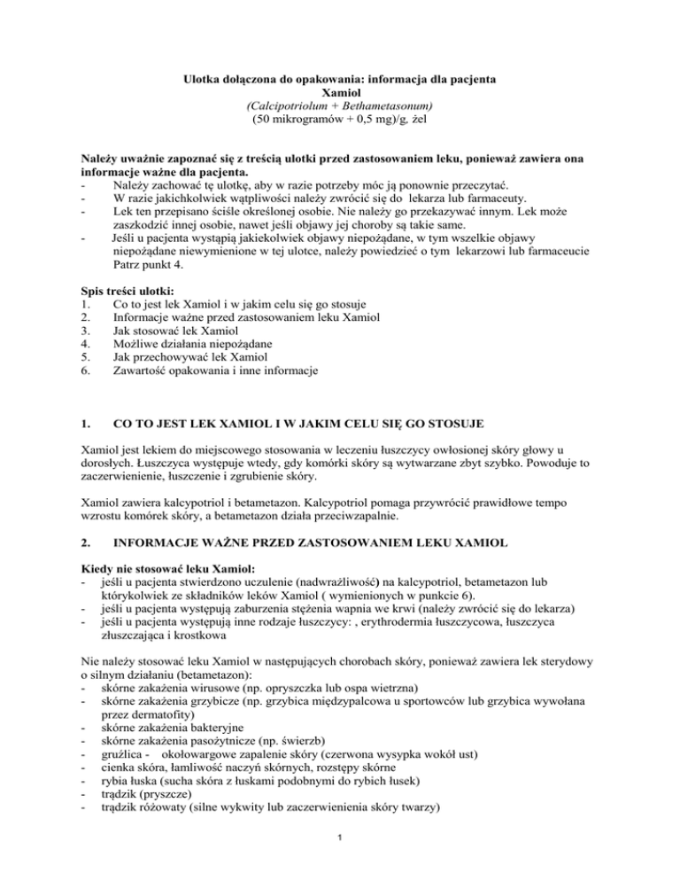 Ulotka dołączona do opakowania: informacja dla pacjenta Xamiol (Calcipotriolum + Bethametasonum) (50 mikrogramów + 0,5 mg)/g, żel Należy uważnie zapoznać się z treścią ulotki przed zastosowaniem leku, ponieważ zawiera ona informacje ważne dla pacjenta. Należy zachować tę ulotkę, aby w razie potrzeby móc ją ponownie przeczytać. W razie jakichkolwiek wątpliwości należy zwrócić się do lekarza lub farmaceuty. Lek ten przepisano ściśle określonej osobie. Nie należy go przekazywać innym. Lek może zaszkodzić innej osobie, nawet jeśli objawy jej choroby są takie same. Jeśli u pacjenta wystąpią jakiekolwiek objawy niepożądane, w tym wszelkie objawy niepożądane niewymienione w tej ulotce, należy powiedzieć o tym lekarzowi lub farmaceucie Patrz punkt 4. Spis treści ulotki: 1. Co to jest lek Xamiol i w jakim celu się go stosuje 2. Informacje ważne przed zastosowaniem leku Xamiol 3. Jak stosować lek Xamiol 4. Możliwe działania niepożądane 5. Jak przechowywać lek Xamiol 6. Zawartość opakowania i inne informacje 1. CO TO JEST LEK XAMIOL I W JAKIM CELU SIĘ GO STOSUJE Xamiol jest lekiem do miejscowego stosowania w leczeniu łuszczycy owłosionej skóry głowy u dorosłych. Łuszczyca występuje wtedy, gdy komórki skóry są wytwarzane zbyt szybko. Powoduje to zaczerwienienie, łuszczenie i zgrubienie skóry. Xamiol zawiera kalcypotriol i betametazon. Kalcypotriol pomaga przywrócić prawidłowe tempo wzrostu komórek skóry, a betametazon działa przeciwzapalnie. 2. INFORMACJE WAŻNE PRZED ZASTOSOWANIEM LEKU XAMIOL Kiedy nie stosować leku Xamiol: - jeśli u pacjenta stwierdzono uczulenie (nadwrażliwość) na kalcypotriol, betametazon lub którykolwiek ze składników leków Xamiol ( wymienionych w punkcie 6). - jeśli u pacjenta występują zaburzenia stężenia wapnia we krwi (należy zwrócić się do lekarza) - jeśli u pacjenta występują inne rodzaje łuszczycy: , erythrodermia łuszczycowa, łuszczyca złuszczająca i krostkowa Nie należy stosować leku Xamiol w następujących chorobach skóry, ponieważ zawiera lek sterydowy o silnym działaniu (betametazon): - skórne zakażenia wirusowe (np. opryszczka lub ospa wietrzna) - skórne zakażenia grzybicze (np. grzybica międzypalcowa u sportowców lub grzybica wywołana przez dermatofity) - skórne zakażenia bakteryjne - skórne zakażenia pasożytnicze (np. świerzb) - gruźlica - okołowargowe zapalenie skóry (czerwona wysypka wokół ust) - cienka skóra, łamliwość naczyń skórnych, rozstępy skórne - rybia łuska (sucha skóra z łuskami podobnymi do rybich łusek) - trądzik (pryszcze) - trądzik różowaty (silne wykwity lub zaczerwienienia skóry twarzy) 1 - owrzodzenia lub uszkodzenie skóry Ostrzeżenia i środki ostrożności Przed rozpoczęciem stosowania leku Xamol należy omówić to z lekarzem lub farmaceutą jeśli.: - pacjent stosuje inne leki zawierające kortykosteroidy, ponieważ mogą wystąpić działania niepożądane; - pacjent stosował ten lek przez długi czas i planuje zaprzestać jego stosowania (ponieważ istnieje ryzyko, że łuszczyca pogorszy się lub wystąpi jej nasilenie związane z nagłym przerwaniem stosowania leku zawierającego steroid); - pacjent ma cukrzycę, gdyż leki zawierające steroidy mogą mieć wpływ na stężenie cukru/glukozy we krwi; - wystąpiło zakażenie skóry, ponieważ w takim przypadku może być konieczne przerwanie leczenia; - u pacjenta występuje łuszczyca kropelkowata; Specjalne środki ostrożności: - Unikać stosowania leku na więcej niż 30% powierzchni ciała oraz stosowania większych ilości niż 15 g na dobę. - Unikać stosowania leku pod czepkami kąpielowymi, bandażami lub opatrunkami, ponieważ zwiększa to wchłanianie steroidu. - Unikać stosowania leku na dużej powierzchni uszkodzonej skóry, błonach śluzowych lub w fałdach skórnych (pachwiny, pachy, pod piersiami), ponieważ zwiększa to wchłanianie steroidu. - Unikać stosowania leku na twarz i narządy płciowe, ponieważ są one szczególnie wrażliwe na steroidy. - Unikać nadmiernego opalania, korzystania z solarium lub innych form fototerapii. Dzieci Xamiol nie jest zalecany do stosowania u dzieci w wieku poniżej 18 lat. Lek Xamiol a inne leki Należy powiedzieć lekarzowi lub farmaceucie o wszystkich przyjmowanych aktualnie lub ostatnio lekach, również tych, które wydawane są bez recepty. Ciąża i karmienie piersią Nie stosować leku Xamiol w okresie ciąży (lub w przypadku podejrzenia ciąży) lub w okresie karmienia piersią, jeżeli nie zostało to najpierw uzgodnione z lekarzem. Jeśli lekarz zgodził się na karmienie piersią, należy zachować ostrożność. Przed zastosowaniem jakiegokolwiek leku należy skonsultować się z lekarzem lub farmaceutą. Prowadzenie pojazdów i obsługa maszyn Nie stwierdzono żadnego wpływu leku Xamiol na zdolność prowadzenia pojazdów mechanicznych i obsługi maszyn. Ważne informacje o niektórych składnikach leku Xamiol Lek Xamiol zawiera butylohydrokoksytoluen (E321) który może powodować miejscowe reakcje skórne (np. kontaktowe zapalenie skóry) lub podrażenienie oczu i błon śluzowych. 3. JAK STOSOWAĆ LEK XAMIOL Lek Xamiol należy zawsze stosować zgodnie z zaleceniami lekarza. W przypadku wątpliwości należy ponownie skontaktować się z lekarzem lub farmaceutą. Jak nakładać Xamiol: Podanie na skórę. Lek należy stosować wyłącznie na owłosioną skórę głowy. 2 Instrukcja prawidłowego stosowania: - Stosowac wyłącznie na miejsca objęte łuszczycą na owłosionej skórze głowy i nie stosować na skórze nieobjętej łuszczycą - Mycie głowy przed zastosowaniem leku Xamiol nie jest konieczne - Przed użyciem dobrze wstrząsnąć butelkę i następnie zdjąć zatyczkę - Przed nałożeniem leku Xamiol na skórę .rozczesać włosy, aby usunąć wszelkie złuszczone fragmenty skóry. Przechylić głowę, aby lek Xamiol nie spłynął na twarz. Przed zastosowa