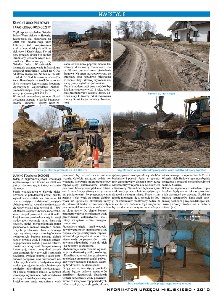 INWESTYCJE Remont ulicy Filtrowej i Krasickiego rozpoczęty Ciężki sprzęt wjechał na Osiedle Dzieci Wrzesińskich w Sławnie. Rozpoczęła się, planowana na 2010 rok, modernizacja ulic: Filtrowej (od skrzyżowania z ulicą Koszalińską do ul.Krasickiego) i Krasickiego. Do tej pory przejazd drogą był bardzo utrudniony, czasami wręcz niemożliwy. Rozbudowujące się Osiedle Dzieci Wrzesińskich wymagało przygotowania infrastruktury drogowej ułatwiającej wjazd na ODW od strony Koszalina. Na ten cel miasto uzyskało 50 % dofinansowania kosztów kwalifikowalnych ze środków europejskich w ramach Regionalnego Programu Operacyjnego Województwa Zachodniopomorskiego. Koszty tegorocznej inwestycji wynoszą 849 970,73 zł. W ramach przebudowy na obu ulicach wykonane zostaną z kostki betonowej jezdnie , chodniki i zjazdy. Teren zo- stanie odwodniony poprzez montaż kanalizacji deszczowej. Dodatkowo ulica Filtrowa otrzyma nowe oświetlenie drogowe. Na teren przygotowywany do sprzedaży pod zabudowę mieszkalną w rejonie ulicy Filtrowej wykonane zostaną zjazdy wyłożone polbrukiem. Projekt modernizacji dróg na ODW będzie kontynuowany w 2011 roku. Wówczas przebudowany zostanie dalszy odcinek ulicy Filtrowej, od skrzyżowania z ulicą Krasickiego do ulicy Tuwima. (ms) Trwa gruntowna przebudowa ul. Filtrowej Sławno stawia na ekologię Jedną z najpoważniejszych inwestycji zaplanowanych w Sławnie na 2010 rok jest przebudowa ujęcia i stacji uzdatniania wody. Stacja wodociągowa w Sławnie zlokalizowana w południowej części miasta, wybudowana została na przełomie lat osiemdziesiątych i dziewięćdziesiątych ubiegłego wieku. Aktualne średnie zużycie wody w skali roku wynosi ok. 18002000 m3/d., a przewidywane zapotrzebowanie perspektywiczne to ok. 4000m3/d. Projektowana przebudowa ujęcia stacji wodociągów obejmuje m.in.: instalację nowych, mniej energochłonnych pomp głębinowych, montaż urządzeń pomiarowych, przebudowę bloku uzdatniającego, wymianę starych rurociągów technologicznych, budowę nowego układu napowietrzania wody i instalacji sprężonego powietrza, układu płukania filtrów , montaż aparatury kontrolno-pomiarowej i sterującej, montaż pomp dawkujących oraz urządzeń do wentylacji i osuszania powietrza. Projekt obejmuje także przebudowę pompowni oraz przebudowę sieci łączących studnie z budynkiem stacji wodociągowej, sieci międzyobiektowych pomiędzy zbiornikami wyrównawczymi i siecią zasilającą miasto. W ramach inwestycji wymienione będą urządzenia zasilające i instalacje elektryczne. Projektowana stacja uzdatniania wody 8 Remont ul. Krasickiego Przygotowanie infrastruktury drogowej ułatwi wjazd na ODW od strony Koszalina pracować będzie całkowicie automatycznie. Całością zarządzać będzie nowoczesny sterownik mikroprocesorowy zapewniający automatyczne działanie procesów filtracji oraz płukania filtrów oraz komunikację cyfrową z urządzeniami pomiarowymi. Po przepompowaniu zadanej ilości wody ze studni głębinowych lub upłynięciu określonej liczby dni, sterownik będzie czuwał nad całym procesem płukania wody ze wskazaniem na okres nocny. Do ciągłej kontroli parametrów fizykochemicznych wody przewidziano automatyczne analizatory związków żelaza, manganu i amoniaku. Przebudowa ujęcia i stacji wodociągowej w znacznym stopniu zmniejszy zużycie energii elektrycznej, zapewni niezawodną pracę obiektu oraz uzdatnienie wody do parametrów , jakim powinna odpowiadać woda do picia i na potrzeby gospodarcze. Modernizacja stacji zostanie wykonana przez sławieńską spółkę Wodociągi i Kanalizacja, a środki na przebudowę pochodzą z umorzonej części pożyczki z Wojewódzkiego Funduszu Ochrony Środowiska i budżetu spółki. Drugą ważną inwestycją proekologiczną będzie budowa separatorów kanalizacji deszczowej. Urządzenia te będą oczyszczały wody powierzchniowe ze związków ropopochodnych, które znajdują się na drogach, ulicach, spływają wraz z wodą opadową z dachów budynków i posesji. Jeden z separatorów zamontowany zostanie przy rzece Moszczenicy w rejonie ulic Mickiewicza i Basztowej. Zbiornik ten będzie oczyszczał wody powierzchniowe spływające do rzeki z centrum miasta. Prace w tym rejonie rozpoczną się w połowie br. Drugi ze zbiorników montowany będzie na ulicy Staszica. Zadaniem tego urządzenia będzie zbieranie i oczyszczanie wód po- wierzchniowych z rejonu Osiedla Dzieci Wrzesińskich. Budowa separatora będzie połączona z pracami modernizacyjnymi na ulicy Staszica. Betonowe separatory z wkładami z polietylenu będą raz w roku oczyszczane a ich zawartość utylizowana. Środki na budowę separatorów kanalizacji deszczowej pochodzą z Wojewódzkiego Funduszu Ochrony Środowiska i budżetu miasta. (ms) Stacja uzdatniania wody przejdzie gruntowny remont INFORMATOR URZEDU MIEJSKIEGO - 2010