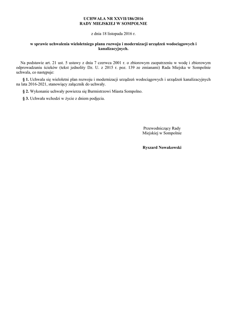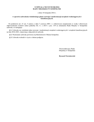 UCHWAŁA NR XXVII/186/2016 RADY MIEJSKIEJ W SOMPOLNIE z dnia 18 listopada 2016 r. w sprawie uchwalenia wieloletniego planu rozwoju i modernizacji urządzeń wodociągowych i kanalizacyjnych. Na podstawie art. 21 ust. 5 ustawy z dnia 7 czerwca 2001 r. o zbiorowym zaopatrzeniu w wodę i zbiorowym odprowadzaniu ścieków (tekst jednolity Dz. U. z 2015 r. poz. 139 ze zmianami) Rada Miejska w Sompolnie uchwala, co następuje: § 1. Uchwala się wieloletni plan rozwoju i modernizacji urządzeń wodociągowych i urządzeń kanalizacyjnych na lata 2016-2021, stanowiący załącznik do uchwały. § 2. Wykonanie uchwały powierza się Burmistrzowi Miasta Sompolno. § 3. Uchwała wchodzi w życie z dniem podjęcia. Przewodniczący Rady Miejskiej w Sompolnie Ryszard Nowakowski Załącznik do Uchwały Nr XXVII/186/2016 Rady Miejskiej w Sompolnie z dnia 18 listopada 2016 r. WIELOLETNI PLAN ROZWOJU I MODERNIZACJI URZĄDZEŃ WODOCIĄGOWYCH I URZĄDZEŃ KANALIZACYJNYCHNA LATA 2016 - 2021 WPROWADZENIE Obowiązek opracowania planu wynika z ustawy z dnia 7 czerwca 2001 r. "O zbiorowym zaopatrzeniu w wodę i zbiorowym odprowadzaniu ścieków” (t.j. Dz. U. z 2006 r. Nr 123 poz. 858, z póz. zm.). „Wieloletni plan rozwoju i modernizacji urządzeń wodociągowych i urządzeń kanalizacyjnych na lata 2016 2021” dalej zwany jako WPRiM, obejmuje przedsięwzięcia inwestycyjne przewidziane do realizacji przez Gminę Sompolno i PUK Sp. z o.o., w dziedzinie „urządzeń” wodociągowych i „urządzeń” kanalizacyjnych, zdefiniowanych w ww. ustawie. Nie uwzględnia zatem wszystkich przedsięwzięć inwestycyjnych Spółki poza „urządzeniami” wodociągowymi i kanalizacyjnymi, przykładowo zakupów sprzętu specjalistycznego, rozbudowy lub modernizacji bazy przedsiębiorstwa. Obejmuje natomiast zadania z zakresu uzbrajania terenów miejskich i wiejskich, wynikające z kierunków rozwoju gminy, określonych w studium uwarunkowań i kierunków zagospodarowania przestrzennego gminy oraz miejscowych planów zagospodarowania przestrzennego. Ujęte w nim zadania służą rozwojowi oraz mają na celu poprawę jakości świadczonych usług i dostosowaniu ich do standardów UE. WPRiM po raz pierwszy został opracowany w r. i uchwalony przez Radę Miejską w Sompolnie w dniu 30 maja 2003. r. (Uchwała Nr IX/73/03). W kolejnych latach podlegał on aktualizacji i uszczegółowieniu. W ramach „Planu rozwoju i modernizacji urządzeń wodociągowych i kanalizacyjnych Gmina Sompolno oraz PUK Sp. z o.o. zrealizowały m.in. następujące zadania: - przebudowa wodociągu w ul. 11 Listopada w Sompolnie, - przebudowa wodociągu w ul. 500 Lecia w Sompolnie, - budowa wodociągu w ulicy Krycha w Sompolnie, - budowa wodociągu w m. Biele, - budowa wodociągu (łącznika) w m. Przystronie, - budowa wodociągu w m. Błonawy (łącznik obiektów KWB Konin i Polic ), - budowa wodociągu w m. Błonawy (I etap łącznika SUW Lubstów i SUW Marianowo), - przebudowa wodociągu w ul. Polnej w Lubstowie, - modernizacja stacji uzdatniania wody w m. Biele, - montaż systemów alarmowych w SUW Mostki, Biele, - budowa kanalizacji sanitarnej w Sompolnie (kolejne etapy ), - budowa kanalizacji sanitarnej w m. Biele, - budowa kanalizacji sanitarnej w m. Lubstów (etap I) oraz budowa kolektora tłocznego z Lubstowa do Sompolna. - budowa kanalizacji sanitarnej w m. Mostki oraz budowa kolektora tłocznego z Mostek do Mąkolna, - budowa pompowni ścieków i kolektora tłocznego miedzy ulicą Brzozową a Błankową , wyłączenie z eksploatacji i częściowa likwidacja oczyszczalni ścieków przy ulicy Brzozowej w Sompolnie , - budowa pompowni ścieków i kolektora tłocznego między ulicą Św.Barbary a ul. Gimnazjalną , wyłączenie z eksploatacji oraz częściowa likwidacja oczyszczalni przy ul. Św. Barbary w Sompolnie, - modernizacja SUW Mostki (etap I), - modernizacja SUW Marianowo ( etap I) - budowa kanalizacji sanitarnej w m. Lubstów (etap II), - rozbudowa kanalizacji sanitarnej w m. Mąkolno, - budowa wodociągu w m. Biele (etap II), - modernizacja oczyszczalni ścieków przy ul. Błankowej w Sompolnie. „Wieloletni plan rozwoju i modernizacji urządzeń wodociągowych i urządzeń kanalizacyjnych na lata 2016-2021” jest kontynuacją planu poprzedniego. Uwzględnione w nim zostały zadania aktualnie realizowane, w tym przewidziane do współfinansowania ze środków UE oraz nowe, które wynikają z polityki inwestycyjnej Gminy Sompolno, Przedsiębiorstwa Usług Komunalnych Sp. z o.o. oraz potrzeb i oczekiwań mieszkańców. Z uwagi na brak ostatecznych rozstrzygnięć w kwestii dofinansowania inwestycji ze środków UE, istnieje ryzyko niepewności co do wykonania zadań w założonych terminach. Zgodnie z wymogami ustawy WPRiM obejmuje następujący zagadnienia: - planowany zakres usług wodociągowo-kanalizacyjnych, - przedsięwzięcia rozwojowo-modernizacyjne w poszczególnych latach, - przedsięwzięcia racjonalizujące zużycie wody oraz wprowadzanie ścieków, - nakłady inwestycyjne w poszczególnych latach, - sposoby finansowania planowanych inwestycji. Plan rozwoju i modernizacji urządzeń wodociągowych i kanalizacyjnych obejmuje okres 6 lat - od 2016 do 2021 roku. Jest on zgodny z kierunkami rozwoju Gminy określonymi w „STRATEGII ROZWOJU GMINY SOMPOLNO NA LATA 2007-2019", zatwierdzonej Uchwałą Nr XIV/112/08 Rady Miejskiej w Sompolnie z dnia 26 lutego 2008 r. ze zm., Studium uwarunkowań i kierunków zagospodarowania przestrzennego gminy Sompolno zatwierdzonego Uchwałą Nr XXXI/246/05 z dnia 20 maja 2005 r. Plan ma charakter otwarty, w związku z czym będzie sukcesywnie uzupełniany i korygowany. Dotyczy to zwłaszcza zmian w zakresie rozwojowym i kosztowym planowanych przedsięwzięć oraz kierunków pozyskiwania środków na ich realizację, których oczywiście nie można było przewidzieć. Niniejszy plan przedstawia najważniejsze zadania w poszczególnych grupach tematycznych. Należy wziąć pod uwagę, że wie