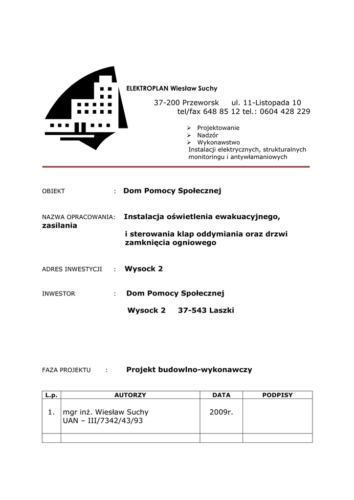 ELEKTROPLAN Wiesław Suchy 37-200 Przeworsk ul. 11-Listopada 10 tel/fax 648 85 12 tel.: 0604 428 229 Projektowanie Nadzór Wykonawstwo Instalacji elektrycznych, strukturalnych monitoringu i antywłamaniowych OBIEKT : NAZWA OPRACOWANIA: Dom Pomocy Społecznej Instalacja oświetlenia ewakuacyjnego, zasilania i sterowania klap oddymiania oraz drzwi zamknięcia ogniowego ADRES INWESTYCJI : Wysock 2 INWESTOR : Dom Pomocy Społecznej Wysock 2 FAZA PROJEKTU L.p. 1. : 37-543 Laszki Projekt budowlno-wykonawczy AUTORZY mgr inŜ. Wiesław Suchy UAN – III/7342/43/93 DATA 2009r. PODPISY SPIS ZAWARTOŚCI OPRACOWANIA 1.ZałoŜenia techniczne 1.1 Podstawa opracowania 1.2. Zawartość opracowania 1.3. Dane techniczne 2. Opis Techniczny 2.1. Zasilanie w energię elektryczną 2.2. Rozliczeniowy pomiar energii elektrycznej 2.3. Tablice rozdzielcze 2.4. Instalacja oświetlenia ogólnego 2.5. Instalacja oświetlenia ewakuacyjnego 2.6. Instalacja zasilania i serowania klapami oddymiania 2.9. Instalacja zamknięć ognowych 3. Uwagi końcowe 4. Spis rysunków 1. ZałoŜenia techniczne Podstawa opracowania Zlecenie inwestora Podkłady architektoniczne Opracowania branŜowe Obowiązujące przepisy i normy Zawartość opracowania Zasilanie w energię elektryczną Rozliczeniowy pomiar energii elektrycznej Tablice rozdzielcze Instalacja oświetlenia ogólnego Instalacja oświetlenia ewakuacyjnego Instalacja zasilania i serowania klapami oddymiania Instalacja zamknięć ogniowych Uwagi końcowe Dane techniczne Napięcie zasilania - 230/400 V 2. Opis Techniczny 2.1 Zasilanie w energię elektryczną Obiekt zasilany jest z linii napowietrznej n/n istniejącym przyłączem energetycznym n/n. 2.2 Rozliczeniowy pomiar energii elektrycznej Rozliczeniowy pomiar energii elektrycznej istniejący w rozdzielni RG. 2.3 Tablice rozdzielcze W obiekcie oprócz rozdzielnicy głównej RG istnieją rozdzielnice obwodowe dla zasilania obwodów na poszczególnych kondygnacjach. 2.4 Instalacja oświetlenia ogólnego W obiekcie oświetlenie ogólne zrealizowane jest oprawami jarzeniowymi i Ŝarowymi. Obwody instalacji zasilane są z tablic rozdzielczych obwodowych. W tablicach usytuowane są zabezpieczenia obwodów. Zastosowany osprzęt typu melaminowego podtynkowy, w łazienkach, piwnicach, oraz pomieszczeniach kuchni osprzęt podtynkowy hermetyczny. 2.5 Instalacja oświetlenia ewakuacyjnego. Wymagania techniczne dla oświetlenia awaryjnego określa norma PNEN 1838:2002(U). Norma ta w punkcie trzy przejmuje definicje, które róŜnią się zasadniczo od określonych wcześniej w PN-84/E-02033. PoniŜej przetoczone zostaną potrzebne definicje w oparciu o w/w normę. - oświetlenie awaryjne: Oświetlenie przeznaczone do stosowania podczas awarii zasilania urządzeń oświetlenia podstawowego. - droga ewakuacyjna: Droga potrzebna do ewakuacji w przypadku zagroŜenia. -oświetlenie ewakuacyjne: Część oświetlenia awaryjnego zapewniające bezpieczne opuszczenie zagroŜonego miejsca lub umoŜliwiające uprzednie podjęcie pruby zakończenia potencjalnie niebezpiecznego procesu. -Oświetlenie drogi ewakuacyjnej: Część oświetlenia ewakuacyjnego mająca na celu zapewnienie, Ŝe droga ewakuacyjna będzie jednoznacznie zidentyfikowana i wykorzystana bezpiecznie do ewakuacji. - wyjście awaryjne: Wyjście przewidziane do uŜytku podczas zagroŜenia. Zgodnie z normą podstawową funkcją oświetlenia ewakuacyjnego jest zapewnienie warunków do bezpiecznego wyjścia z miejsc przybywania osób w przypadku zaniku oświetlenia podstawowego. Powinno ono umoŜliwić odnalezienie drogi ewakuacji i właściwego kierunku poruszania się, a takŜe łatwe zlokalizowanie i uŜycie sprzętu przeciwpoŜarowego i pierwszej pomocy medycznej. W celu zapewnienia odpowiedniego natęŜenia oświetlenia oprawy oświetlenia ewakuacyjnego (odpowiadające normie PN-EN 60 598-2-22) rozmieszczone zostały w pobliŜu kaŜdych drzwi wejściowych oraz tam gdzie było to konieczne, aby zwrócić uwagę na potencjalne niebezpieczeństwo lub umieszczony sprzęt bezpieczeństwa. Instalację oświetlenia ewakuacyjnego zaprojektowano w korytarzach, klatkach schodowych i holu wejściowym. Oświetlenie zaprojektowano przy pomocy opraw z modułem awaryjnym o czasie świecenia t=2h. W stanie normalnej pracy oprawa jest zasilana z sieci 230V, które powoduje ładowanie wewnętrznego akumulatora, przy braku napięcia w sieci zasilanie jest pobierane z wbudowanego wewnątrz oprawy modułu awaryjnego (akumulatora).Instalację wykonać przewodem YDY 3x1,5mm2 układanym w listwach elektroinstalacyjnych. Oprawy z modułem awaryjnym oznaczono symbolem AW. Zasilanie obwodów oświetlenia ewakuacyjnego wykonać z tych samych obwodów z których zasilone są oprawy zasilania podstawowego danego pomieszczenia. 2.6 Instalacja zasilania i sterowania klapami oddymiania Dla zapewnienia oddymiania dróg ewakuacyjnych budynku DPS-u w wypadku poŜaru zostały zaprojektowane dwie klapy oddymiające zamontowane w oknach klatki KS1 i KS2 na piętrze. Klapy mają za zadanie oddymianie i odprowadzenie ciepła. Urządzenia oddymiania i odprowadzania ciepła, montowane na budynku , wyzwalane są za pomocą central oddymiania. W skład instalacji oddymiania i odprowadzania ciepła wchodzą: - centrala oddymiania i odprowadzania ciepła - zasilanie sieciowe - awaryjne źródło prądu stałego 24V - elektryczne napędu z wyłącznikiem krańcowym - przycisk oddymiania - przycisk przewietrzania - czujki dymu Zespoły oddymiania są indywidualnie zestawiane w zaleŜności od wielkości instalacji lub specyficznych wymagań. Część układu zasilana jest prądem 24V, którego zadaniem jest podtrzymanie funkcjonowania instalacji w ciągu 72 godzin w przypadku zaniku napięcia 230V. Opis instalacji oddymiania dróg ewakuacyjnych w budynku DPS Wyszatyce. Centrale oddymiania RZN 4402 zamontowane będą w pomieszczeniach klatek schodowych na poziomie piętra. Na suficie klatek schodowych poziomu piętra i parteru z