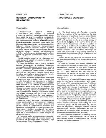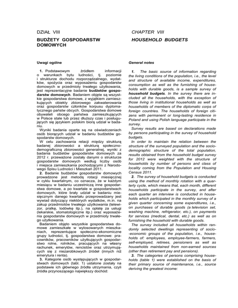 DZIAŁ VIII CHAPTER VIII BUDŻETY GOSPODARSTW DOMOWYCH HOUSEHOLD BUDGETS Uwagi ogólne General notes 1. Podstawowym źródłem informacji o warunkach bytu ludności, tj. poziomie i strukturze dochodu rozporządzalnego, wydatków, spożycia oraz wyposażeniu gospodarstw domowych w przedmioty trwałego użytkowania, jest reprezentacyjne badanie budżetów gospodarstw domowych. Badaniem objęte są wszystkie gospodarstwa domowe, z wyjątkiem zamieszkujących obiekty zbiorowego zakwaterowania oraz gospodarstw członków korpusu dyplomatycznego państw obcych. Gospodarstwa domowe obywateli obcego państwa zamieszkujących w Polsce stale lub przez dłuższy czas i posługujących się językiem polskim biorą udział w badaniu. Wyniki badania oparte są na oświadczeniach osób biorących udział w badaniu budżetów gospodarstw domowych. W celu zachowania relacji między strukturą badanej zbiorowości a strukturą społecznodemograficzną zbiorowości generalnej, wyniki z badania budżetów gospodarstw domowych za 2012 r. przeważone zostały danymi o strukturze gospodarstw domowych według liczby osób i miejsca zamieszkania pochodzącymi z Narodowego Spisu Ludności i Mieszkań 2011. 2. Badanie budżetów gospodarstw domowych prowadzone jest metodą rotacji miesięcznej w cyklu kwartalnym, co oznacza, że w każdym miesiącu w badaniu uczestniczą inne gospodarstwa domowe, a po kwartale w gospodarstwach domowych, które brały udział w badaniu miesięcznym danego kwartału przeprowadzany jest wywiad dotyczący niektórych wydatków, m.in. na zakup przedmiotów trwałego użytkowania (telewizor, pralkę, lodówkę itp.), na opłatę za usługi (lekarskie, stomatologiczne itp.) oraz wyposażenia gospodarstw domowych w przedmioty trwałego użytkowania. Badaniem objęto wszystkie gospodarstwa domowe zamieszkałe w wylosowanych mieszkaniach, reprezentujące społeczno-ekonomiczne grupy ludności, tj. gospodarstwa domowe: pracowników, pracowników użytkujących gospodarstwo rolne, rolników, pracujących na własny rachunek, emerytów, rencistów oraz utrzymujących się z niezarobkowych źródeł (innych niż emerytura i renta). 3. Kategorie osób występujących w gospodarstwach domowych (tabl. 1) ustalone zostały na podstawie ich głównego źródła utrzymania, czyli źródła przynoszącego największy dochód: 1. The basic source of information regarding the living conditions of the population, i.e., the level and structure of available income, expenditures, consumption as well as the furnishing of households with durable goods, is a sample survey of household budgets. In the survey there are included all the households, with the exception of those living in institutional households as well as households of members of the diplomatic corps of foreign countries. The households of foreign citizens with permanent or long-lasting residence in Poland and using Polish language participate in the survey. Survey results are based on declarations made by persons participating in the survey of household budgets. In order to maintain the relation between the structure of the surveyed population and the sociodemographic structure of the total population, results obtained from the household budget survey for 2012 were weighted with the structure of households by number of persons and class of locality coming from the Population and Housing Census 2011. 2. The survey of household budgets is conducted using the method of monthly rotation with a quarterly cycle, which means that, each month, different households participate in the survey, and after each quarter an interview is conducted in households which participated in the monthly survey of a given quarter concerning some expenditures, i.e., on purchases of durable goods (a television set, washing machine, refrigerator, etc.), on payments for services (medical, dental, etc.) as well as on furnishing the household with durable goods. The survey included all households within randomly selected dwellings representing of socio-economic groups of the population, i.e., households of: employees, employee-farmers, farmers, self-employed, retirees, pensioners as well as households maintained from non-earned sources (other than retirement pay and pensions). 3. The categories of persons comprising households (table 1) were established on the basis of their primary source of maintenance, i.e., source deriving the greatest income: 194 BUDŻETY GOSPODARSTW DOMOWYCH 1) do osób pracujących zalicza się: a) pracujących najemnie, dla których głównym źródłem utrzymania jest dochód z pracy najemnej, niezależnie od rodzaju umowy zawartej z pracodawcą (umowa o pracę na czas nieokreślony lub określony, mianowanie, powołanie, praca sezonowa, praca dorywcza, umowa o wykonanie pracy nakładczej, umowa agencyjna, umowa-zlecenie, umowa ustna itd.), b) pracujących w gospodarstwie indywidualnym w rolnictwie (łącznie z pomagającymi członkami ich rodzin), dla których głównym źródłem utrzymania jest dochód z pracy w użytkowanym przez siebie gospodarstwie indywidualnym w rolnictwie, c) pracujących na własny rachunek (łącznie z pomagającymi członkami ich rodzin), dla których głównym źródłem utrzymania jest prowadzenie działalności gospodarczej (poza użytkowaniem gospodarstwa indywidualnego w rolnictwie) oraz wykonywanie wolnego zawodu, a od 2005 r. także członków spółdzielni produkcji rolniczej; 2) osoby utrzymujące się ze świadczeń społecznych, których głównym źródłem utrzymania jest m.in.: emerytura, renta, zasiłek dla bezrobotnych i inne świadczenia z Funduszu Pracy, świadczenia rodzinne, renta socjalna, świadczenia pieniężne i niepieniężne udzielane na podstawie ustawy o pomocy społecznej, stypendia; 3) osoby pozostające na utrzymaniu (bez własnego źródła utrzymania) są utrzymywane przez inne osoby będące członkami tego samego gospodarstwa domowego. 4. Dochód rozporządzalny obejmuje bieżące dochody