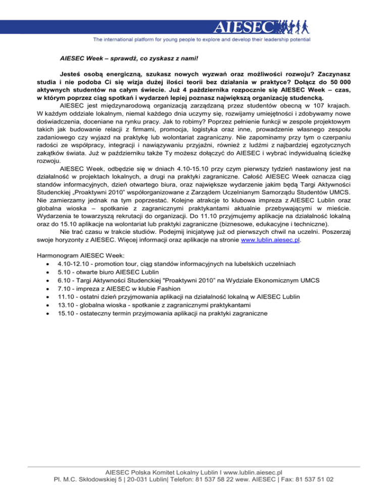 AIESEC Week – sprawdź, co zyskasz z nami! Jesteś osobą energiczną, szukasz nowych wyzwań oraz możliwości rozwoju? Zaczynasz studia i nie podoba Ci się wizja dużej ilości teorii bez działania w praktyce? Dołącz do 50 000 aktywnych studentów na całym świecie. Już 4 października rozpocznie się AIESEC Week – czas, w którym poprzez ciąg spotkań i wydarzeń lepiej poznasz największą organizację studencką. AIESEC jest międzynarodową organizacją zarządzaną przez studentów obecną w 107 krajach. W każdym oddziale lokalnym, niemal każdego dnia uczymy się, rozwijamy umiejętności i zdobywamy nowe doświadczenia, doceniane na rynku pracy. Jak to robimy? Poprzez pełnienie funkcji w zespole projektowym takich jak budowanie relacji z firmami, promocja, logistyka oraz inne, prowadzenie własnego zespołu zadaniowego czy wyjazd na praktykę lub wolontariat zagraniczny. Nie zapominamy przy tym o czerpaniu radości ze współpracy, integracji i nawiązywaniu przyjaźni, również z ludźmi z najbardziej egzotycznych zakątków świata. Już w październiku także Ty możesz dołączyć do AIESEC i wybrać indywidualną ścieżkę rozwoju. AIESEC Week, odbędzie się w dniach 4.10-15.10 przy czym pierwszy tydzień nastawiony jest na działalność w projektach lokalnych, a drugi na praktyki zagraniczne. Całość AIESEC Week oznacza ciąg standów informacyjnych, dzień otwartego biura, oraz największe wydarzenie jakim będą Targi Aktywności Studenckiej „Proaktywni 2010” współorganizowane z Zarządem Uczelnianym Samorządu Studentów UMCS. Nie zamierzamy jednak na tym poprzestać. Kolejne atrakcje to klubowa impreza z AIESEC Lublin oraz globalna wioska – spotkanie z zagranicznymi praktykantami aktualnie przebywającymi w mieście. Wydarzenia te towarzyszą rekrutacji do organizacji. Do 11.10 przyjmujemy aplikacje na działalność lokalną oraz do 15.10 aplikacje na wolontariat lub praktyki zagraniczne (biznesowe, edukacyjne i techniczne). Nie trać czasu w trakcie studiów. Podejmij inicjatywę już od pierwszych chwil na uczelni. Poszerzaj swoje horyzonty z AIESEC. Więcej informacji oraz aplikacje na stronie www.lublin.aiesec.pl. Harmonogram AIESEC Week: 4.10-12.10 - promotion tour, ciąg standów informacyjnych na lubelskich uczelniach 5.10 - otwarte biuro AIESEC Lublin 6.10 - Targi Aktywności Studenckiej "Proaktywni 2010” na Wydziale Ekonomicznym UMCS 7.10 - impreza z AIESEC w klubie Fashion 11.10 - ostatni dzień przyjmowania aplikacji na działalność lokalną w AIESEC Lublin 13.10 - globalna wioska - spotkanie z zagranicznymi praktykantami 15.10 - ostateczny termin przyjmowania aplikacji na praktyki zagraniczne AIESEC Polska Komitet Lokalny Lublin I www.lublin.aiesec.pl Pl. M.C. Skłodowskiej 5 | 20-031 Lublin| Telefon: 81 537 58 22 wew. AIESEC | Fax: 81 537 51 02