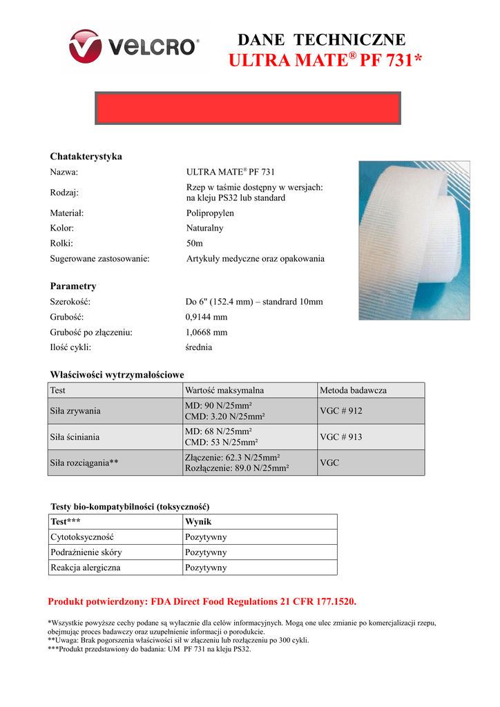 DANE TECHNICZNE ULTRA MATE® PF 731* Chatakterystyka Nazwa: ULTRA MATE® PF 731 Rodzaj: Rzep w taśmie dostępny w wersjach: na kleju PS32 lub standard Materiał: Polipropylen Kolor: Naturalny Rolki: 50m Sugerowane zastosowanie: Artykuły medyczne oraz opakowania Parametry Szerokość: Do 6" (152.4 mm) – standrard 10mm Grubość: 0,9144 mm Grubość po złączeniu: 1,0668 mm Ilość cykli: średnia Właściwości wytrzymałościowe Test Wartość maksymalna Metoda badawcza Siła zrywania MD: 90 N/25mm² CMD: 3.20 N/25mm² VGC # 912 Siła ściniania MD: 68 N/25mm² CMD: 53 N/25mm² VGC # 913 Siła rozciągania** Złączenie: 62.3 N/25mm² Rozłączenie: 89.0 N/25mm² VGC Testy bio-kompatybilności (toksyczność) Test*** Wynik Cytotoksyczność Pozytywny Podrażnienie skóry Pozytywny Reakcja alergiczna Pozytywny Produkt potwierdzony: FDA Direct Food Regulations 21 CFR 177.1520. *Wszystkie powyższe cechy podane są wyłacznie dla celów informacyjnych. Mogą one ulec zmianie po komercjalizacji rzepu, obejmując proces badawczy oraz uzupełnienie informacji o porodukcie. **Uwaga: Brak pogorszenia właściwości sił w złączeniu lub rozłączeniu po 300 cykli. ***Produkt przedstawiony do badania: UM PF 731 na kleju PS32. ULTRA MATE® PF 731 Ve LCRO ® SUPER NOWOCZESNY RZEP ZATRZASKOWY Dostępne w postaci: • Taśmy z klejem PS32 - 10mm • Sztancowanych prostokątów z zaokrąglonymi rogami 10x20mm z klejem PS32 Rzep ULTRA MATE® PF731 to najnowszy produkt zaprojektowany przez firmę VELCRO. Ten nowy system został zaprojektowany tak, aby nie wymagał komponentu. Wystarczy docisnąć dwa kawałki taśmy PF731 i otrzymamy silne połączenie. Jest estetyczny, może mieć wszechstronne zastosowanie, a jego lekka przejrzystość sprawia, iż jest uniwersalny i przyjmuje barwę podłoża. Zastosowanie Właściwości produktu Zalety * Opakowania na artykuły spożywcze: pieczywo, kawa ciastka itp. * Opakowania do tytoniu * Opakowania pokarmów dla zwierząt * Opakowania do kosmetyków * Worki foliowe stomijne * Teczki i segregatory biurowe * I wiele innych ... * Kształt – mikro haczyki * Łagodne przy zamykaniu i otwieraniu * Zamyka się po dociśnięciu * Dostępny na szpulach i rolkach * Grubość: 0,9144mm, po złączeniu 1,0668mm * Pełna kompatybilność biologiczna: nie uczula, nie podrażnia, nie jest toksyczny dla skóry * Ultra płaskie połączenie * Łatwo się zamyka i otwiera * Nie wymaga pętelki * Jest efektywny i estetyczny * Idealny do aplikacji automatycznej i ręcznej