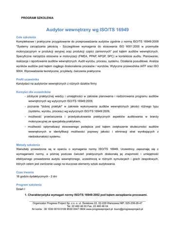 PROGRAM SZKOLENIA Audytor wewnętrzny wg ISO/TS 16949 Cele szkolenia Kompleksowe i praktyczne przygotowanie do przeprowadzania audytów zgodnie z normą ISO/TS 16949:2009 "Systemy zarządzania jakością - Szczegółowe wymagania do stosowania ISO 9001:2000 w przemyśle motoryzacyjnym w produkcji seryjnej oraz produkcji części zamiennych" pod kątem auditów wewnętrznych. Specyficzne narzędzia stosowne w motoryzacji (FMEA, PPAP, APQP, SPC) w kontekście auditu. Planowanie, realizacja i raportowanie auditów wewnętrznych. Audit wyrobu, procesu, systemu. Działania poauditowe. Analiza wyników auditów pod kątem ciągłego doskonalenia procesów / wyrobów. Wytyczne przewodnika IATF oraz ISO 9004. Wprowadzenie teoretyczne, przykłady, ćwiczenia praktyczne. Profil uczestnika Kandydaci na audytorów wewnętrznych z różnych działów firmy Korzyści dla uczestników - zdobycie praktycznej wiedzy i umiejętności w zakresie planowania i nadzorowania programu auditów wewnętrznych wg wytycznych ISO/TS 16949:2009, - poznanie "dobrej praktyki" w zakresie wykonywania auditów wewnętrznych jakości różnego typu (systemu, wyrobu, procesu) wg wytycznych ISO/TS 16949:2009, - możliwość przećwiczenia i przedyskutowania praktycznych aspektów auditowania w branży motoryzacyjnej ze specjalistą-praktykiem, - możliwość optymalizacji stosowanego podejścia pod kątem zwiększenie skuteczności auditów wewnętrznych w identyfikacji możliwości poprawy jakości i eliminacji strat wynikających z niedoskonałości systemu. Metody szkolenia Warsztaty prowadzone są w oparciu o wymagania normy ISO/TS 16949. Uczestnicy zapoznają się z wymaganiami normy, a później podczas ćwiczeń praktycznych doskonalą jej znajomość i umiejętność efektywnego prowadzenia audytu wewnętrznego, uczestniczą w różnych symulacjach i grach zespołowych, których celem jest zwrócenie uwagi na kluczowe elementy sztuki audytowania. Czas trwania 16 godzin dydaktycznych - 2 dni Program szkolenia Dzień I 1. Charakterystyka wymagań normy ISO/TS 16949:2002 pod kątem zarządzania procesami. _________________________________________________________________________________ Organizator Progress Project Sp. z o. o. ul. Światowa 22, 02-229 Warszawa NIP: 525-238-26-47 Tel. 22 460 46 00 Fax. 22 460 46 04 Nr konta : 36 1030 0019 0109 8530 0047 0604 www.progressproject.pl [email protected] PROGRAM SZKOLENIA 2. Wytyczne przewodnika IATF do normy ISO/TS 169494:2002. 3. Podejście procesowe a wymagania szczególne motoryzacji (MSA, FMEA, PPAP, APQP, SPC) . 4. Charakterystyka ogólna normy ISO/TS 16949. 5. Omówienie zakresu merytorycznego standardu ISO/TS 16949 - zwrócenie uwagi na obszary kluczowe: - wprowadzenie, - zakres, - powołania normatywne, - terminy i definicje, - system zarządzania jakością, - odpowiedzialność kierownictwa, - zarządzanie zasobami, - realizacja wyrobu, - pomiary, analiza i doskonalenie, - załącznik A - Plan kontroli. Dzień II 1. Działania doskonalące wg zasady PDCA - wprowadzenie. 2. Etapy przygotowania się do audytu wewnętrznego w dziale, w którym pracuję (przećwiczenie wszystkich kroków szczegółowych z naciskiem na): - dobre przygotowanie się do audytu, - przebieg audytu, - raport po audycie, - działania naprawcze po audycie. 3. Niezgodności duże i małe - umiejętność ich klasyfikowania i ich prawidłowego opisywania. Harmonogram Harmonogram Rejestracja uczestników Zajęcia Przerwa Zajęcia Obiad Zajęcia Przerwa Zajęcia Dzień 1 9:45 - 10:00 10:00 - 11:00 11:00 - 11:15 11:15 - 13:00 13:00 - 13:45 13:45 - 15:00 15:00 - 15:10 15:10 - 17:00 Dzień 2 9:00 - 11:00 11:00 - 11:15 11:15 - 13:00 13:00 - 13:45 13:45 - 15:00 15:00 - 15:10 15:10 - 16:00 Koszt inwestycji _________________________________________________________________________________ Organizator Progress Project Sp. z o. o. ul. Światowa 22, 02-229 Warszawa NIP: 525-238-26-47 Tel. 22 460 46 00 Fax. 22 460 46 04 Nr konta : 36 1030 0019 0109 8530 0047 0604 www.progressproject.pl [email protected] PROGRAM SZKOLENIA W celu poznania szczegółów, zapraszamy do kontaktu. Informacje dodatkowe W przypadku zainteresowania jednym szkoleniem większej liczby osób (powyżej 3-4) z jednej firmy jesteśmy w stanie zorganizować dodatkowe terminy w dogodnej lokalizacji przy założeniu, że szkolenie będzie zaplanowane z co najmniej półtora miesięcznym wyprzedzeniem. Każdy temat możemy również przygotować według Państwa wymagań oraz potrzeb firmy w formie szkolenia dedykowanego, wyjazdu integracyjnego lub doradztwa. Zapraszamy do kontaktu, Progress Project sp. z o.o. ul. Światowa 22 02-229 Warszawa Tel. 22 460 46 00 Fax. 22 460 46 04 e-mail: [email protected] www.progressproject.pl _________________________________________________________________________________ Organizator Progress Project Sp. z o. o. ul. Światowa 22, 02-229 Warszawa NIP: 525-238-26-47 Tel. 22 460 46 00 Fax. 22 460 46 04 Nr konta : 36 1030 0019 0109 8530 0047 0604 www.progressproject.pl [email protected]