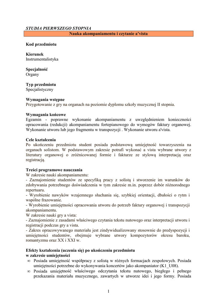 STUDIA PIERWSZEGO STOPNIA Nauka akompaniamentu i czytanie a’vista Kod przedmiotu Kierunek Instrumentalistyka Specjalność Organy Typ przedmiotu Specjalistyczny Wymagania wstępne Przygotowanie z gry na organach na poziomie dyplomu szkoły muzycznej II stopnia. Wymagania końcowe Egzamin - poprawne wykonanie akompaniamentu z uwzględnieniem konieczności opracowania (redukcji) akompaniamentu fortepianowego do wymogów faktury organowej. Wykonanie utworu lub jego fragmentu w transpozycji . Wykonanie utworu a'vista. Cele kształcenia Po ukończeniu przedmiotu student posiada podstawową umiejętność towarzyszenia na organach solistom. W podstawowym zakresie potrafi wykonać a vista wybrane utwory z literatury organowej o zróżnicowanej formie i fakturze ze stylową interpretacją oraz registracją. Treści programowe nauczania W zakresie nauki akompaniamentu: - Zaznajomienie studentów ze specyfiką pracy z solistą i stworzenie im warunków do zdobywania potrzebnego doświadczenia w tym zakresie m.in. poprzez dobór różnorodnego repertuaru. - Wyrobienie nawyków wzajemnego słuchania się, szybkiej orientacji, dbałości o rytm i wspólne frazowanie. - Wyrobienie umiejętności opracowania utworu do potrzeb faktury organowej i transpozycji akompaniamentu. W zakresie nauki gry a vista: - Zaznajomienie z zasadami właściwego czytania tekstu nutowego oraz interpretacji utworu i registracji podczas gry a vista. - Zakres opracowywanego materiału jest zindywidualizowany stosownie do predyspozycji i umiejętności studentów, obejmuje wybrane utwory kompozytorów okresu baroku, romantyzmu oraz XX i XXI w. Efekty kształcenia (uczenia się) po ukończeniu przedmiotu w zakresie umiejętności • Posiada umiejętność współpracy z solistą w różnych formacjach zespołowych. Posiada umiejętności potrzebne do wykonywania koncertów jako akompaniator (K1_U08). • Posiada umiejętność właściwego odczytania tekstu nutowego, biegłego i pełnego przekazania materiału muzycznego, zawartych w utworze idei i jego formy. Posiada 1 • umiejętności ułatwiające opracowanie danego akompaniamentu i dostosowanie do faktury organowej (K1_U09). Posiada umiejętność rozumienia i kontrolowania struktur rytmicznych, metrorytmicznych, aspektów dotyczących aplikatury, pedalizacji, frazowania, struktury harmonicznej itp. opracowywanych utworów (K1_U13). Metody nauczania Ćwiczenia, praca z ilustratorem (solistą). Nakład pracy studenta potrzebny do osiągnięcia efektów uczenia się ROK SEMESTR I 1 Punkty ECTS Ilość godzin w semestrze Rodzaj zaliczenia LEGENDA II 2 3 III 4 5 6 1 15 egz zal – zaliczony; zs – zaliczenie ze stopniem; egz – egzamin; ed – egzamin dyplomowy Kryteria oceny Egzamin: wykonanie dwóch różnorodnych stylistycznie akompaniamentów oraz wykonanie utworu a'vista. Ocena wykonania ze szczególnym uwzględnieniem sprawdzenia umiejętności współdziałania z solistą i umiejętności dostosowania akompaniamentu do faktury organowej (w przypadku korzystania z wyciągów fortepianowych). Poprawność wykonania utworu a` vista z uwzględnieniem odpowiedniej rejestracji, tempa, stylu i zrozumieniem struktury utworu. Zaangażowanie studenta w zakresie realizacji programu. Literatura Umiejętność gry a vista i jej znaczenie w edukacji pianisty, red. H. Dulikowska, Łodzi 2005. Wesołowski F., Basso continuo - teoria i praktyka, Łódź 2006. Język wykładowy Polski, możliwość prowadzenia zajęć w języku niemieckim. Imię i nazwisko wykładowcy mgr Karol Hilla 2