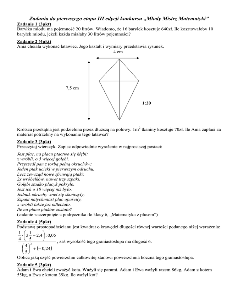 Zadania do pierwszego etapu III edycji konkursu „Młody Mistrz Matematyki” Zadanie 1 (3pkt) Baryłka miodu ma pojemność 20 litrów. Wiadomo, że 16 baryłek kosztuje 640zł. Ile kosztowałoby 10 baryłek miodu, jeżeli każda miałaby 30 litrów pojemności? Zadanie 2 (4pkt) Ania chciała wykonać latawiec. Jego kształt i wymiary przedstawia rysunek. 4 cm 7,5 cm 1:20 Krótsza przekątna jest podzielona przez dłuższą na połowy. 1m2 tkaniny kosztuje 70zł. Ile Ania zapłaci za materiał potrzebny na wykonanie tego latawca? Zadanie 3 (3pkt) Przeczytaj wierszyk. Zapisz odpowiednie wyrażenie w najprostszej postaci: Jest plac, na placu ptactwo się kłębi: x wróbli, o 5 więcej gołębi. Przyszedł pan z torbą pełną okruchów; Jeden ptak uciekł w pierwszym odruchu, Lecz zewsząd nowe sfruwają ptaki: 2x wróbelków, nawet trzy szpaki. Gołębi stadko placyk pokryło, Jest ich o 10 więcej niż było. Jednak okruchy wnet się skończyły; Szpaki natychmiast plac opuściły, x wróbli także już odleciało. Ile na placu ptaków zostało? (zadanie zaczerpnięte z podręcznika do klasy 6, „Matematyka z plusem”) Zadanie 4 (5pkt) Podstawą prostopadłościanu jest kwadrat o krawędzi długości równej wartości podanego niżej wyrażenia: 1 1 3 2,4 : 0,05 4 5 , zaś wysokość tego graniastosłupa ma długość 6. 2 4 0,24 5 Oblicz jaką część powierzchni całkowitej stanowi powierzchnia boczna tego graniastosłupa. Zadanie 5 (3pkt) Adam i Ewa chcieli zważyć kota. Ważyli się parami. Adam i Ewa ważyli razem 86kg, Adam z kotem 55kg, a Ewa z kotem 39kg. Ile ważył kot?