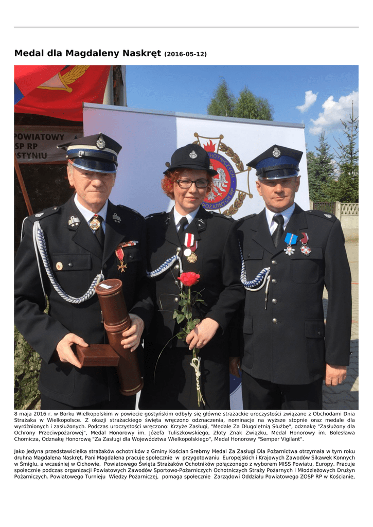 Medal dla Magdaleny Naskręt (2016-05-12) 8 maja 2016 r. w Borku Wielkopolskim w powiecie gostyńskim odbyły się główne strażackie uroczystości związane z Obchodami Dnia Strażaka w Wielkopolsce. Z okazji strażackiego święta wręczono odznaczenia, nominacje na wyższe stopnie oraz medale dla wyróżnionych i zasłużonych. Podczas uroczystości wręczono: Krzyże Zasługi, "Medale Za Długoletnią Służbę", odznakę "Zasłużony dla Ochrony Przeciwpożarowej", Medal Honorowy im. Józefa Tuliszkowskiego, Złoty Znak Związku, Medal Honorowy im. Bolesława Chomicza, Odznakę Honorową "Za Zasługi dla Województwa Wielkopolskiego", Medal Honorowy "Semper Vigilant". Jako jedyna przedstawicielka strażaków ochotników z Gminy Kościan Srebrny Medal Za Zasługi Dla Pożarnictwa otrzymała w tym roku druhna Magdalena Naskręt. Pani Magdalena pracuje społecznie w przygotowaniu Europejskich i Krajowych Zawodów Sikawek Konnych w Śmiglu, a wcześniej w Cichowie, Powiatowego Święta Strażaków Ochotników połączonego z wyborem MISS Powiatu, Europy. Pracuje społecznie podczas organizacji Powiatowych Zawodów Sportowo-Pożarniczych Ochotniczych Straży Pożarnych i Młodzieżowych Drużyn Pożarniczych. Powiatowego Turnieju Wiedzy Pożarniczej, pomaga społecznie Zarządowi Oddziału Powiatowego ZOSP RP w Kościanie, aktywnie pomaga w przygotowaniu Jubileuszy OSP na terenie powiatu. Druhna jest członkinią OSP Turew gdzie pełni funkcję kronikarza. Posiada przeszkolenie podstawowe Strażaka Ochotnika, kwalifikacje ratownika medycznego. Wykonuje zdjęcia i zamieszcza tekst z organizowanych imprez na terenie powiatu kościańskiego. Przygotowuje zaproszenia na imprezy Gminne i powiatowe dotyczące Jubileuszy OSP, Święta Powiatowego OSP, Zjazdów Zwyczajnych Zarzadu Oddziału Gminnego ZOSP RP, Powiatowego ZOSP RP, Zawody Sportowo-Pożarnicze na szczeblu Gminnym i Powiatowym, Europejskie i Krajowe Zawody Sikawek Konnych itp. Pracę tą wykonuje społecznie. Pani Magdalena również społecznie udziela się w Zarządzie Gminnym ZOSP RP w Kościanie wykonując szereg prac oraz również społecznie wykonuje zdjęcia i zamieszcza artykuły wszystkich imprez strażackich na terenie gminy i powiatu na stronach internetowych gmin, Związku. Druhna Magdalena Naskręt w marcu 2012 r. otrzymała Brązowy Krzyż Zasługi przyznawany przez Prezydenta RP. Powered by TCPDF (www.tcpdf.org)