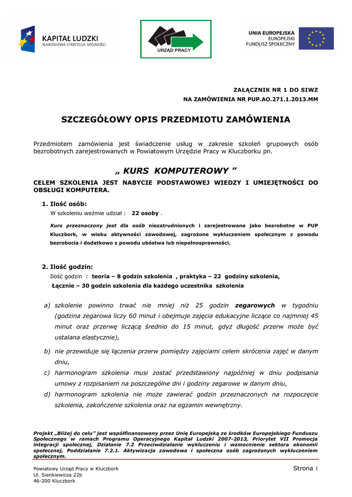 ZAŁĄCZNIK NR 1 DO SIWZ NA ZAMÓWIENIA NR PUP.AO.271.1.2013.MM SZCZEGÓŁOWY OPIS PRZEDMIOTU ZAMÓWIENIA Przedmiotem zamówienia jest świadczenie usług w zakresie szkoleń grupowych osób bezrobotnych zarejestrowanych w Powiatowym Urzędzie Pracy w Kluczborku pn. „ KURS KOMPUTEROWY ” CELEM SZKOLENIA JEST NABYCIE PODSTAWOWEJ WIEDZY I UMIEJĘTNOŚCI DO OBSŁUGI KOMPUTERA. 1. Ilość osób: W szkoleniu weźmie udział : 22 osoby . Kurs przeznaczony jest dla osób niezatrudnionych i zarejestrowane jako bezrobotne w PUP Kluczbork, w wieku aktywności zawodowej, zagrożone wykluczeniem społecznym z powodu bezrobocia i dodatkowo z powodu ubóstwa lub niepełnosprawności. 2. Ilość godzin: Ilość godzin : teoria – 8 godzin szkolenia , praktyka – 22 godziny szkolenia, Łącznie – 30 godzin szkolenia dla każdego uczestnika szkolenia a) szkolenie powinno trwać nie mniej niż 25 godzin zegarowych w tygodniu (godzina zegarowa liczy 60 minut i obejmuje zajęcia edukacyjne liczące co najmniej 45 minut oraz przerwę liczącą średnio do 15 minut, gdyż długość przerw może być ustalana elastycznie), b) nie przewiduje się łączenia przerw pomiędzy zajęciami celem skrócenia zajęć w danym dniu, c) harmonogram szkolenia musi zostać przedstawiony najpóźniej w dniu podpisania umowy z rozpisaniem na poszczególne dni i godziny zegarowe w danym dniu, d) harmonogram szkolenia nie może zawierać godzin przeznaczonych na rozpoczęcie szkolenia, zakończenie szkolenia oraz na egzamin wewnętrzny. Projekt „Bliżej do celu” jest współfinansowany przez Unię Europejską ze środków Europejskiego Funduszu Społecznego w ramach Programu Operacyjnego Kapitał Ludzki 2007-2013, Priorytet VII Promocja integracji społecznej, Działanie 7.2 Przeciwdziałanie wykluczeniu i wzmocnienie sektora ekonomii społecznej, Poddziałanie 7.2.1. Aktywizacja zawodowa i społeczna osób zagrożonych wykluczeniem społecznym. Powiatowy Urząd Pracy w Kluczbork Ul. Sienkiewicza 22b 46-200 Kluczbork Strona 1 3. W ramach kursu Wykonawca zobowiązany jest do: e) zapewnienia uczestnikom kursu stanowisk pracy wyposażonych w niezbędne akcesoria konieczne do przeprowadzenia zajęć praktycznych, f) ubezpieczenia od następstw nieszczęśliwych wypadków uczestników szkolenia, g) zorganizowanie i przeprowadzenie egzaminu wewnętrznego teoretycznego i praktycznego Ø koszt egzaminu wewnętrznego wliczony w koszt kursu d) Wydania uczestnikom szkolenia odpowiednich zaświadczeń określonych w § 18 ust. 2 (Załącznik 5) rozporządzenia Ministra Edukacji Narodowej z dnia 11.01.2012r. w sprawie kształcenia ustawicznego w formach pozaszkolnych oraz dołączenia do nich suplementów zawierających następujące informacje : 1/ okres trwania szkolenia, 2/ tematy i wymiar godzin zajęć edukacyjnych oraz numer z rejestru zaświadczenia, do którego suplement jest dodatkiem, wraz z podpisem osoby upoważnionej przez instytucje szkoleniową przeprowadzającą szkolenie. 4. Termin realizacji. Szkolenie ma być zrealizowane w kwietniu 2013r. lub rozpocząć ma się w kwietniu 2013r. · zajęcia muszą odbywać się od poniedziałku do piątku, nie więcej niż 8 godzin dziennie 5. Miejsce szkolenia. Ø Teoria – Kluczbork, Ø praktyka – Kluczbork, 6. Program szkolenia. Wymagany minimalny program szkolenia: 1) Poznanie podstawowych zasad działania i budowy komputera a) Budowa komputera – komponenty wewnętrzne. b) Budowa komputera – komponenty zewnętrzne. c) Urządzenia wejściowe – budowa i podstawowe działanie. d) Urządzenia wyjściowe – budowa i podstawowe działanie 2) Podstawy obsługi systemu operacyjnego Windows a) Interface systemu operacyjnego – budowa, zastosowanie, działanie b) Zasady działania i podstawowe operacje na plikach i katalogach. c) Korzystanie z pulpitu, ikon, itp. d) Wyszukiwanie plików, katalogów, itp. w komputerze, e) Notatnik, przeglądarka obrazów, Windows Media player – podstawowe działanie,. f) Konfiguracja systemu z poziomu panelu sterowania, g) Instalacja oprogramowania, Projekt „Bliżej do celu” jest współfinansowany przez Unię Europejską ze środków Europejskiego Funduszu Społecznego w ramach Programu Operacyjnego Kapitał Ludzki 2007-2013, Priorytet VII Promocja integracji społecznej, Działanie 7.2 Przeciwdziałanie wykluczeniu i wzmocnienie sektora ekonomii społecznej, Poddziałanie 7.2.1. Aktywizacja zawodowa i społeczna osób zagrożonych wykluczeniem społecznym. Powiatowy Urząd Pracy w Kluczbork Ul. Sienkiewicza 22b 46-200 Kluczbork Strona 2 h) Korzystanie z zewnętrznych nośników danych – płyt CD/DVD, pendrive oraz innych nośników typu Flash, dyskietki. 3) Obsługa edytora tekstów MS WORD a) Tworzenie i formatowanie tekstu b) Operacje na dokumencie c) Wklejanie obrazów d) Tworzenie i formatowanie tabeli e) Zarządzanie wydrukami f) Sprawdzanie pisowni i gramatyki 4) Obsługa arkusza kalkulacyjnego MS Excel a) Tworzenie tabel z danymi b) Zaawansowane wprowadzanie danych c) Tworzenie i edycja formuł d) Tworzenie i edycja wykresów danych e) Tworzenie dokumentów korespondencji seryjnej 5) Obsługa urządzeń a) urządzeń drukujących b) urządzeń skanujących 6) Obsługa Internetu i poczty elektronicznej a) Zagadnienia dotyczące Internetu i poczty elektronicznej b) Wyszukiwanie informacji w Internecie - zwykłe i zaawansowane c) Założenie konta E-mail d) Obsługa skrzynki pocztowej poprzez WWW e) Obsługa skrzynki pocztowej poprzez program pocztowy (Outlook Express). 7. Wykaz niezbędnych środków i materiałów dydaktycznych: a) stanowisko komputerowe dla każdego uczestnika szkolenia, b) rzutnik multimedialny, c) ekran, tablica kredo, d) urządzenie wielofunkcyjne, e) skrypt dla każdego uczestnika szkolenia, zawierający najważniejsze informacje omawiane na szkoleniu, f) materiały biurowe dla każdego uczestnika szkolenia (teczka na materiały szkoleniowe, pendrive , długopis, zeszyt), g) 22 szt. podręczników zg